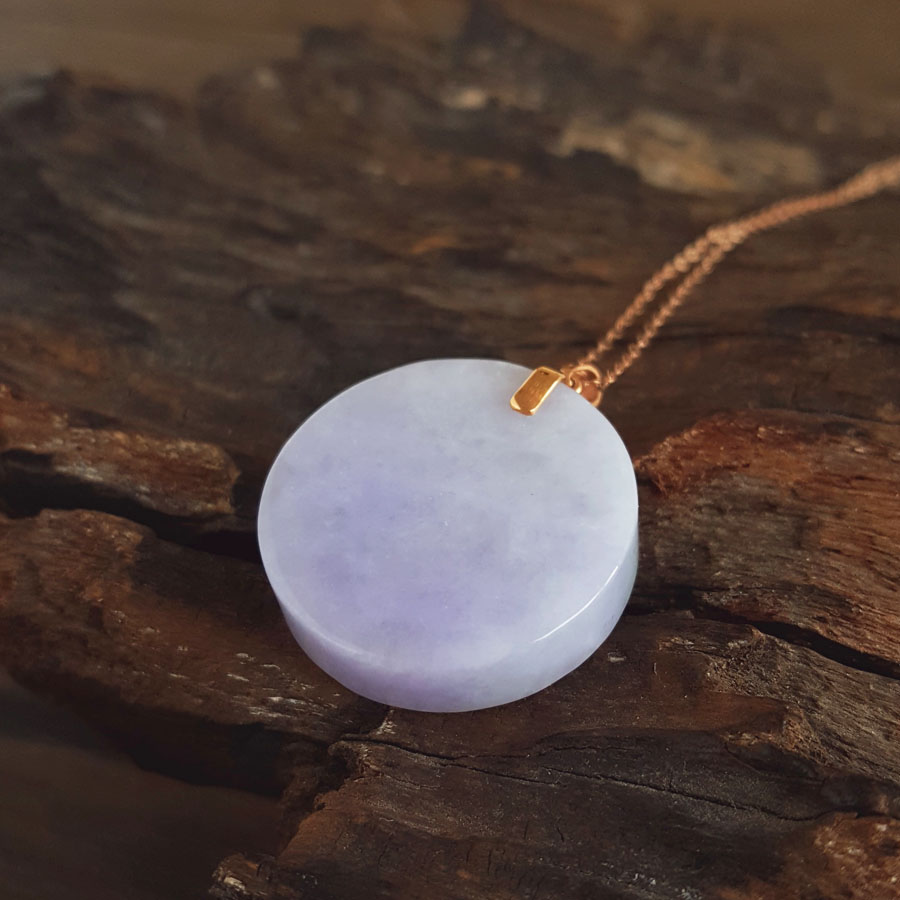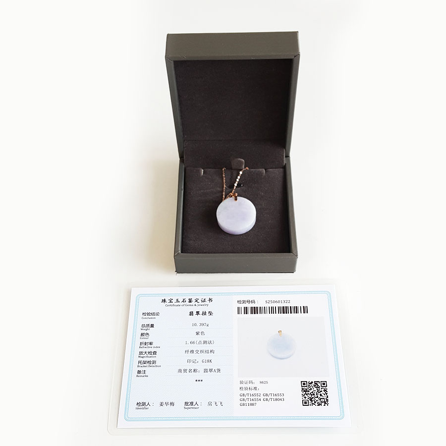 名称 | AU750玫瑰金镶天然糯种圆牌平安扣紫罗兰翡翠吊坠项链 |