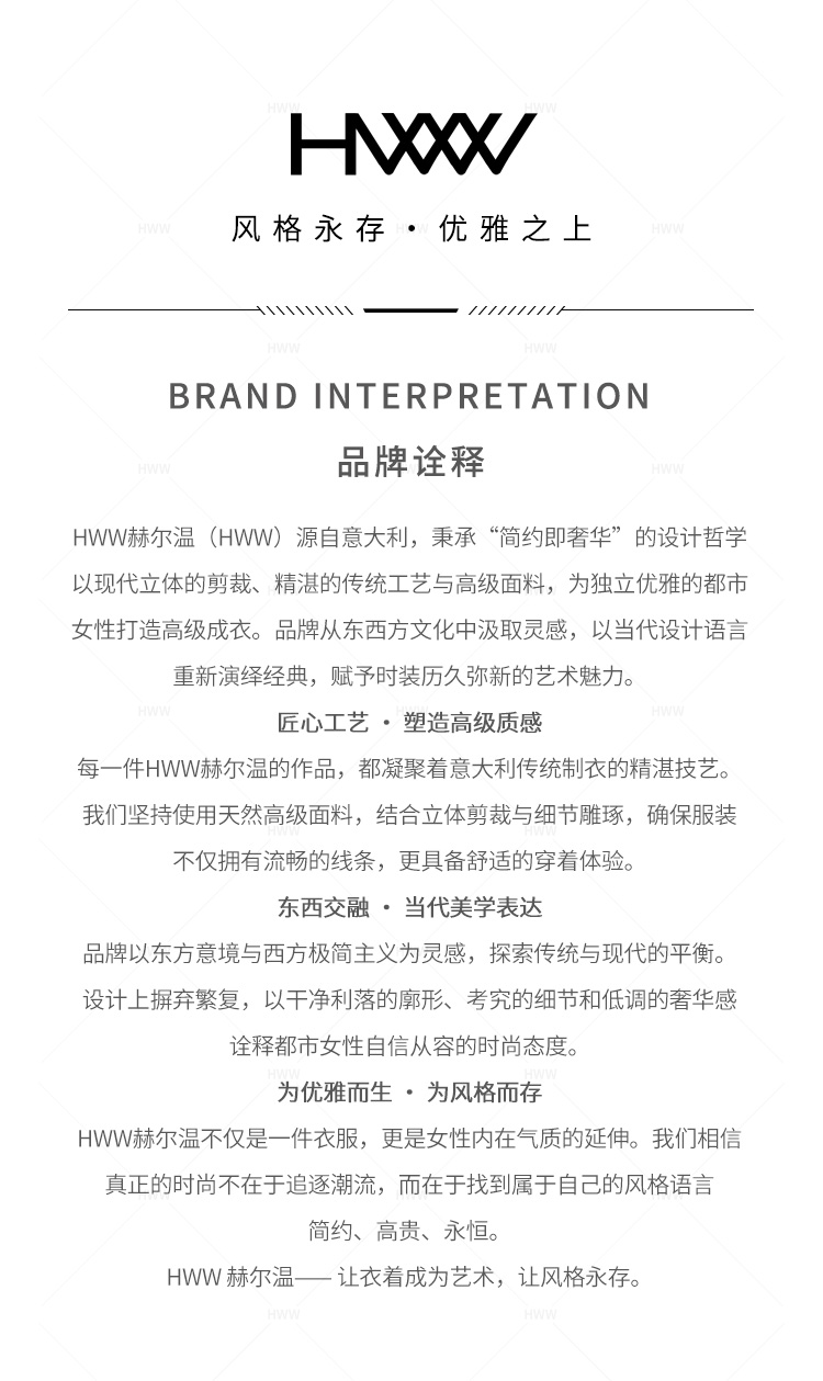 - HWW赫尔温,源于“时尚之都”意大利米兰,是一个时尚简洁、崇尚高贵、讲究质感的意大利奢侈女装品牌。