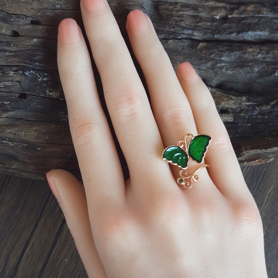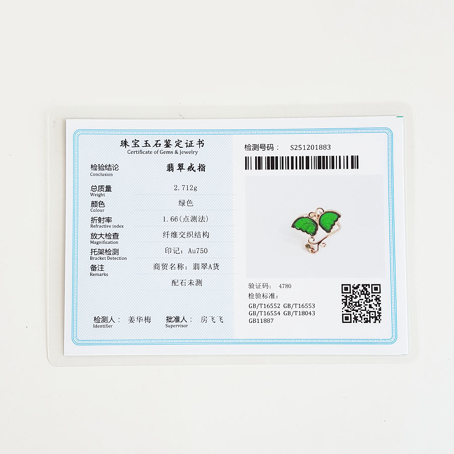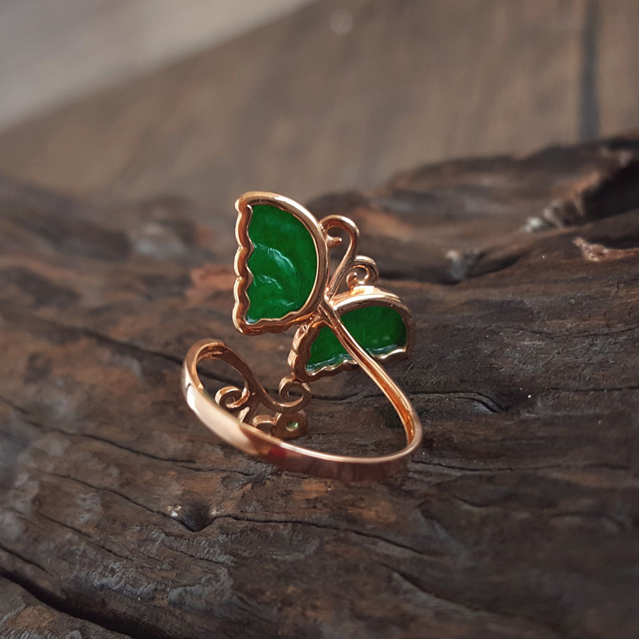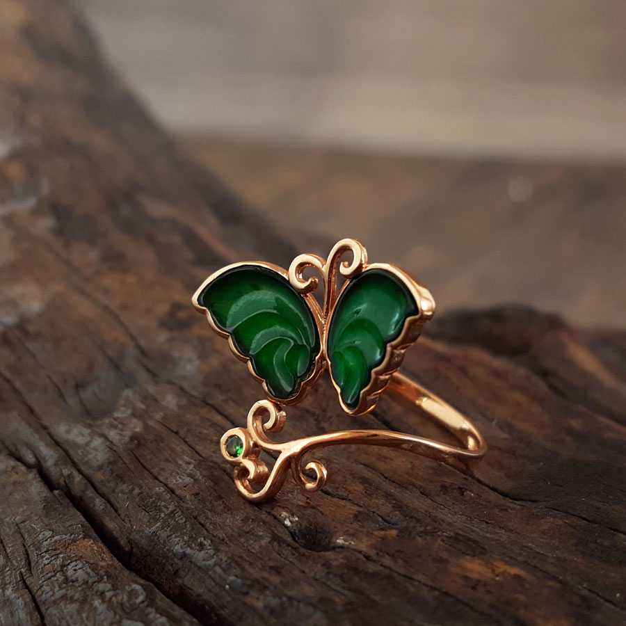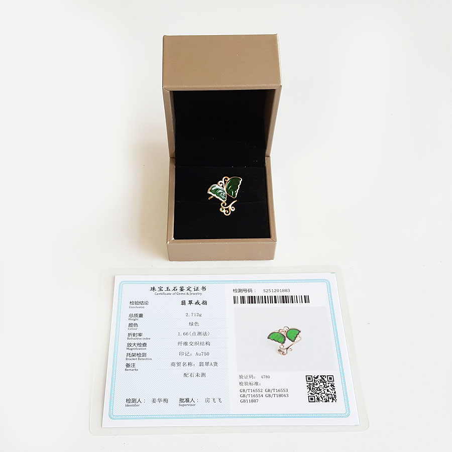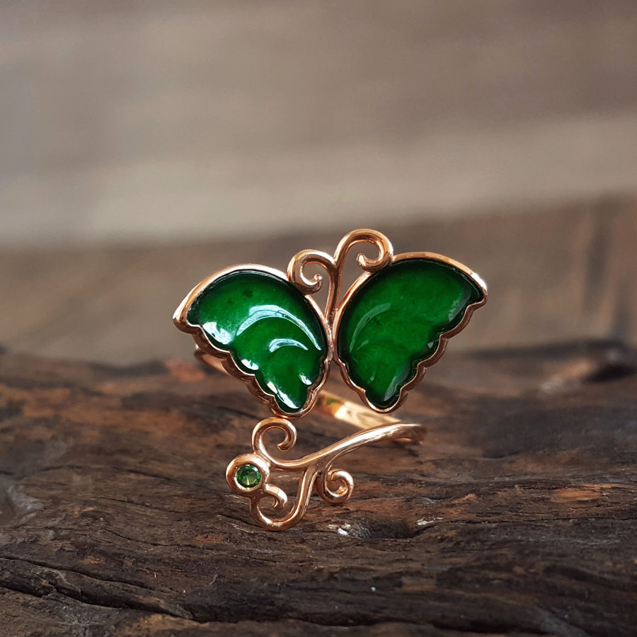 名称 | AU750玫瑰金镶天然细腻设计师款满绿冰种蝴蝶造型翡翠开口戒指 |