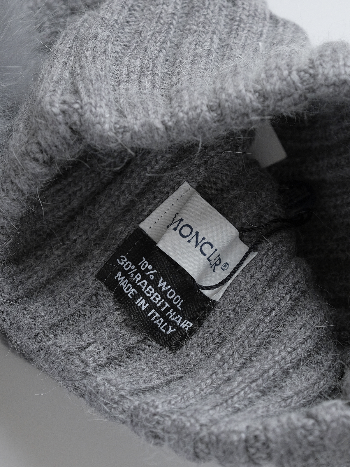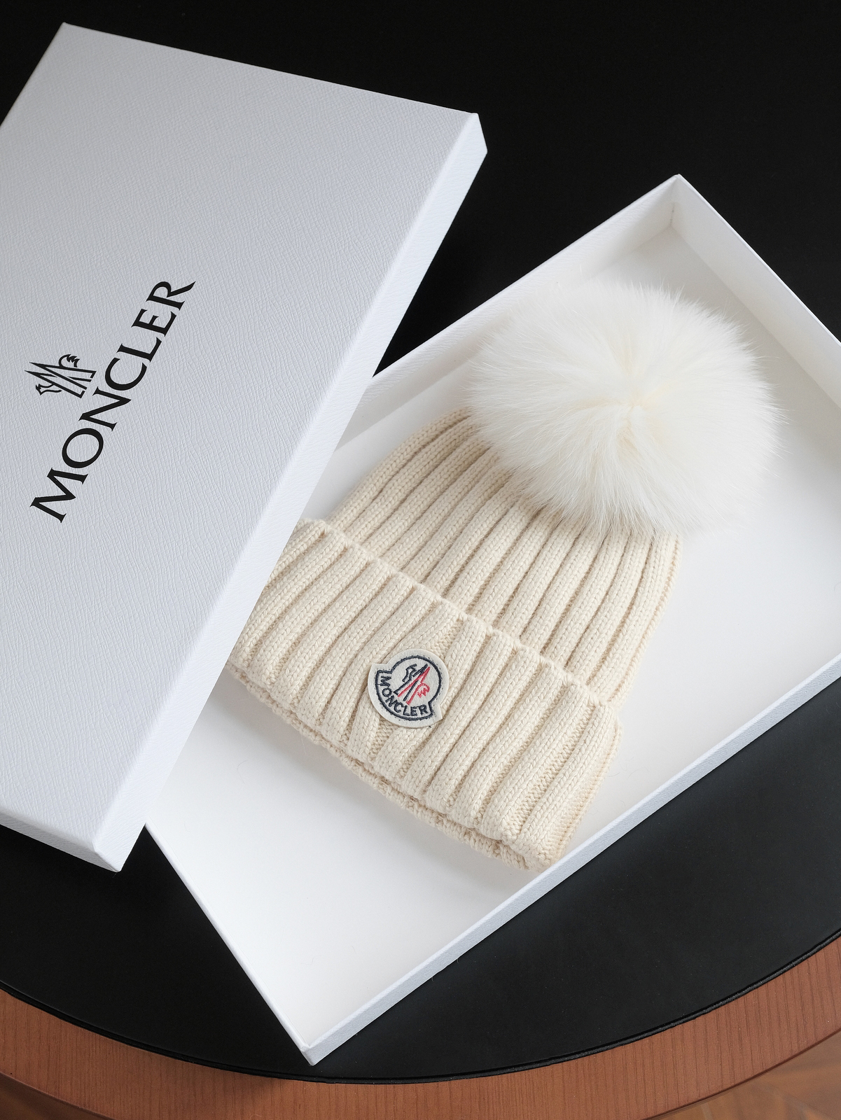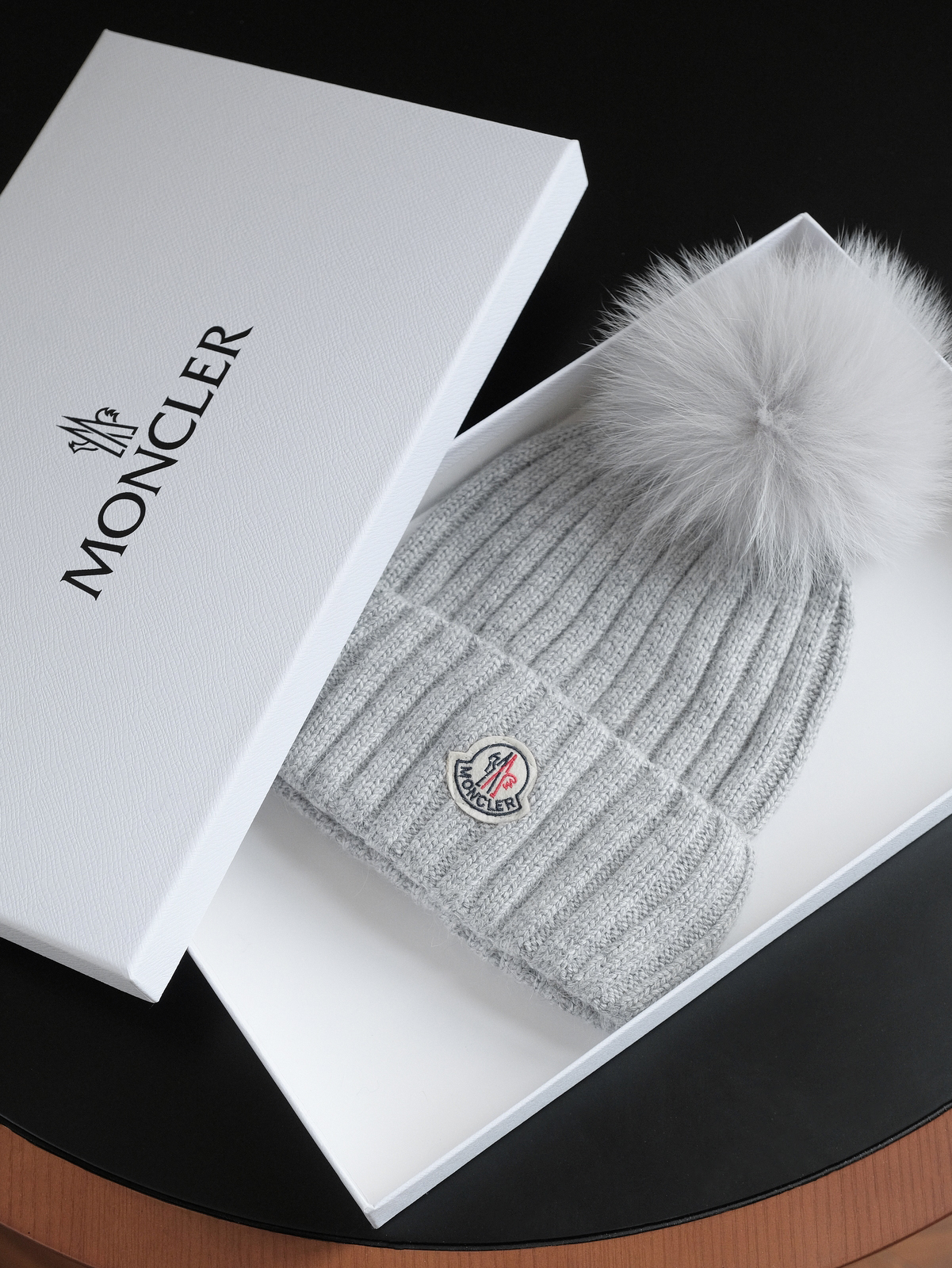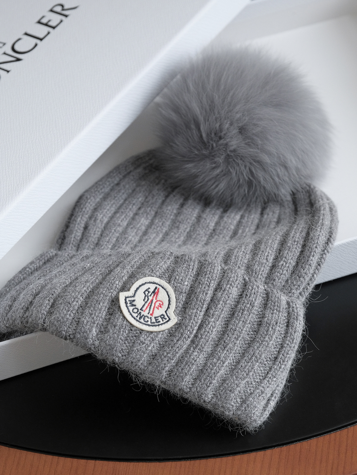 标志性的Moncler圆形徽章精致醒目,彰显品牌身份与卓越品质。帽顶那一大颗毛茸茸的灰色毛球, 为整体造型增添了一抹俏皮与可爱,在严肃中又透出几分灵动,打破单调。