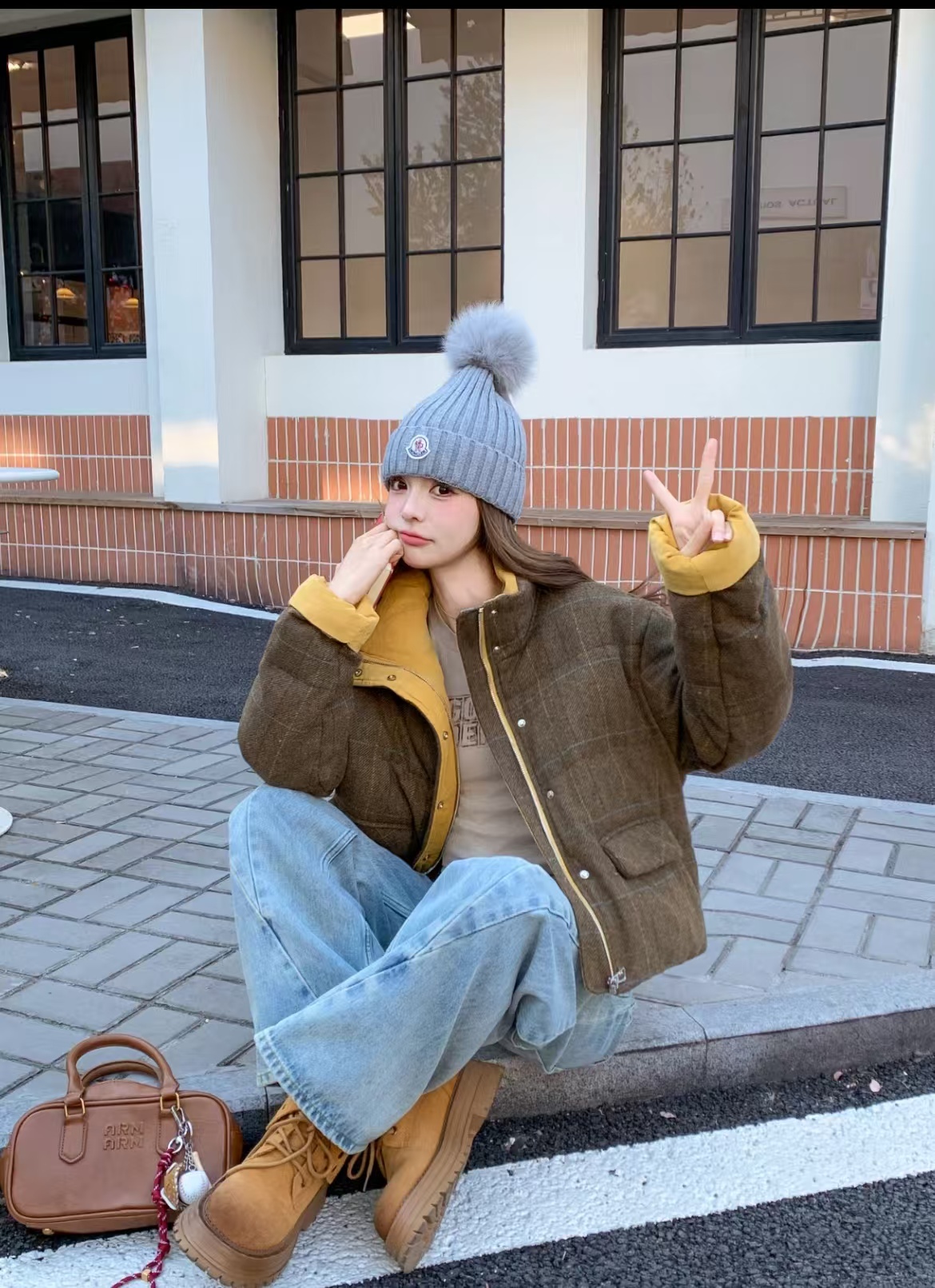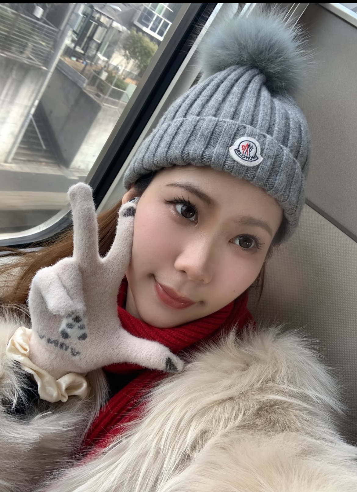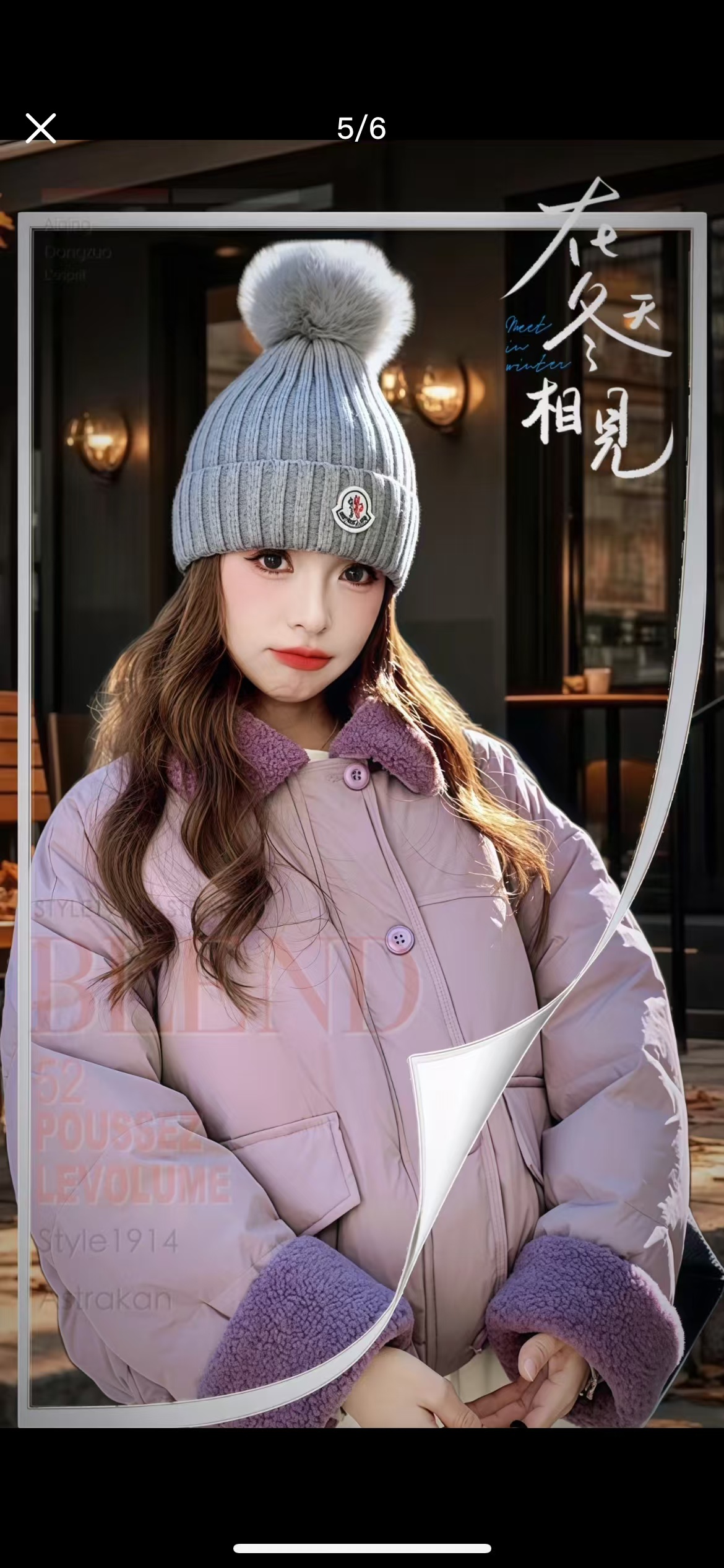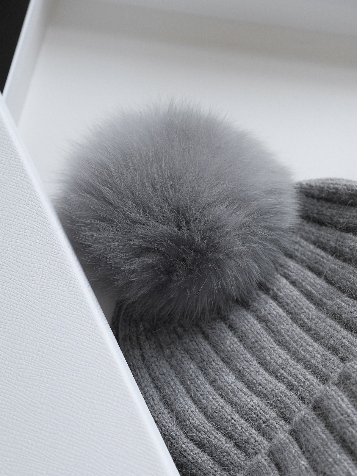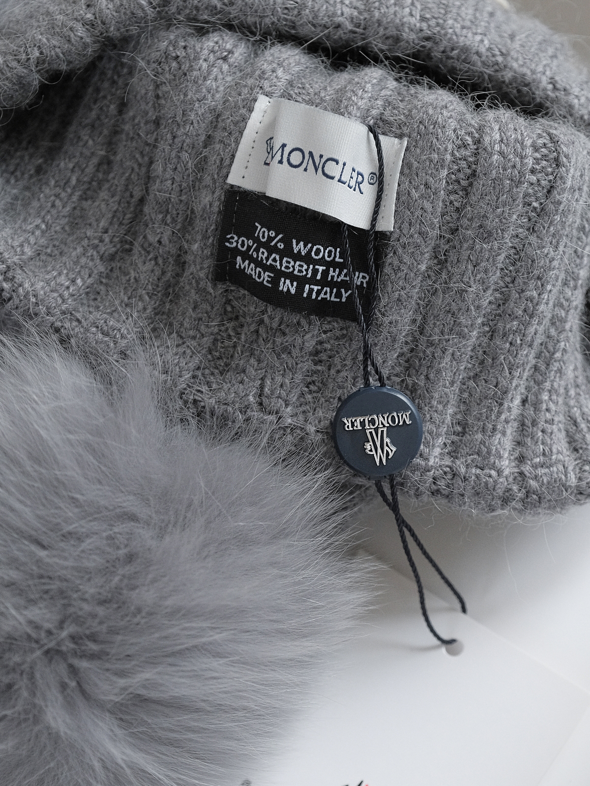 标志性的Moncler圆形徽章精致醒目,彰显品牌身份与卓越品质。帽顶那一大颗毛茸茸的灰色毛球, 为整体造型增添了一抹俏皮与可爱,在严肃中又透出几分灵动,打破单调。