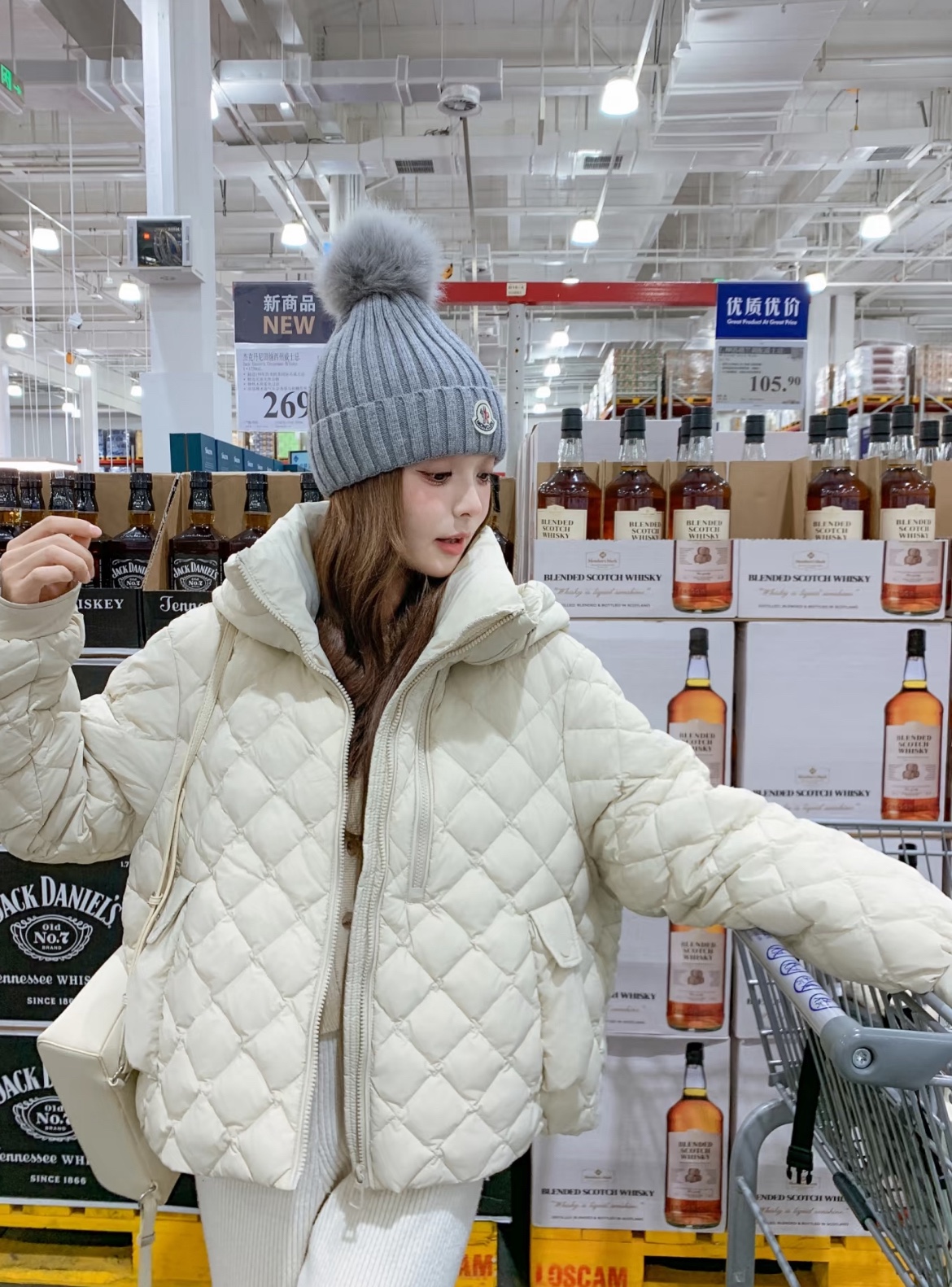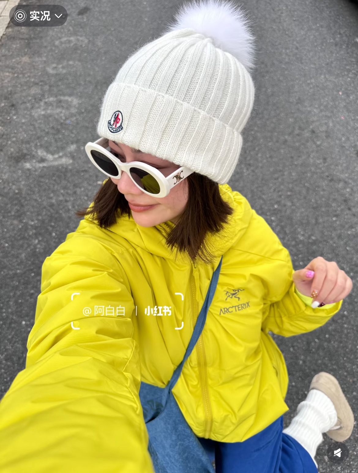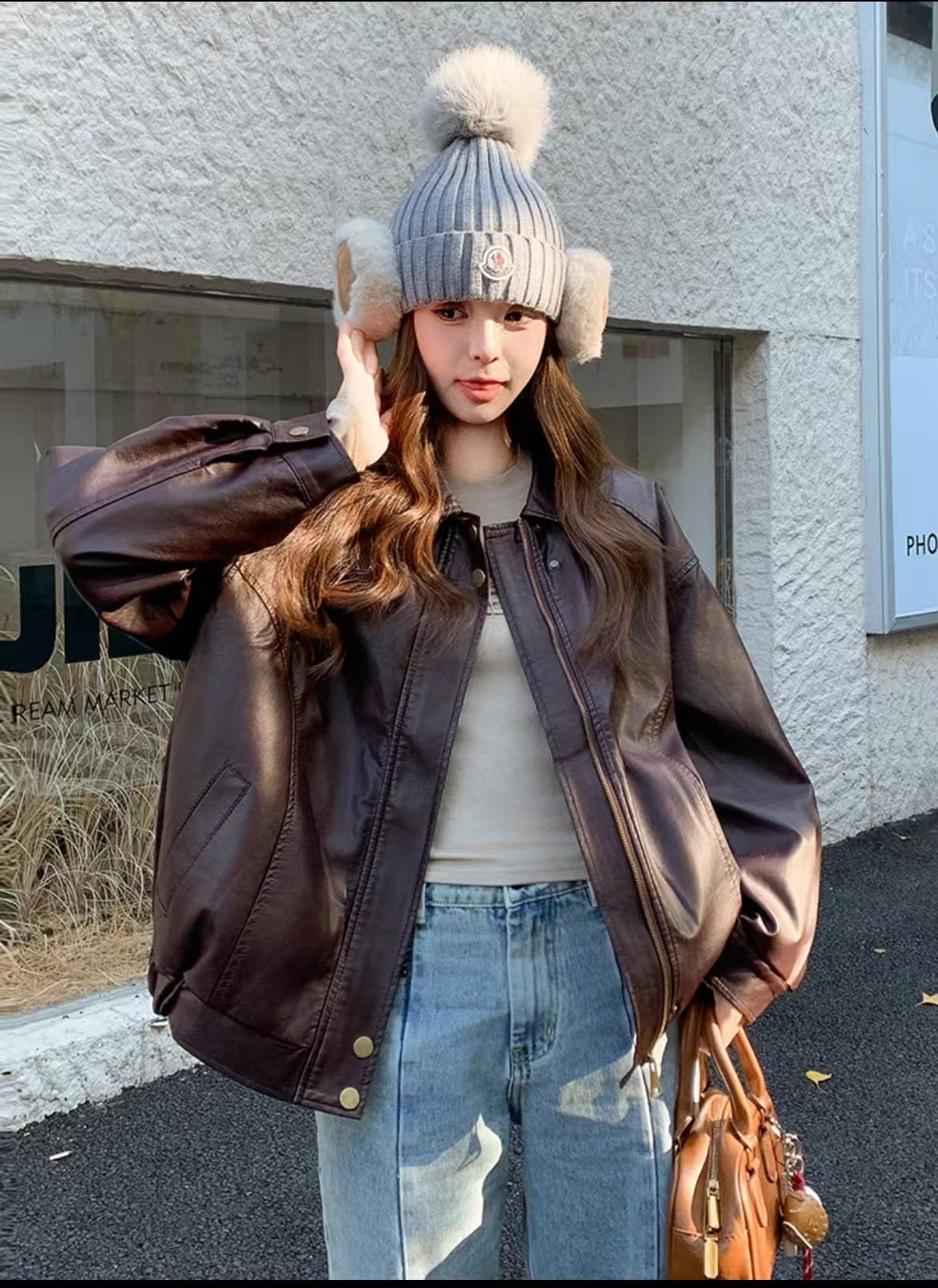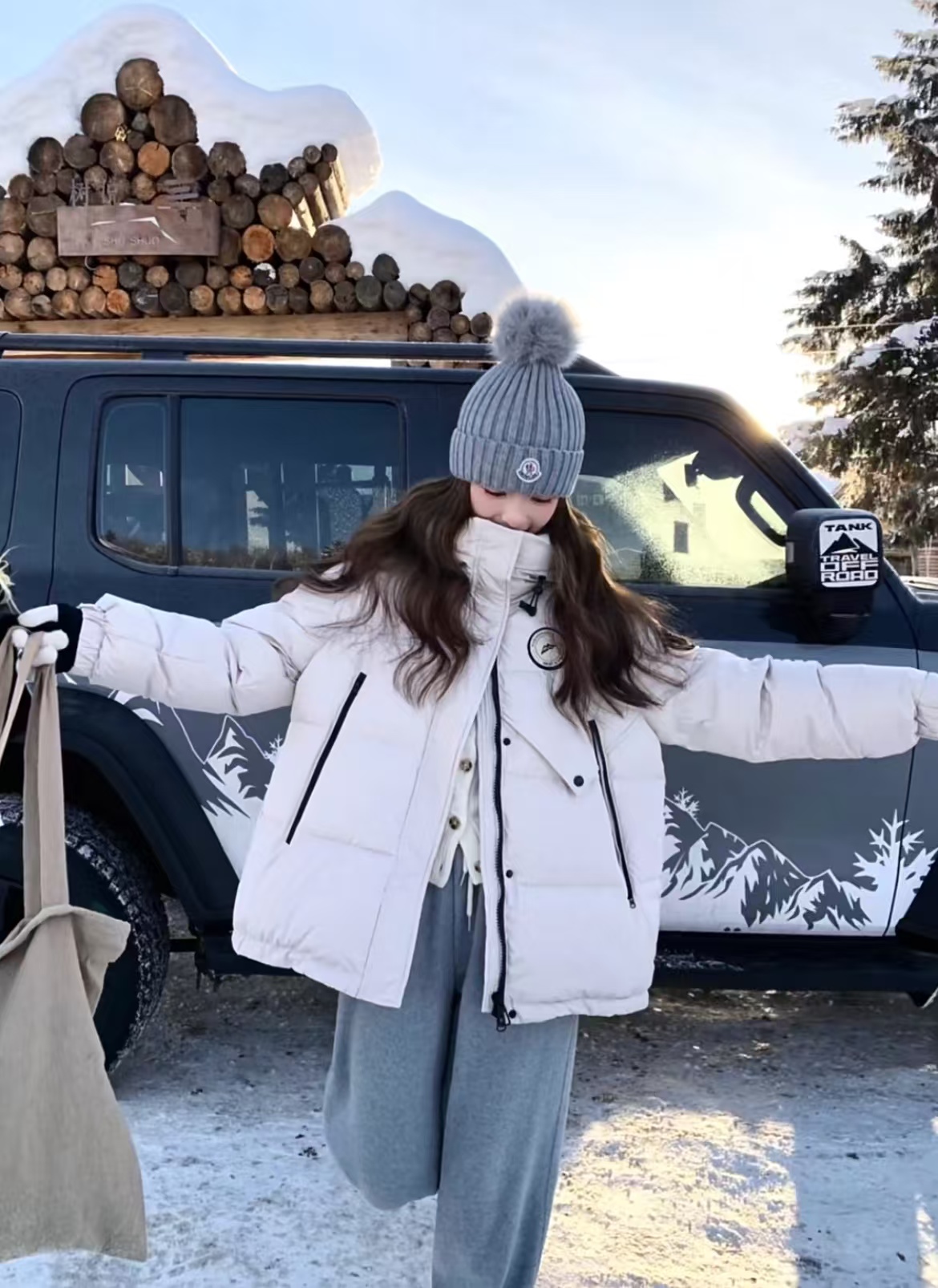 标志性的Moncler圆形徽章精致醒目,彰显品牌身份与卓越品质。帽顶那一大颗毛茸茸的灰色毛球, 为整体造型增添了一抹俏皮与可爱,在严肃中又透出几分灵动,打破单调。