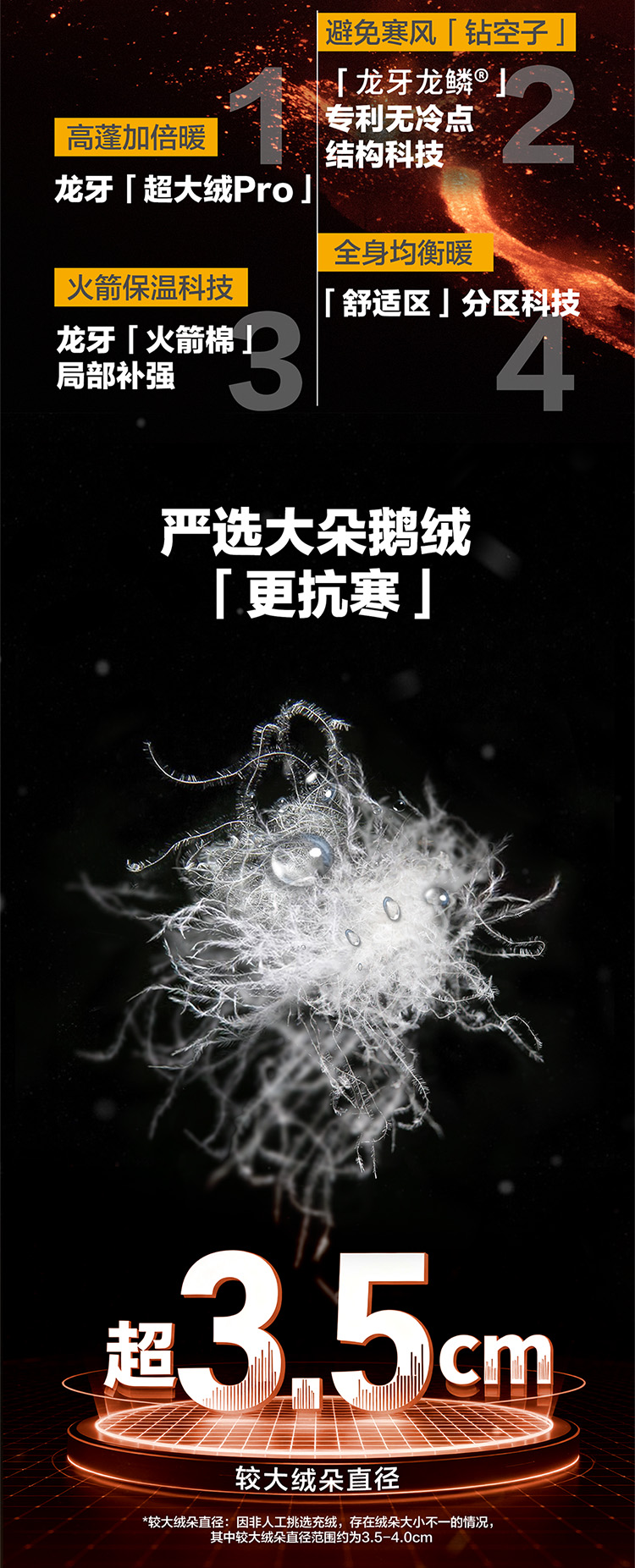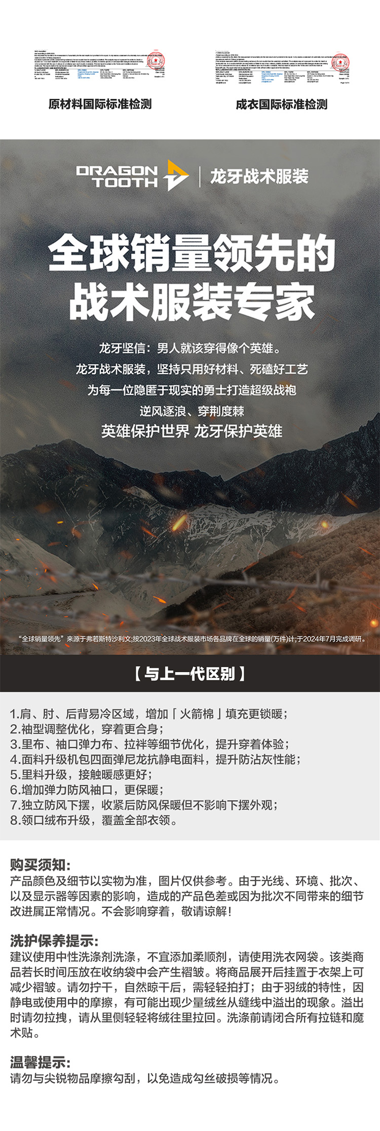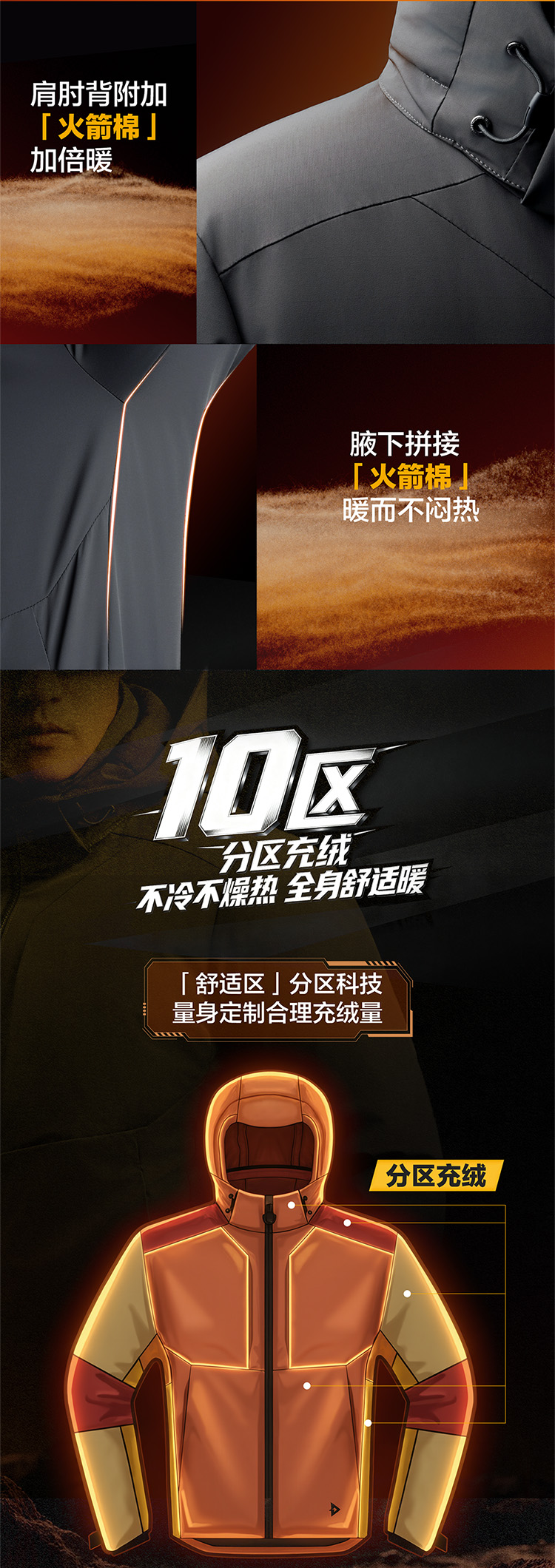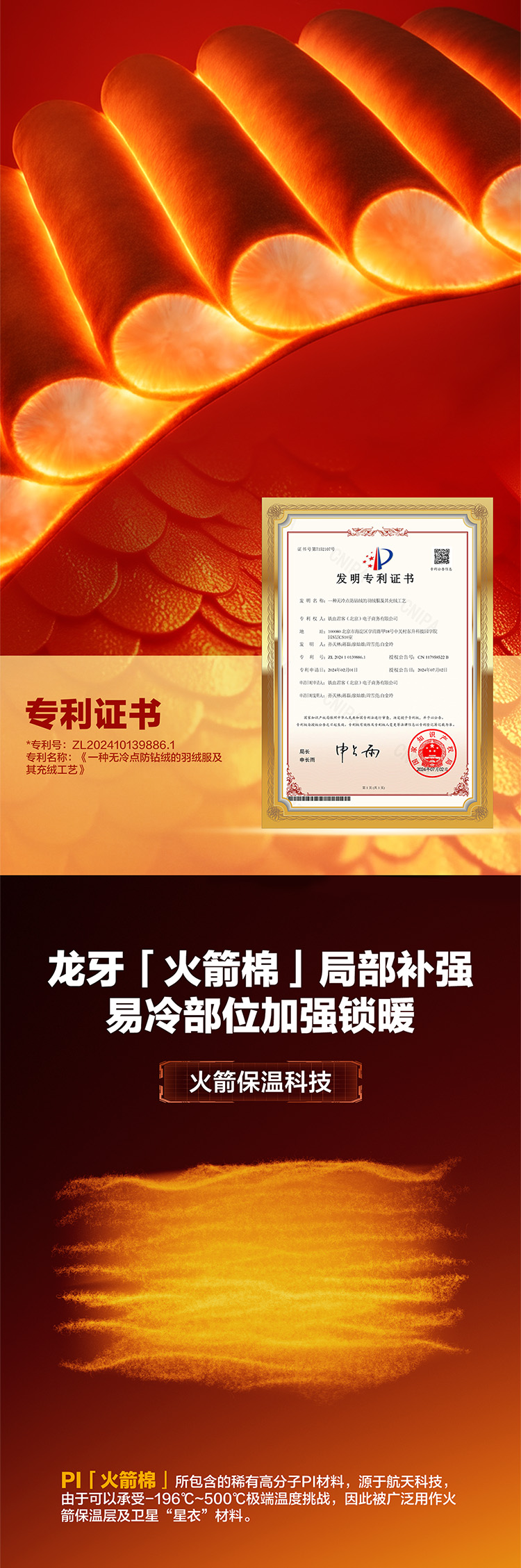 为提升穿着时的保暖性,同时达到更好的透气性与舒适度,龙牙羽绒服会在产品局部拼接少量PI火箭棉,此行为符合国标规定,请放心购买。