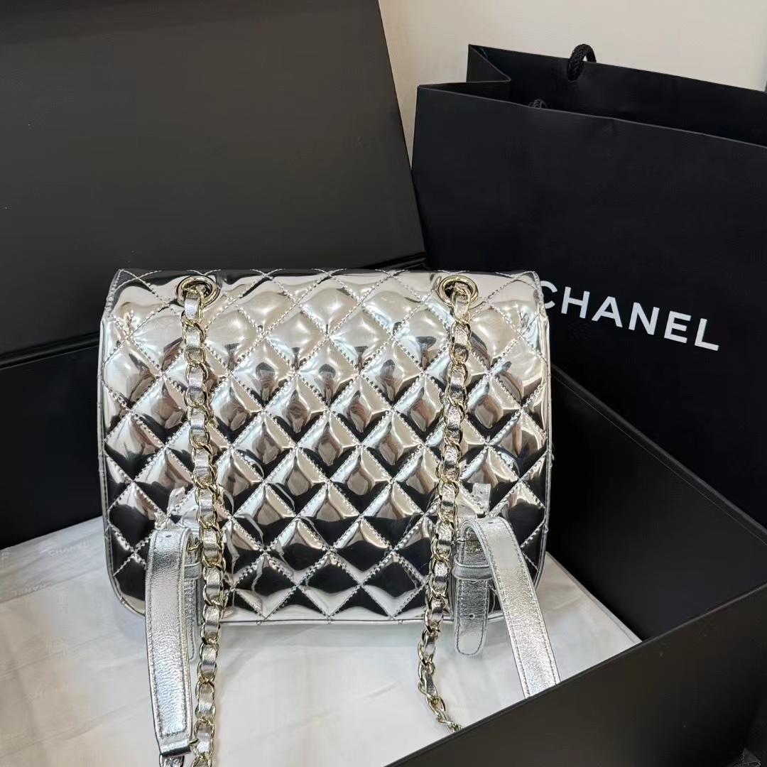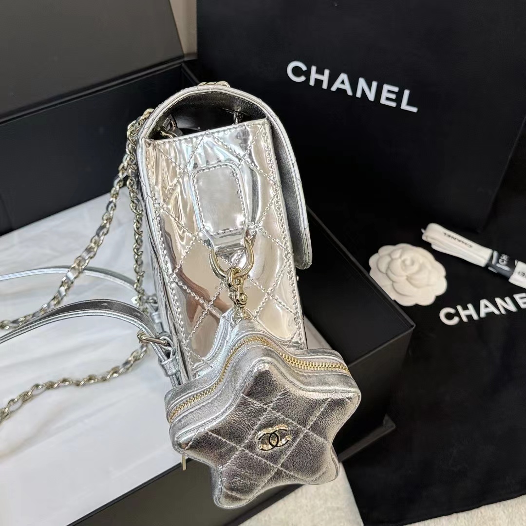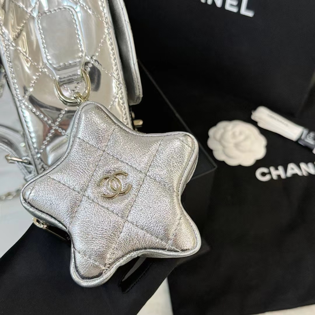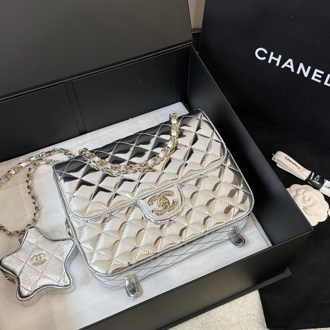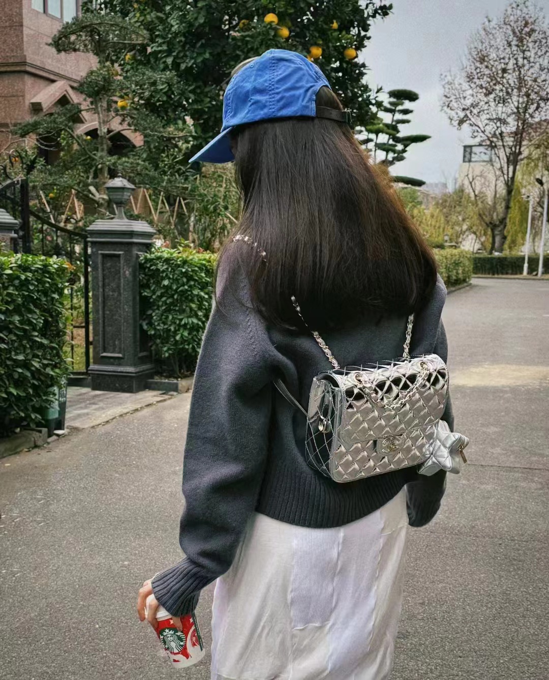 香奶奶 亮面星星 金属质感 金标LOGO 背包双肩包 银色