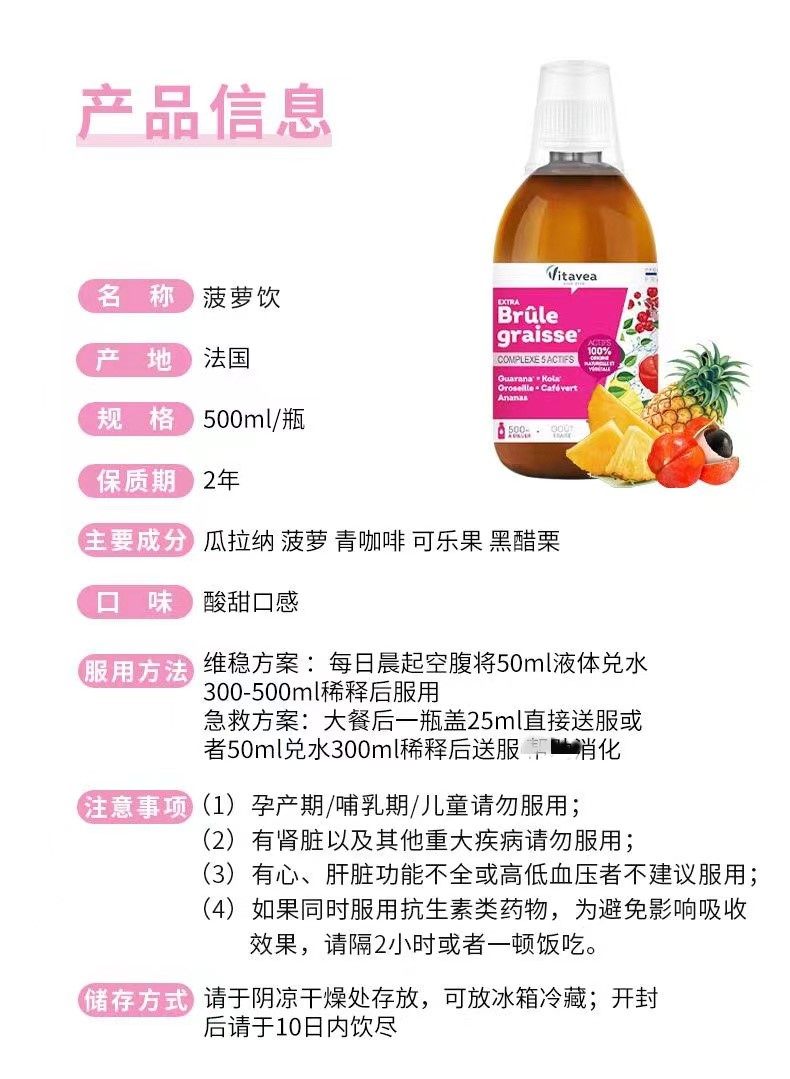 法国Vitavea燃燃美体炫腹菠萝饮膳食代谢 500ml瓶
