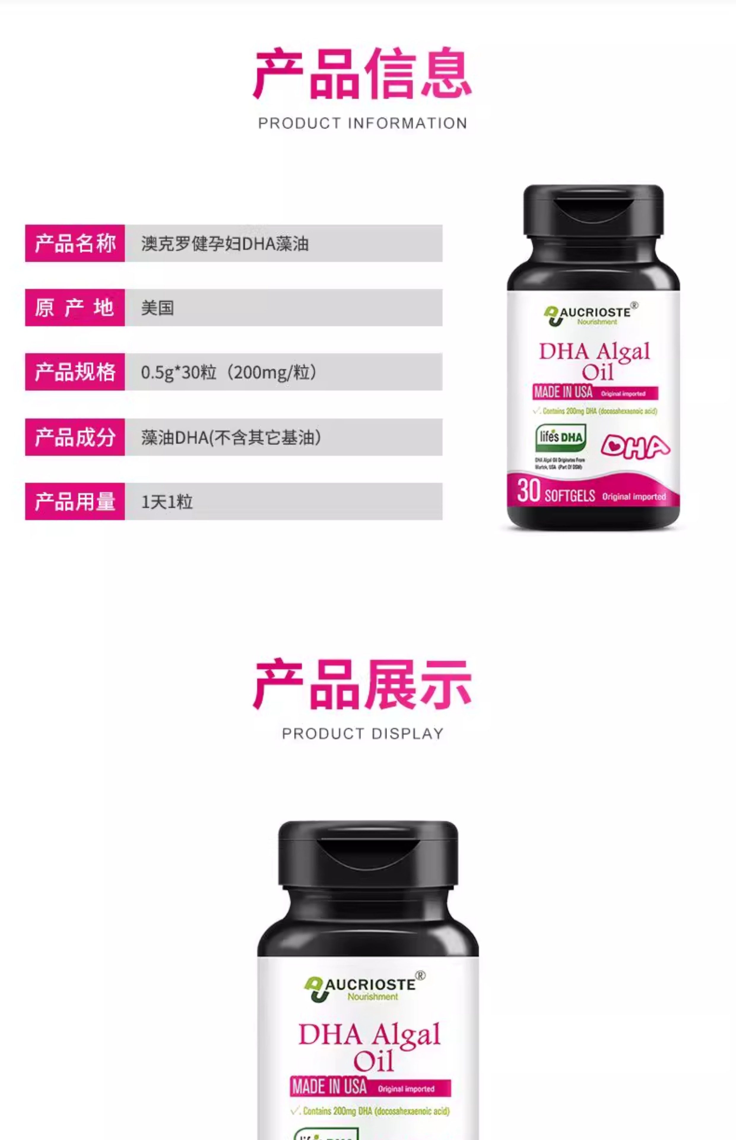 澳克罗健孕妇专用DHA海藻油孕期哺乳期营养品软胶囊美国原装进口