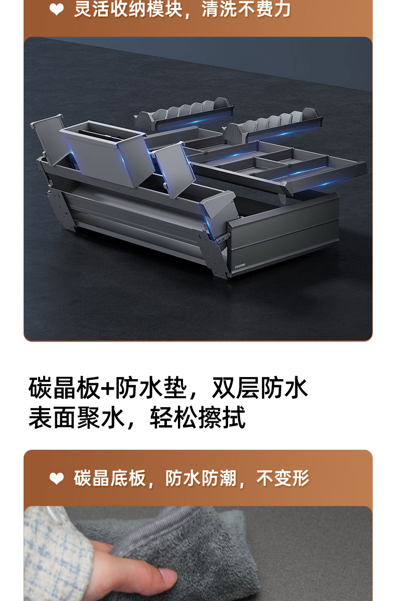 拉篮质保5年,导轨质保1年,质保期内质量问题免费维修或更换,非质量问题售出不退不换