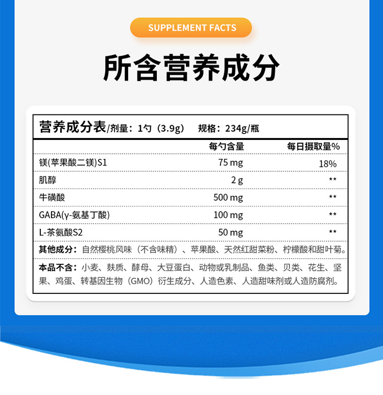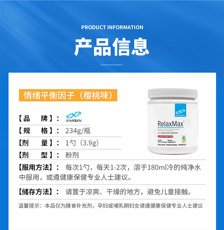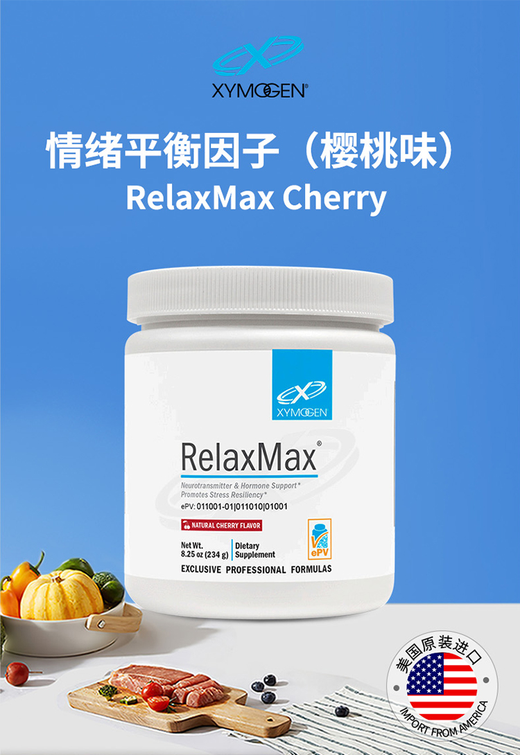 【效期至27年5月】GABAγ-氨基丁酸粉剂(樱桃味) XYMOGEN RelaxMax Cherry 60 sv 234g/瓶