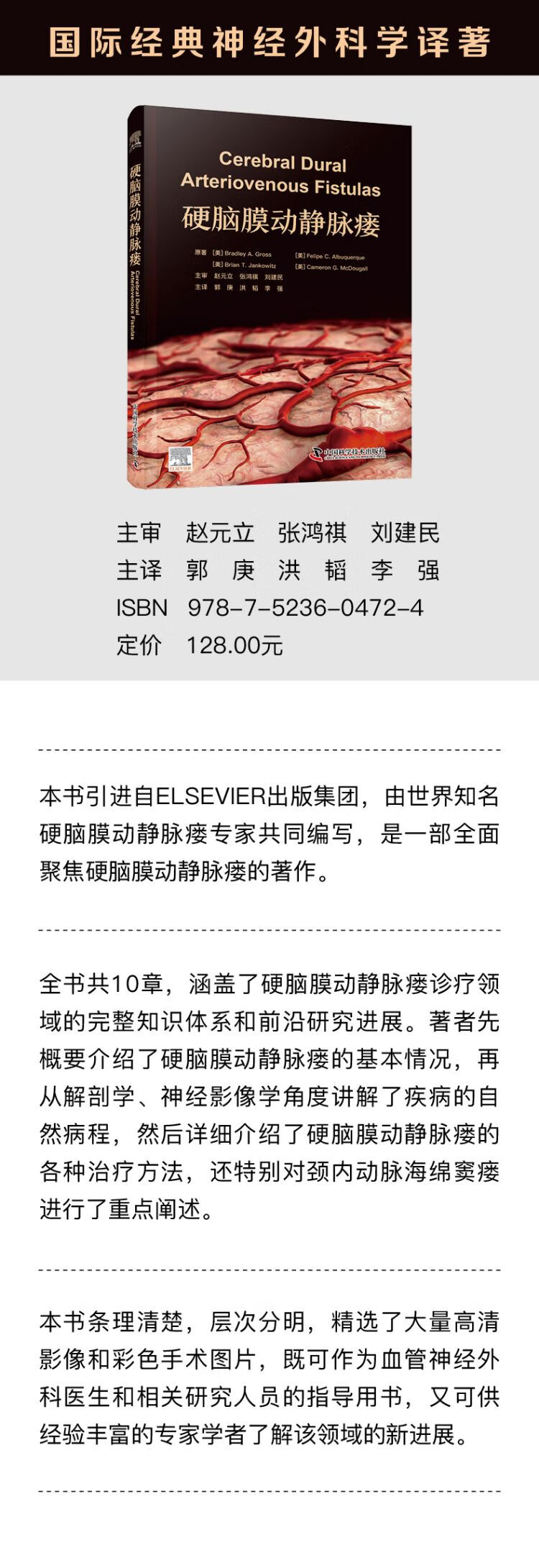 本书引进自 ELSEVIER 出版集团,是一部全面聚焦硬脑膜动静脉瘘的著作。著者先概要介绍了硬脑膜动静脉瘘的基本情况,再从解剖学、神经影像学角度讲解了疾病的自然病程,然后详细介绍了硬脑膜动静脉瘘的各种治疗方法,还特别对颈内动脉海绵窦瘘进行了重点阐述。本书内容实用,阐释简明,精选大量高清影像和彩色手术图片,系统阐述了硬脑膜动静脉瘘诊疗领域的完整知识体系和前沿研究进展,既可作为血管神经外科医生和相关研究人员的指导用书,又可供经验丰富的专家学者了解该领域的新进展。