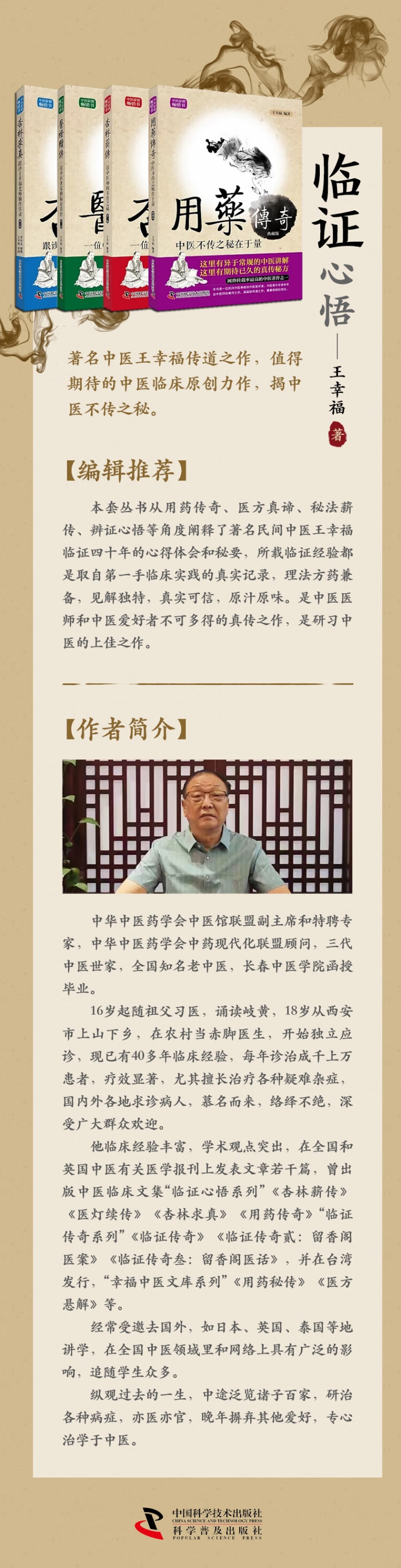 王幸福(网名古道瘦马),中医世家,祖籍河南,飘零豫陕,落叶西安。16岁起随祖父习医,诵读岐黄,18岁始悬壶农村,独自行医,中途泛览诸子百家,研治各种病证,亦医亦官,晚年摒弃其他爱好,专心治学于中医。一贯奉行读万卷医书,治万计病患。崇尚大道至简,效法仲景;鄙视装神弄鬼,故弄玄虚。一生无可炫耀之光环,亦无可挟之技,仅治过数万例病者,借古文卖油翁一言自我评价,“无他,但手熟尔”。出版临证心悟文集四部——《杏林薪传》《医灯续传》《杏林求真》《用药传奇》。