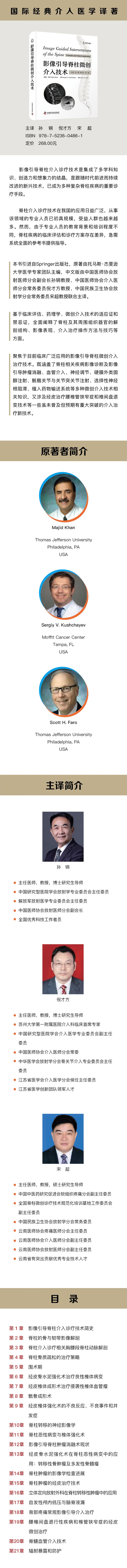 本书引进自 Springer 出版社,是一部聚焦于目前广泛应用的影像引导脊柱微创介入治疗技术的实用参考书。著者基于临床评估、药理学、微创介入技术的适应证和禁忌证,全面阐释了脊柱及其周围组织器官的解剖结构、影像表现、介入治疗操作方法与技巧等丰富内容,涵盖了脊柱相关疾病影像诊断及影像引导肿瘤消融、血管介入、神经调节、硬膜外类固醇注射、骶髂关节与关节突关节注射、选择性神经根阻滞、药物输送系统等多种微创介入技术相关知识。书中还介绍了经皮治疗腰椎管狭窄症和椎间盘退变技术等一些虽未普及但预期有重大突破的介入治疗新技术。本书特点鲜明,实用性强,且图文并茂,适合介入科、神经外科、脊柱外科、骨科等相关学科医生、医学生参考阅读。