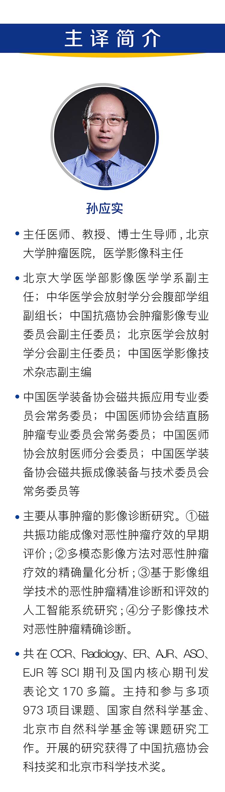 孙应实 ●主任医师、教授、博士生导师,北京大学肿瘤医院,医学影像科主任 ●北京大学医学部影像医学学系副主任;中华医学会放射学分会腹部学组副组长;中国抗癌协会肿瘤影像专业委员会副主任委员;北京医学会放射学分会副主任委员;中国医学影像技术杂志副主编 ●中国医学装备协会磁共振应用专业委员会常务委员,中国医师协会结直肠肿瘤专业委员会常务委员;中国医师协会放射医师分会委员;中国医学装备协会磁共振成像装备与技术委员会常务委员等 ●主要从事肿瘤的影像诊断研究。①磁共振功能成像对恶性肿瘤疗效的早期评价;②多模态影像方法对恶性肿瘤疗效的精确量化分析;③基于影像组学技术的恶性肿瘤精准诊断和评效的人工智能系统研究;④分子影像技术对恶性肿瘤精确诊断。 ●共在CCR、Radiology、ER、AJR、ASOEJR等SCI期刊及国内核心期刊发表论文170多篇。主持和参与多项973项目课题、国家自然科学基金、北京市自然科学基金等课题研究工作。开展的研究获得了中国抗癌协会科技奖和北京市科学技术奖