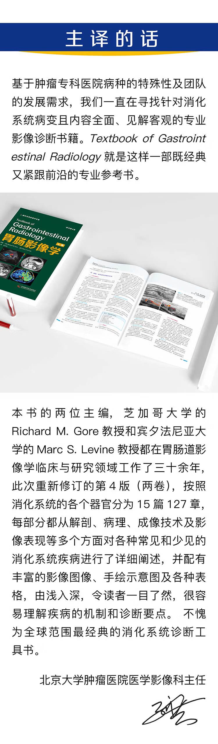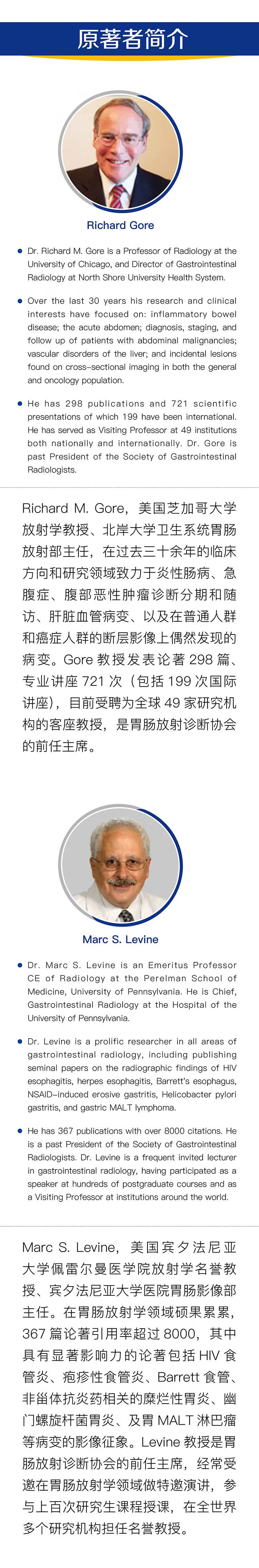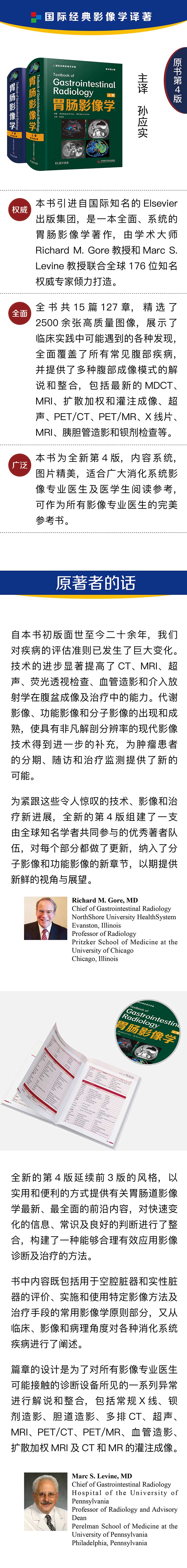 本书引进自国际知名的 Elsevier 出版集团,是一本全面、系统的胃肠影像学著作,由学术大师Richard M. Gore 教授和 Marc S. Levine 教授联合全球 176 位知名权威专家倾力打造。全书共15 篇 127章,精选了 2500 余张高质量图像,展示了临床实践中可能遇到的各种发现,全面覆盖了所有常见腹部疾病,并提供了多种腹部成像模式的解说和整合,包括新的 MDCT、MRI扩散加权和灌注成像、超声、PET/CT、PET/MR、X 线片、MRI、胰胆管造影和钡剂检查等。本书为全新第 4 版,内容系统, 图片精美,适合广大消化系统影像专业医生及医学生阅读参考,可作为所有影像专业医生的完美参考书。