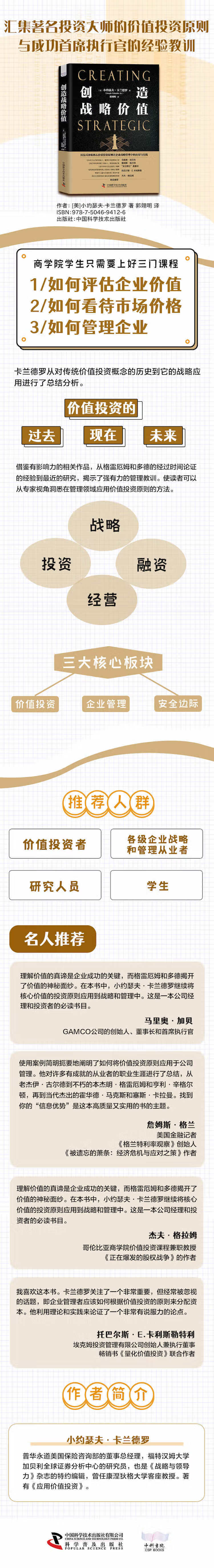在书中,卡兰德罗从对传统价值投资概念的历史到它们的战略应用进行了总结分析。他调研了价值投资的过去、现在和未来,借鉴有影响力的相关作品,从格雷厄姆和多德的经过时间论证的经验到Z近的研究,揭示了强有力的管理教训。使读者可以从专家视角洞悉在管理领域应用价值投资原则的方法,面向各级企业战略和管理从业者、价值投资者以及学生和研究人员。