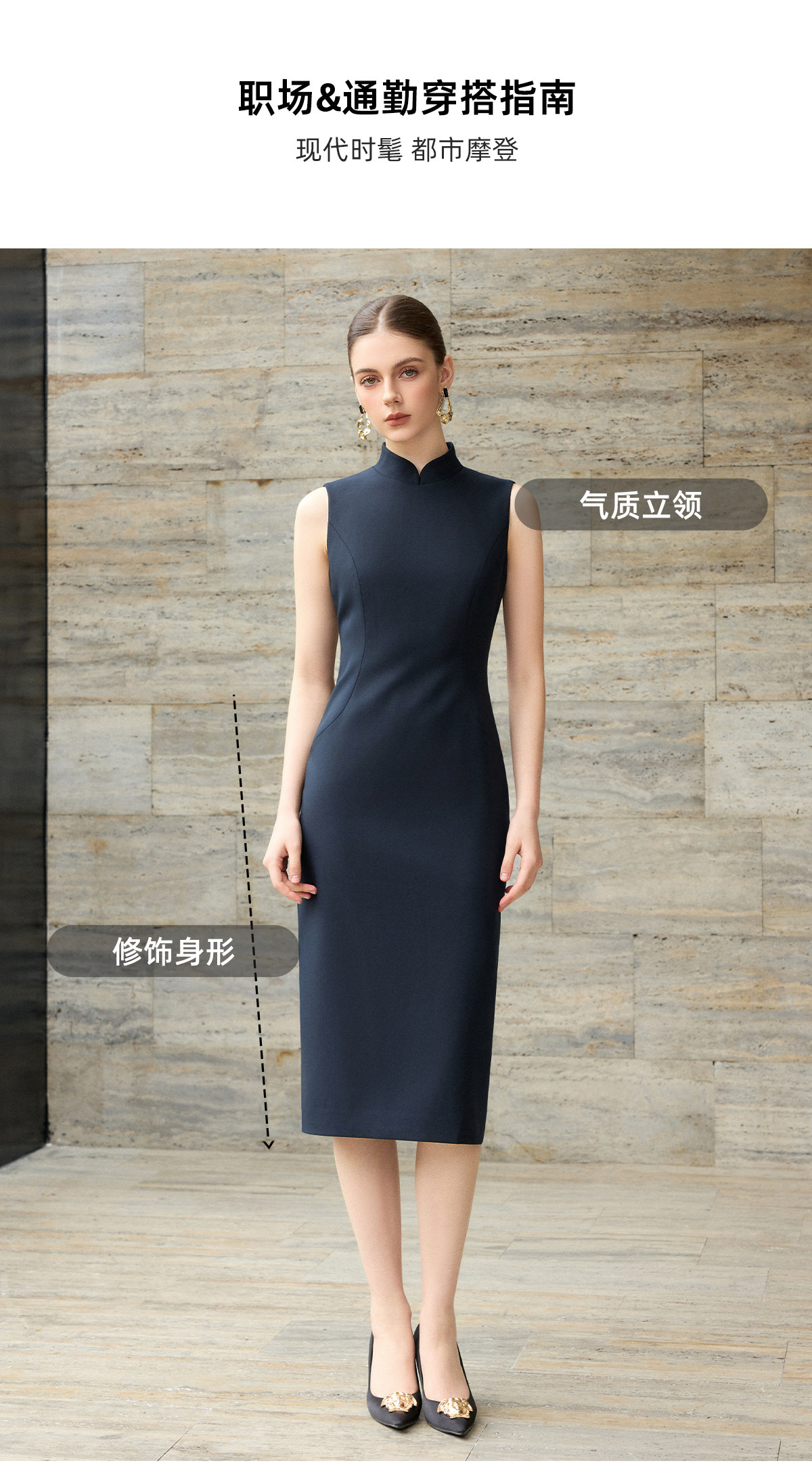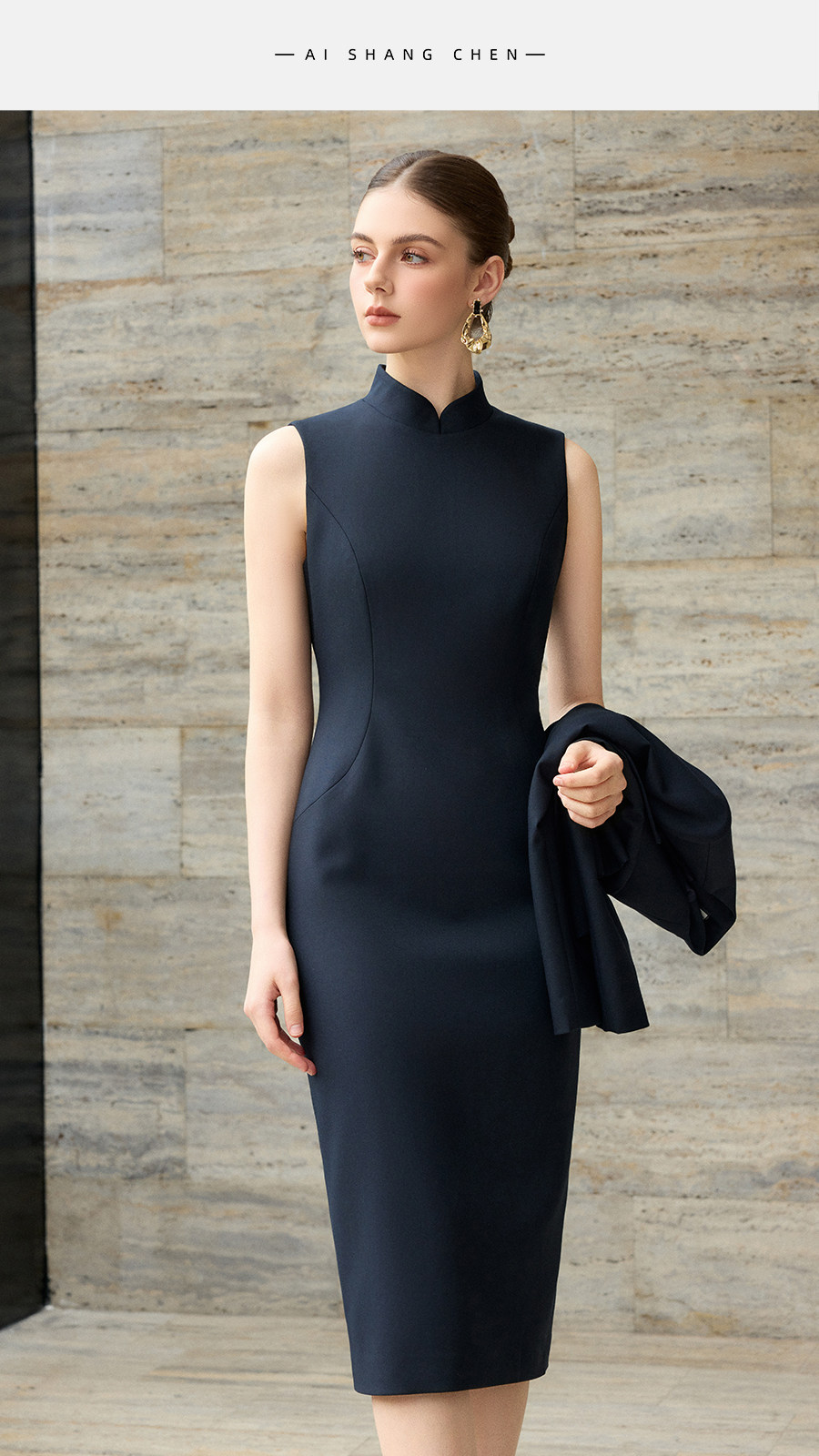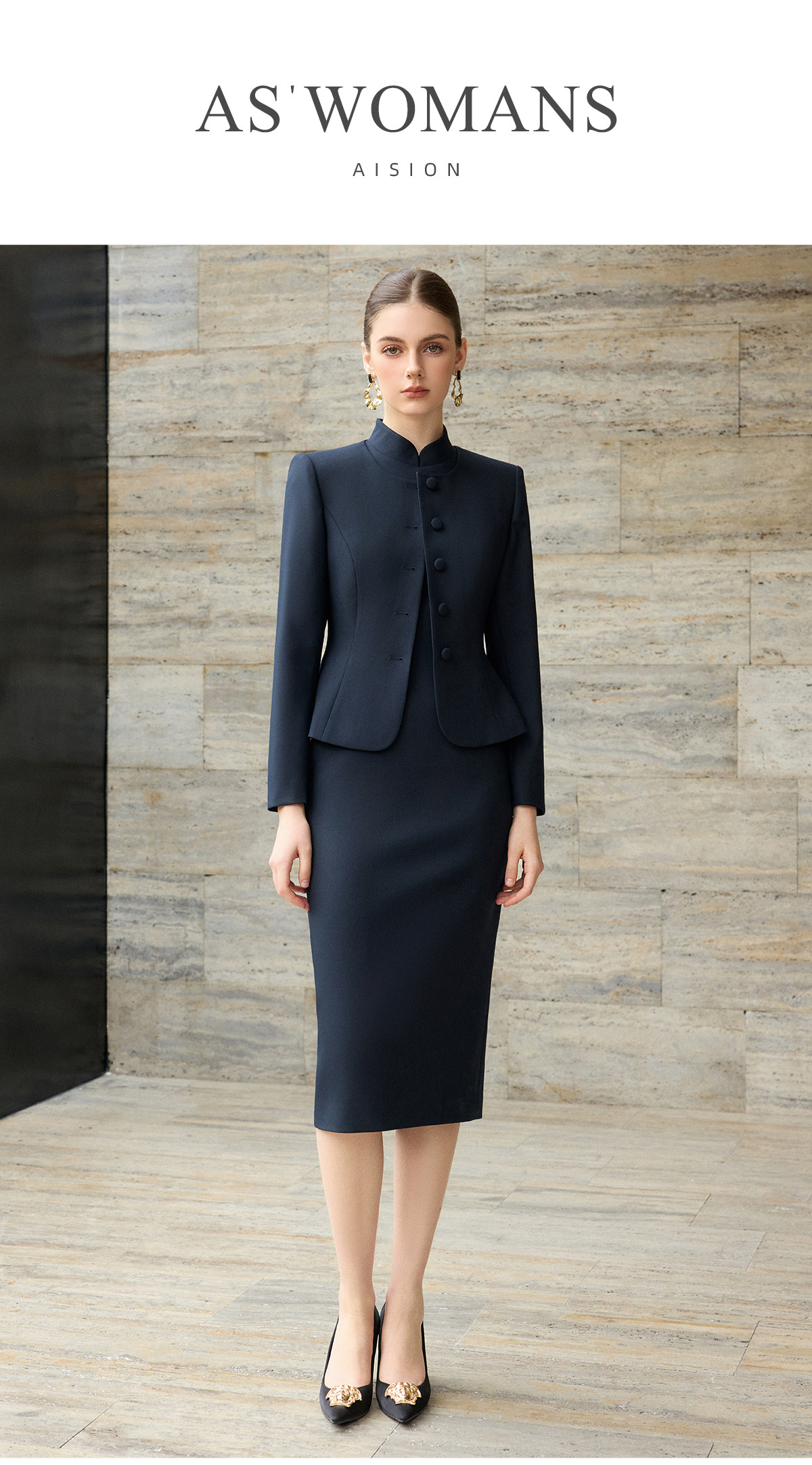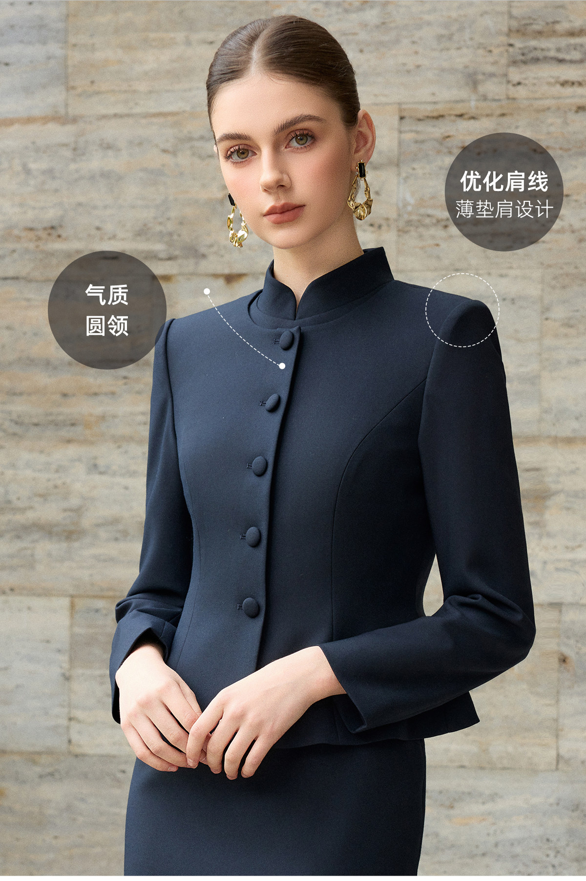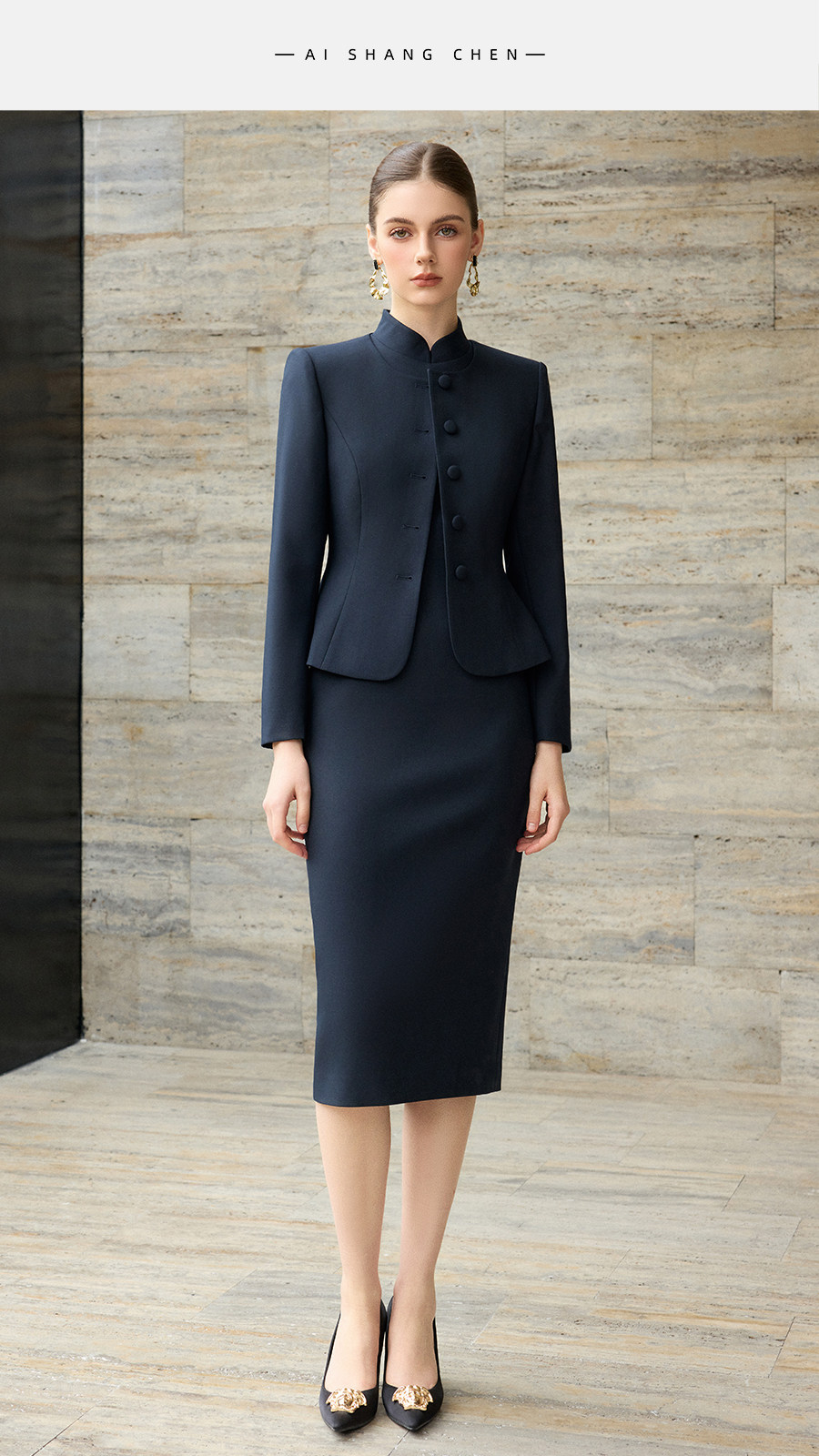 艾尚臣西装套裙女职业装藏蓝色修身显瘦高级旗袍连衣裙套装工作服