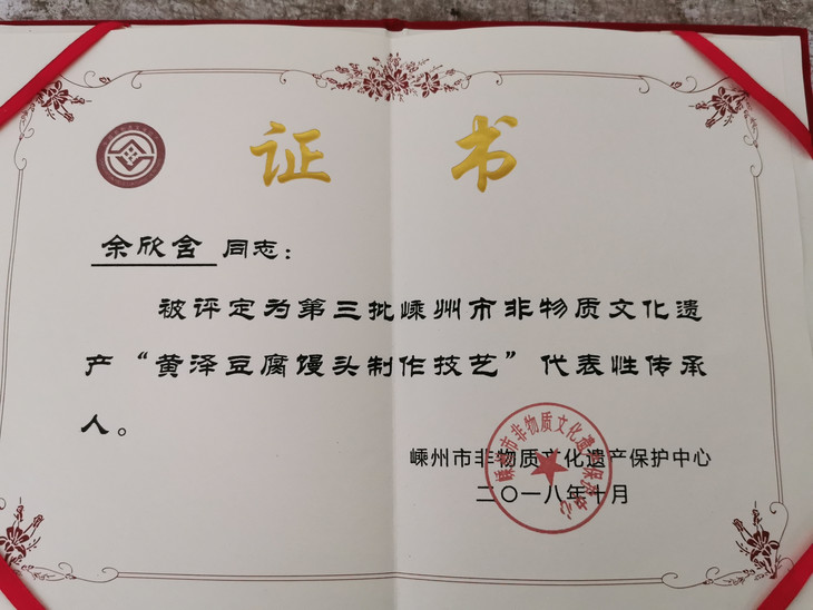 余家豆包在18年10月被评为嵊州非遗“黄泽豆腐馒头制作技艺”代表性传承人。