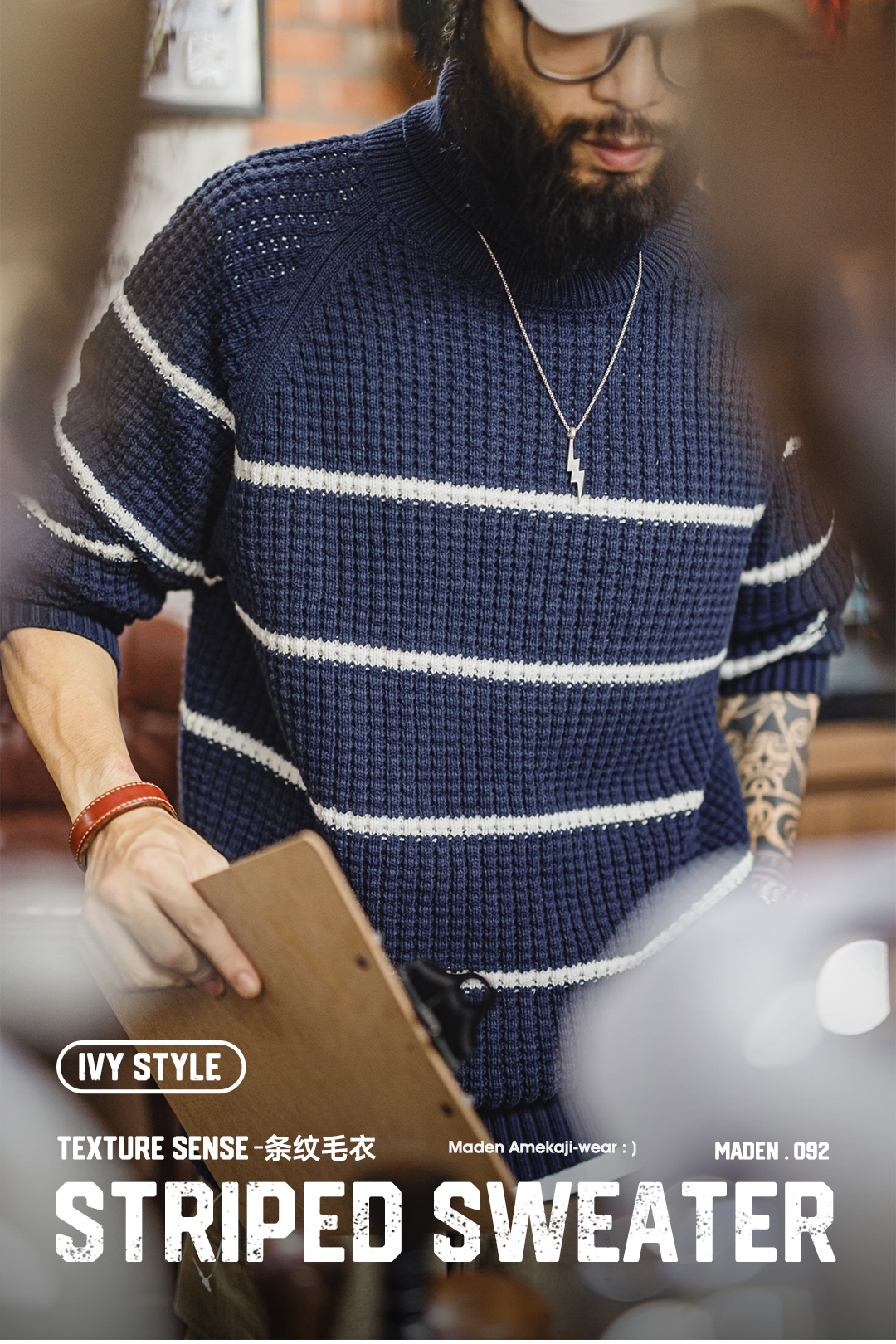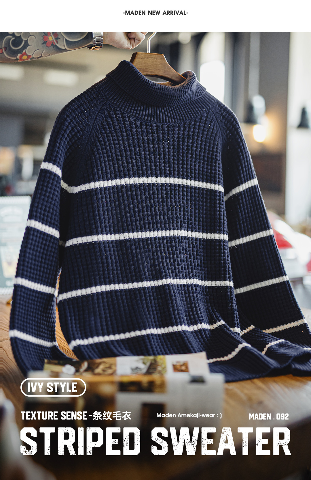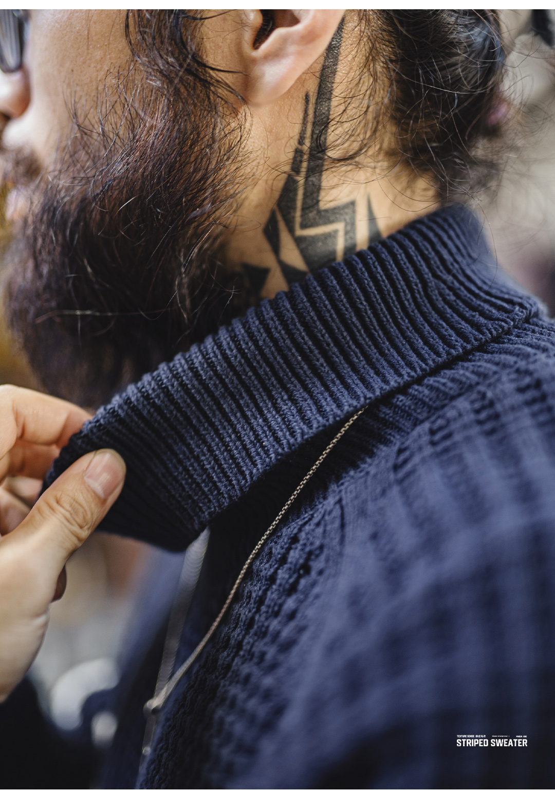马登工装美式复古条纹插肩袖毛衣高领针织菠萝纹加厚保暖外穿男冬