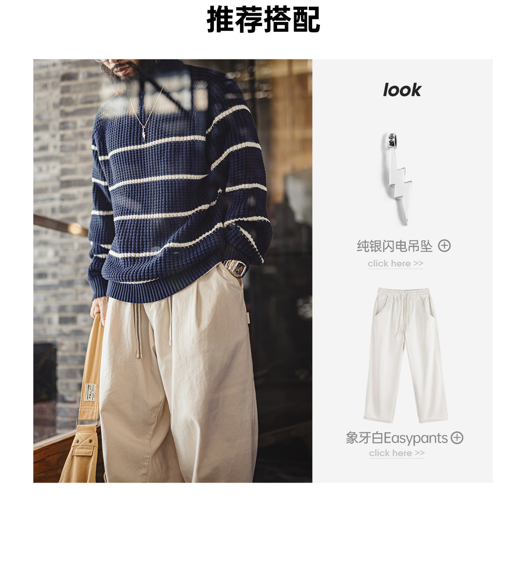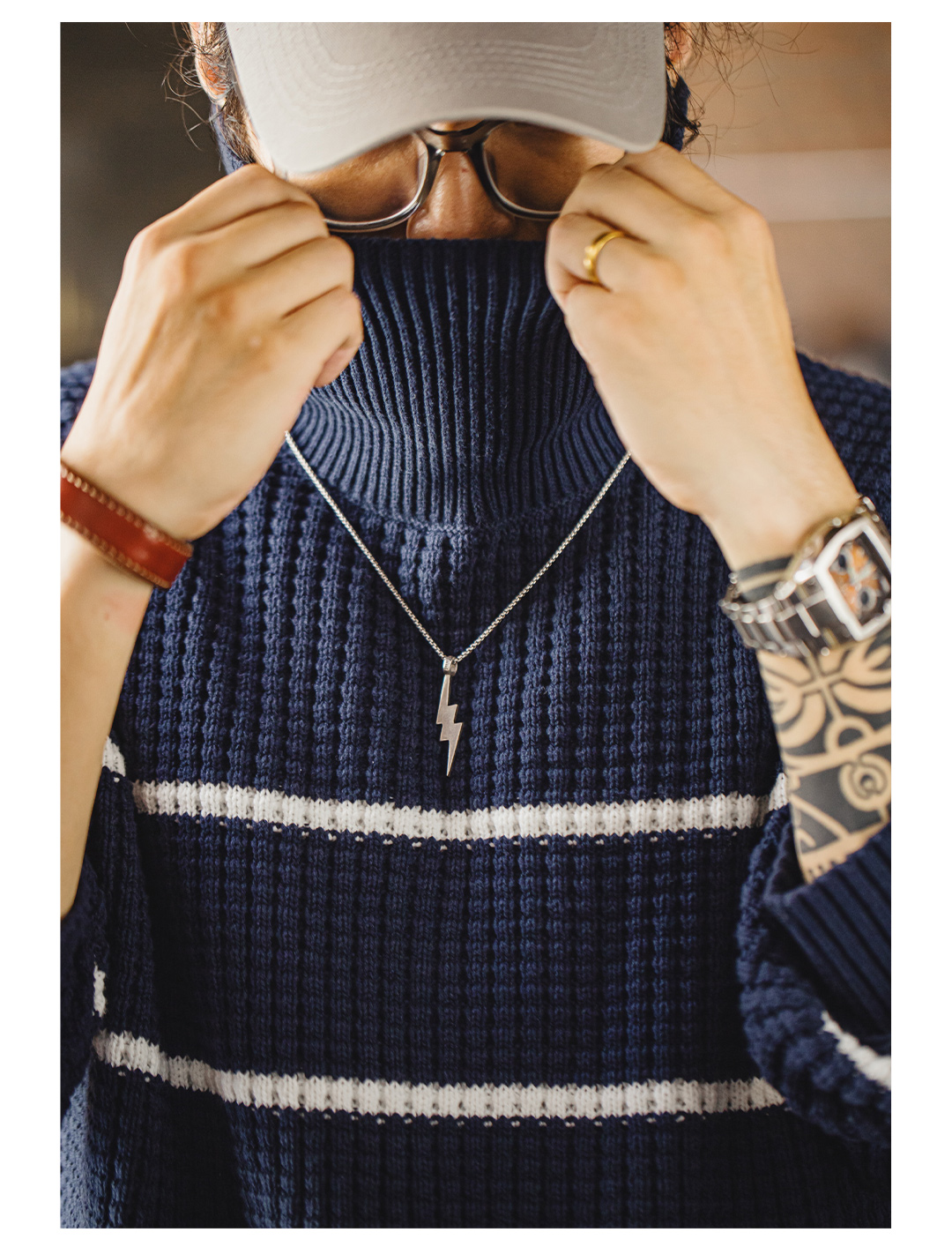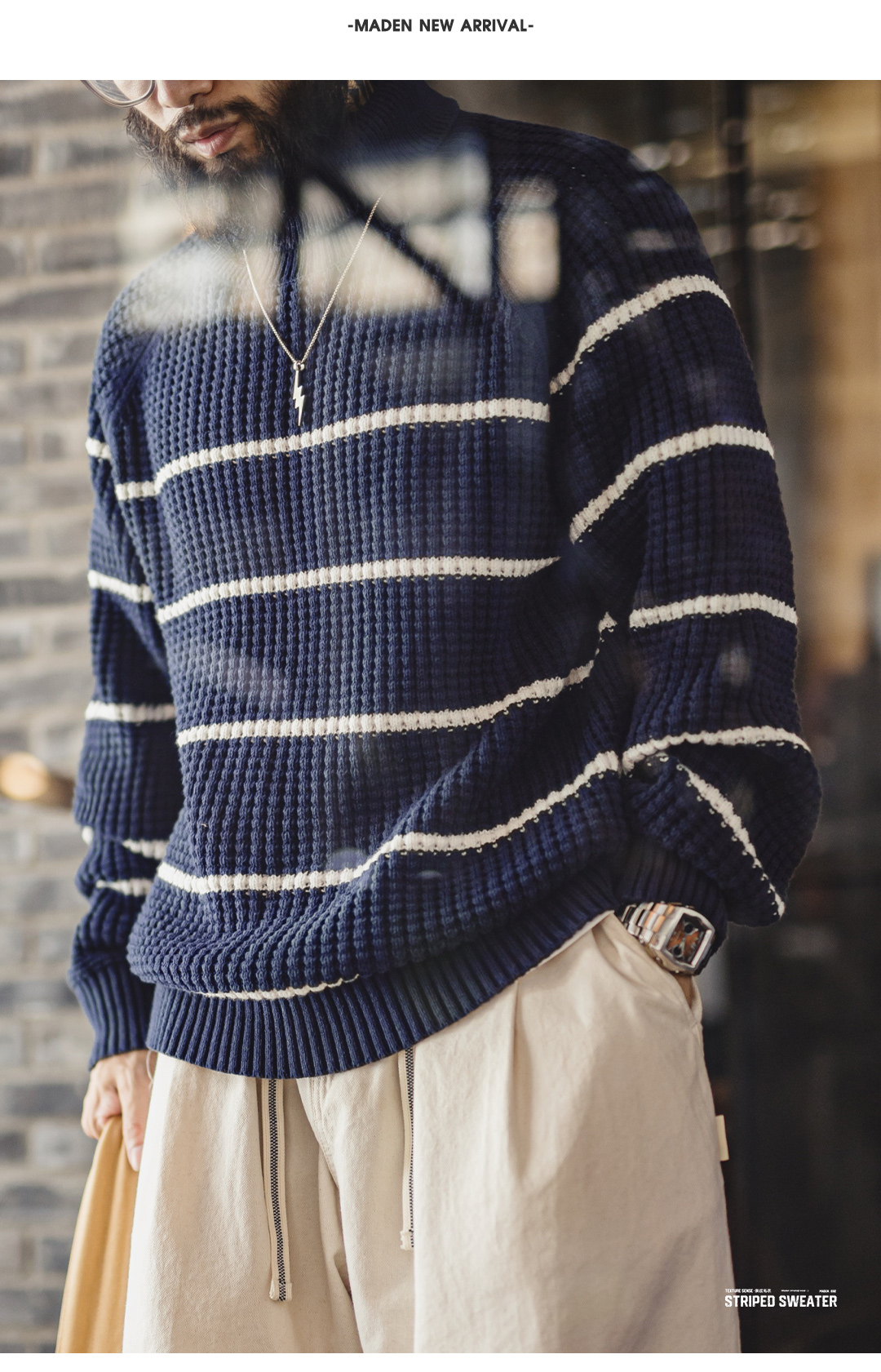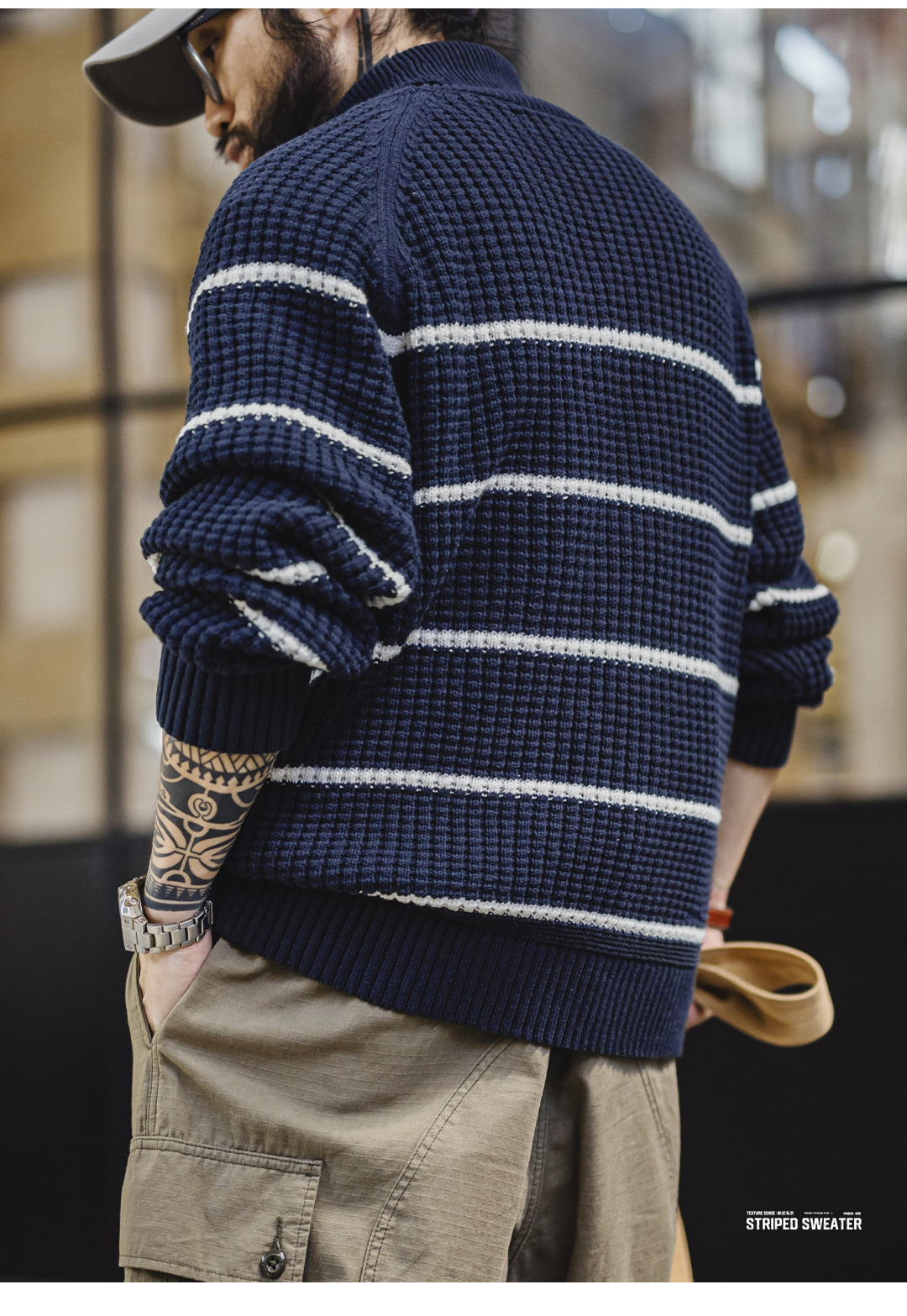马登工装美式复古条纹插肩袖毛衣高领针织菠萝纹加厚保暖外穿男冬