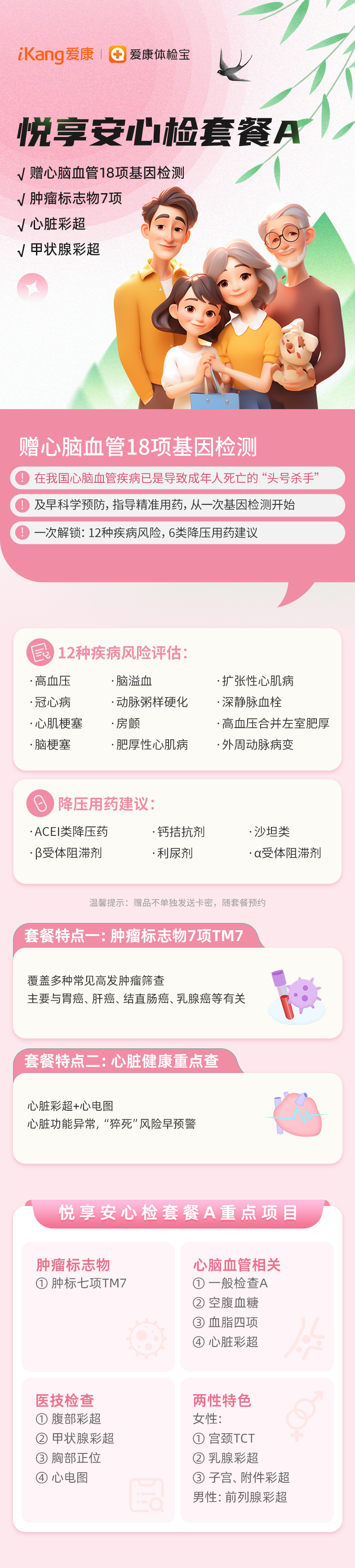 【升级睿心宝+胸部CT】爱康 心系父母体检套餐(男女)爱康国宾普检/国宾VIP/卓悦/君安分院自选