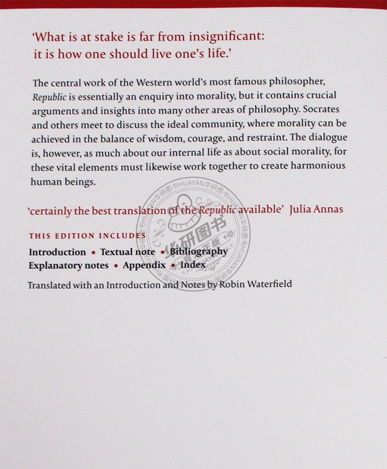 Republic is the central work of the Western world's most famous philosopher. Essentially an inquiry into morality, Republic also contains crucial arguments and insights into many other areas of philosophy. It is also a literary masterpiece: the philosophy is presented for the most part for the ordinary reader, who is carried along by the wit and intensity of the dialogue and by Plato's unforgettable images of the human condition.