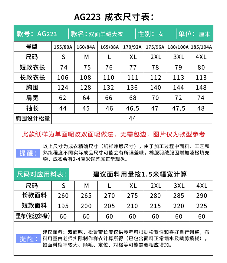 裁缝学苑AG223 女秋冬短款双面羊绒大衣纸样服装打版纸样裁剪图