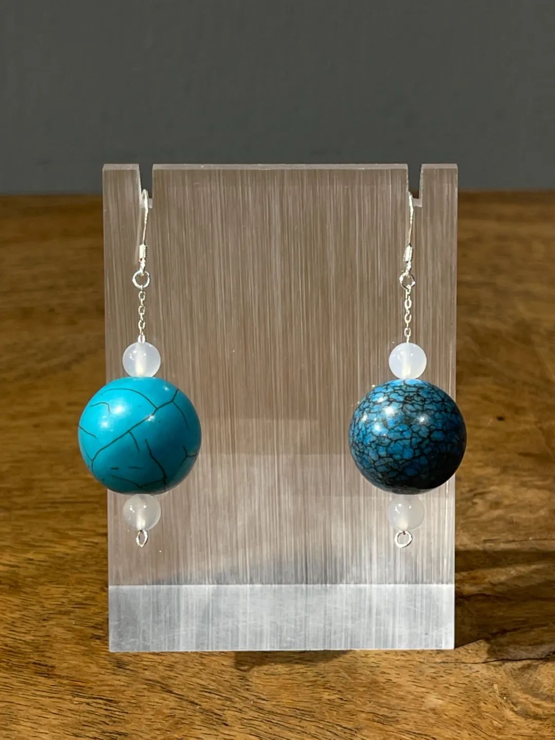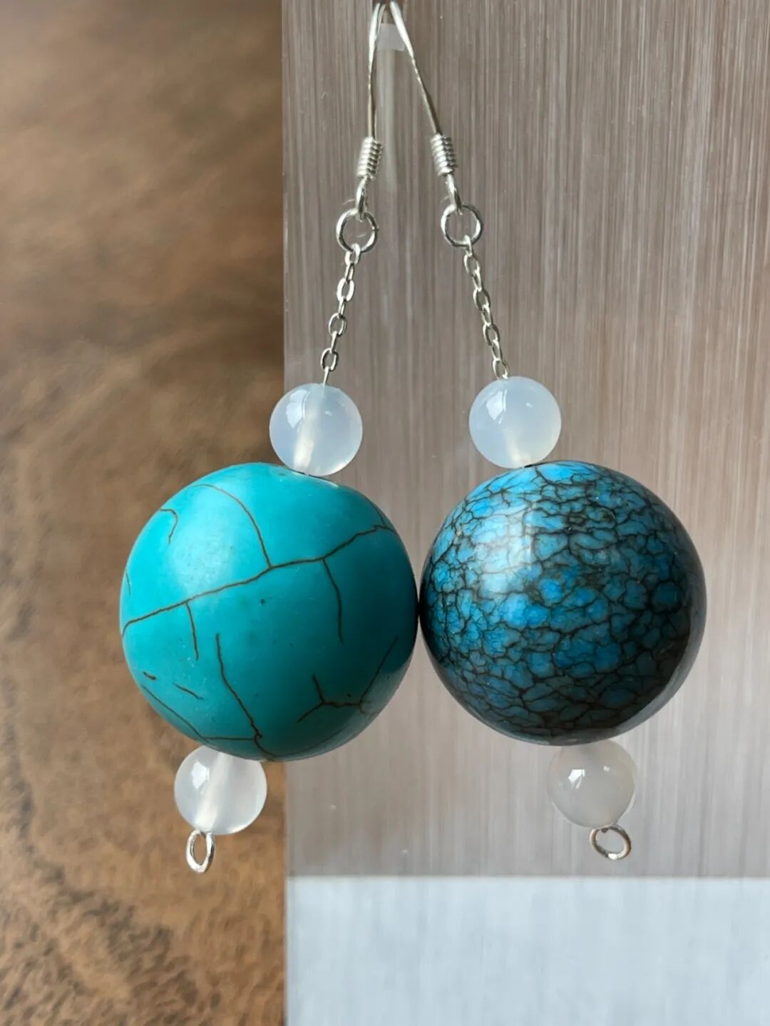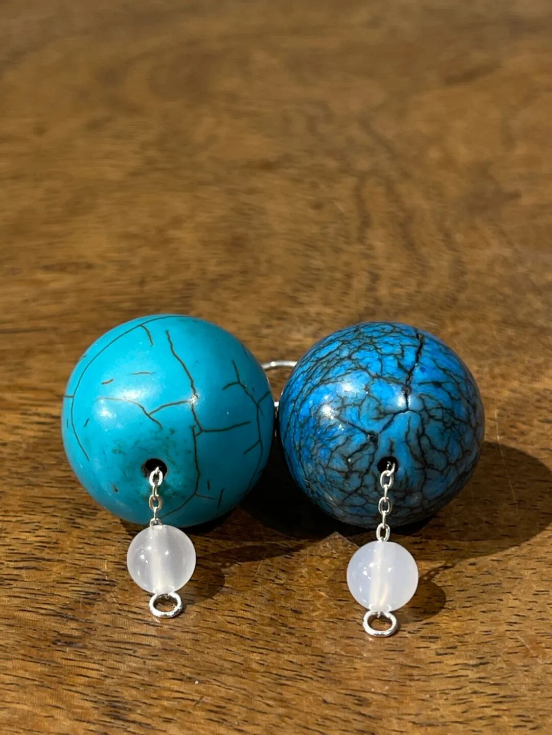 这是两粒天然老绿松石大圆珠,搭配白玉髓珠与925银耳钩设计成淑女耳坠一对,是天然绿松石圆珠,尺寸大,直径近二厘米,色泽柔美、满佈俗称铁线的天然石纹黑色开片,质地堅硬,设计成银钩耳坠简约典雅。