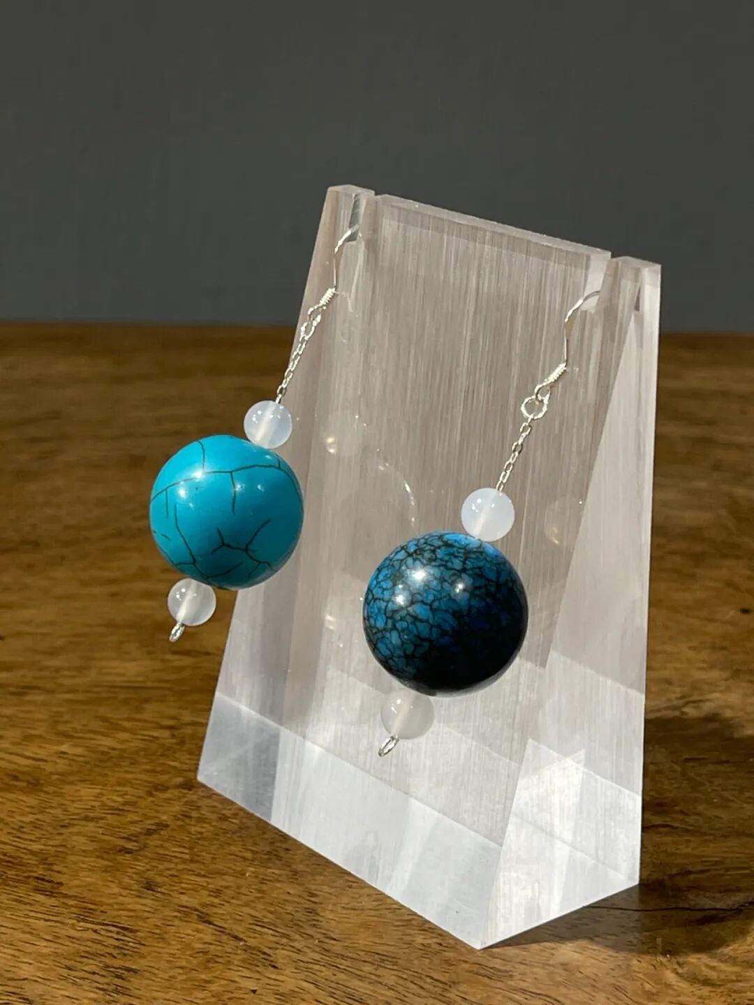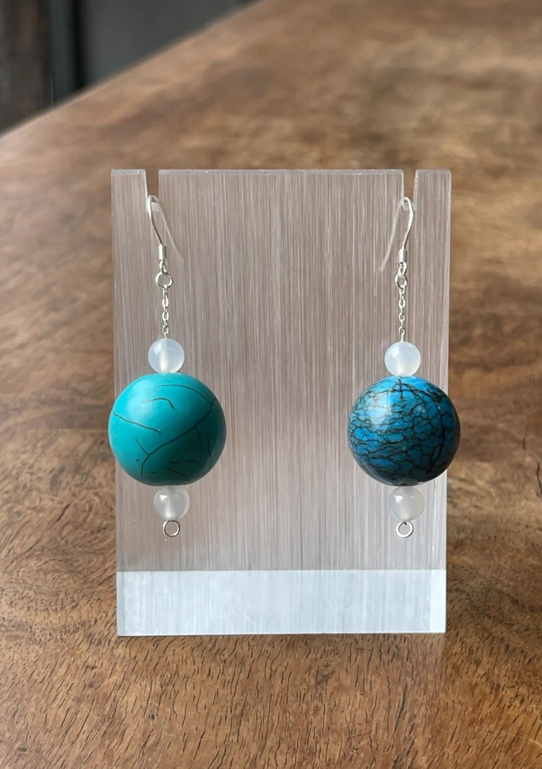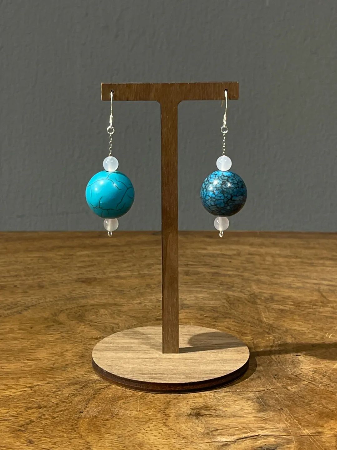 这是两粒天然老绿松石大圆珠,搭配白玉髓珠与925银耳钩设计成淑女耳坠一对,是天然绿松石圆珠,尺寸大,直径近二厘米,色泽柔美、满佈俗称铁线的天然石纹黑色开片,质地堅硬,设计成银钩耳坠简约典雅。