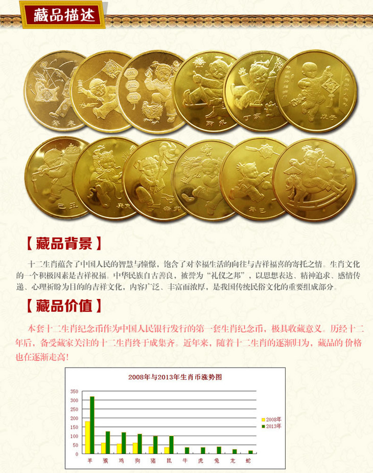 注:第一轮生肖币发行年份跨度大(2003~2014)共12年,不同年份的纪念币略有色差,个别颜色深一些、浅一些,还有普通流通纪念币常见的轻微划痕等,这是铸造时互相摩擦造成的,属于正常现象,请朋友们知悉!
