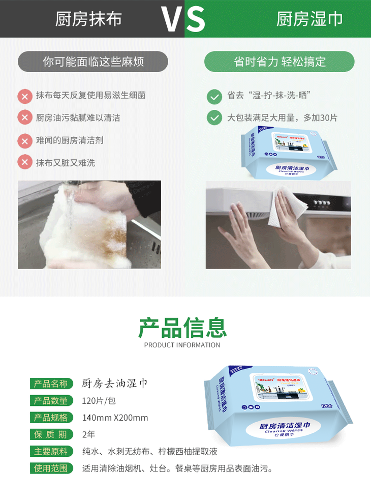 厨房湿巾清洁厨房专用纸巾120片去油污带盖湿纸巾用纸,