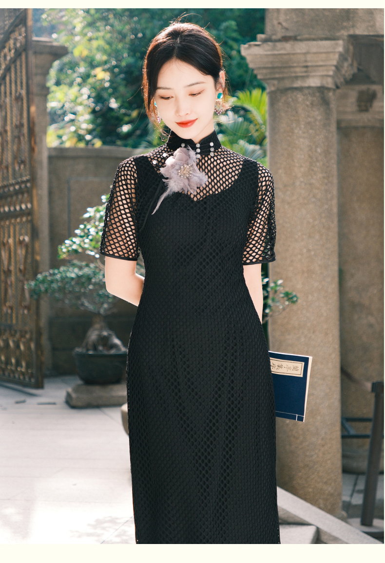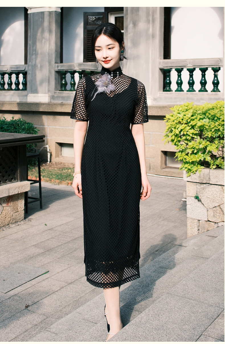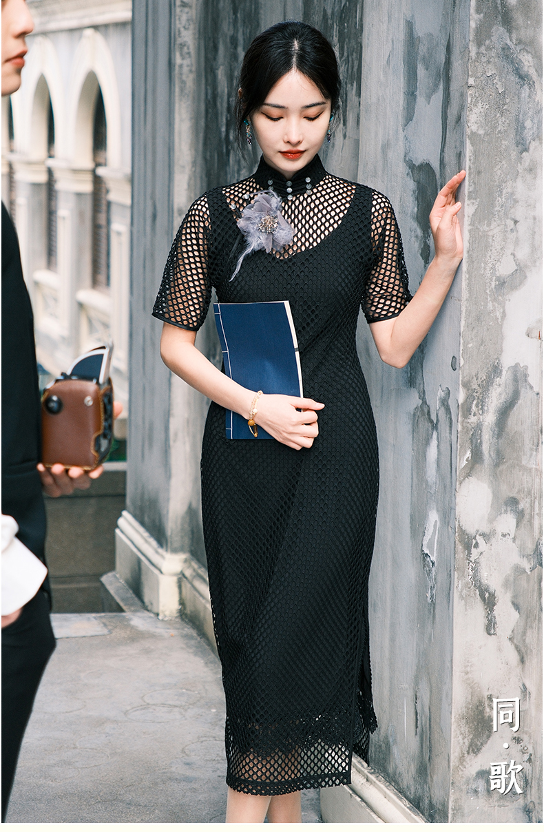 上海逸红颜同歌2025夏新网状蕾丝假两件三扣领阮玲玉复刻款旗袍裙