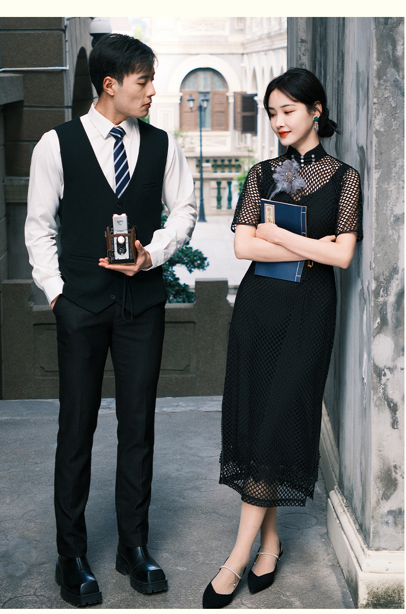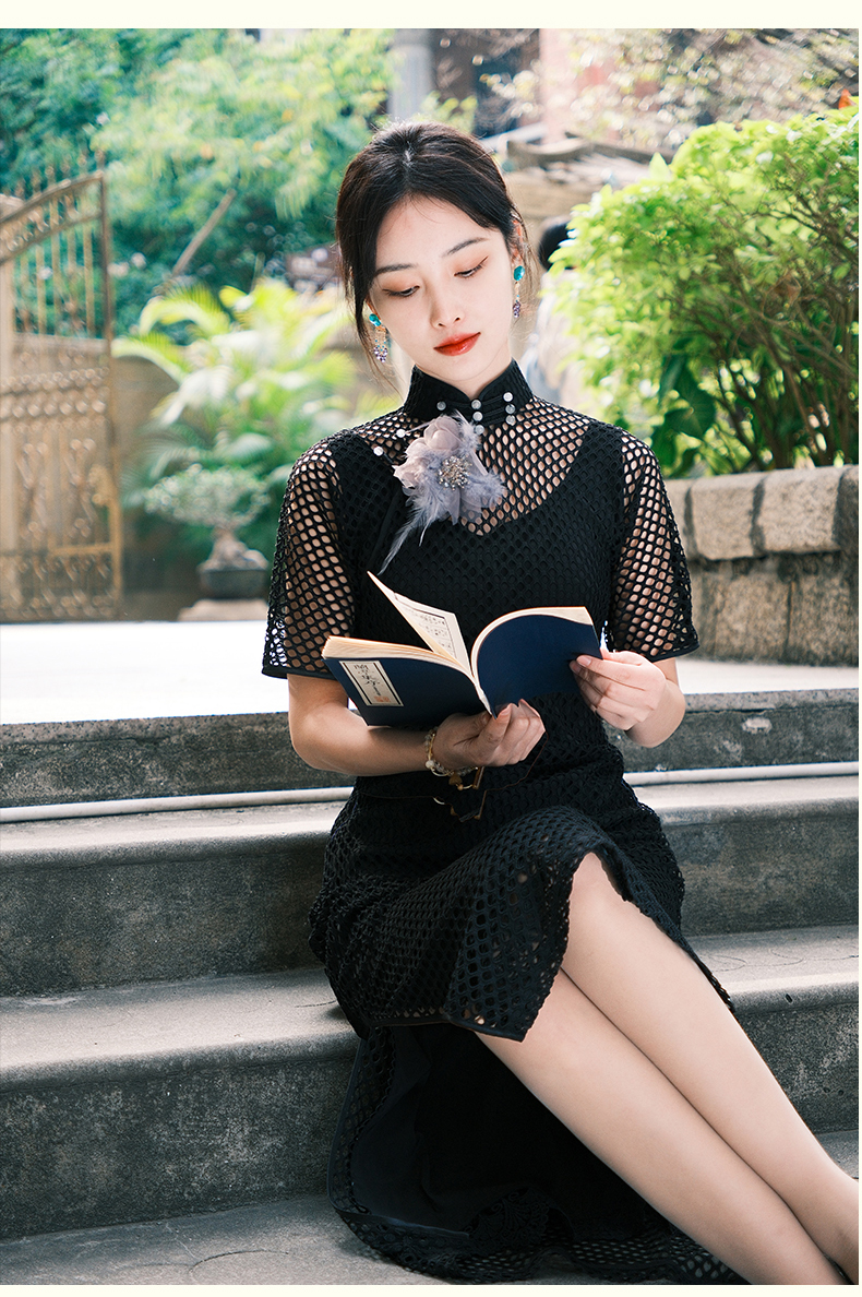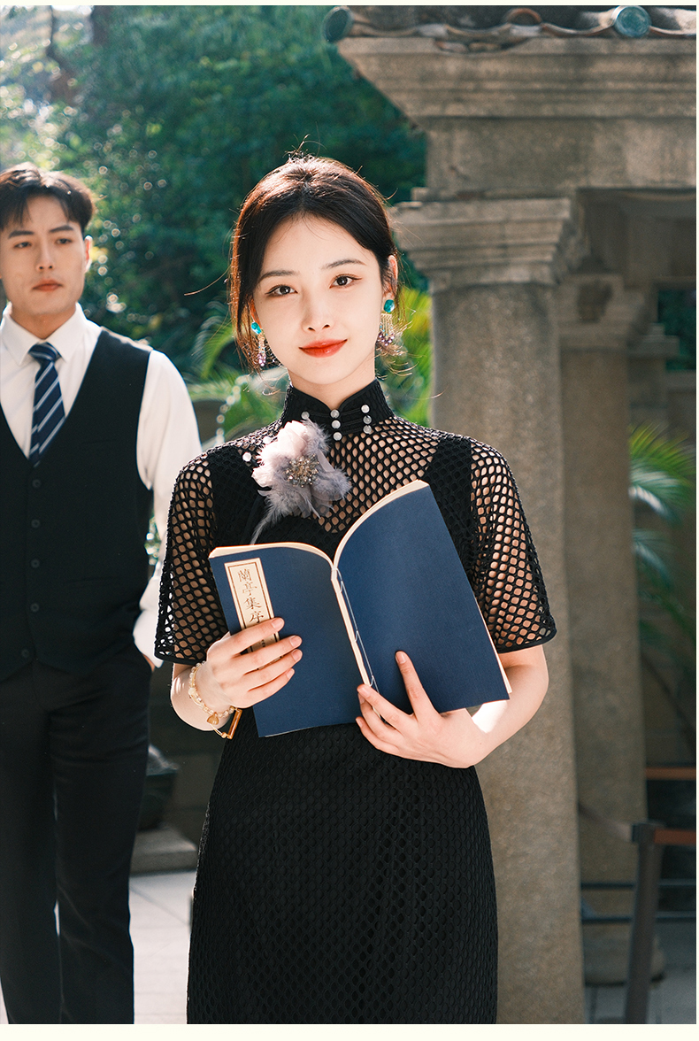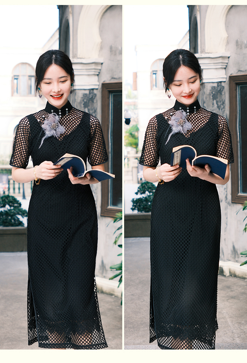 上海逸红颜同歌2025夏新网状蕾丝假两件三扣领阮玲玉复刻款旗袍裙