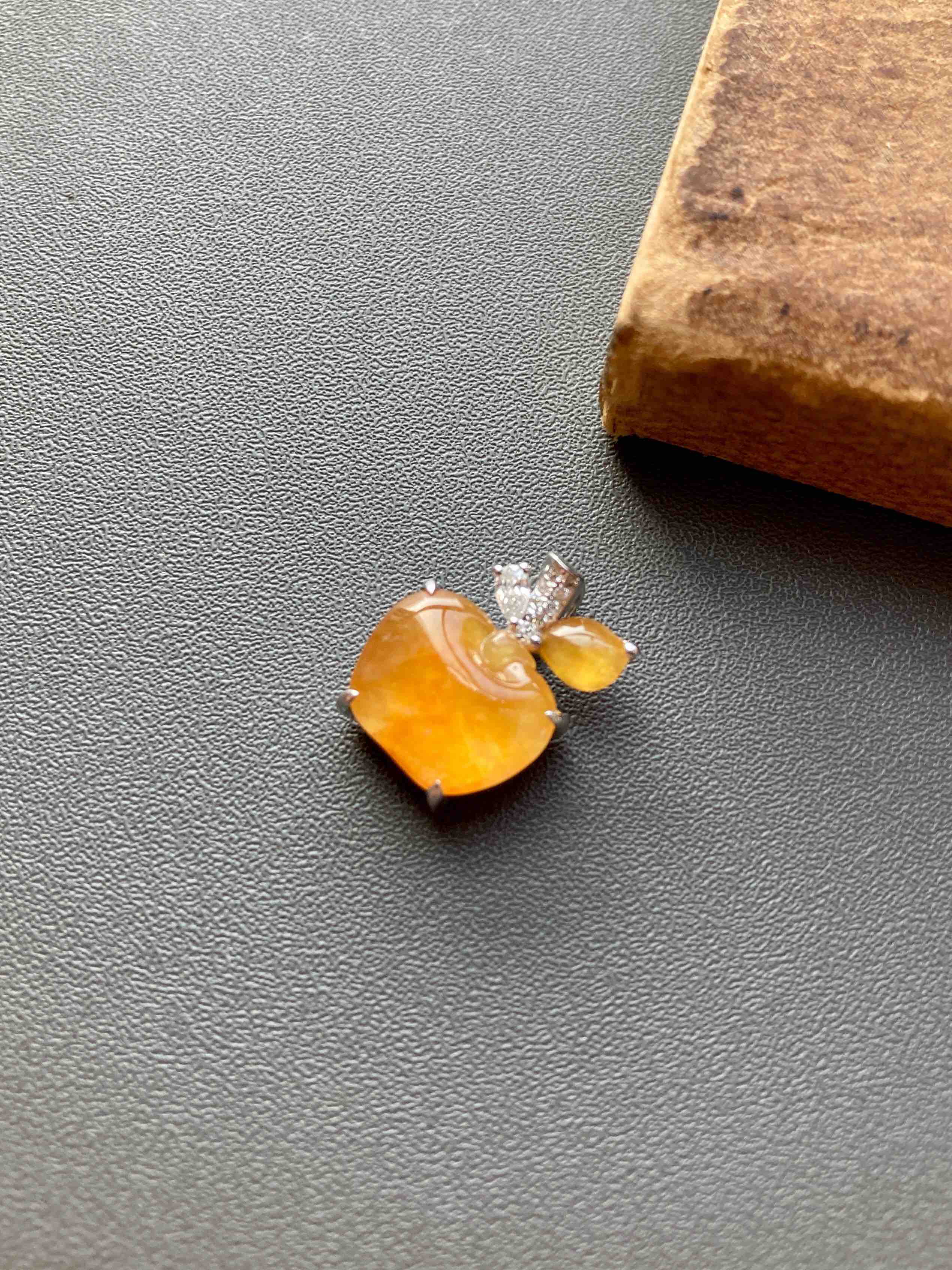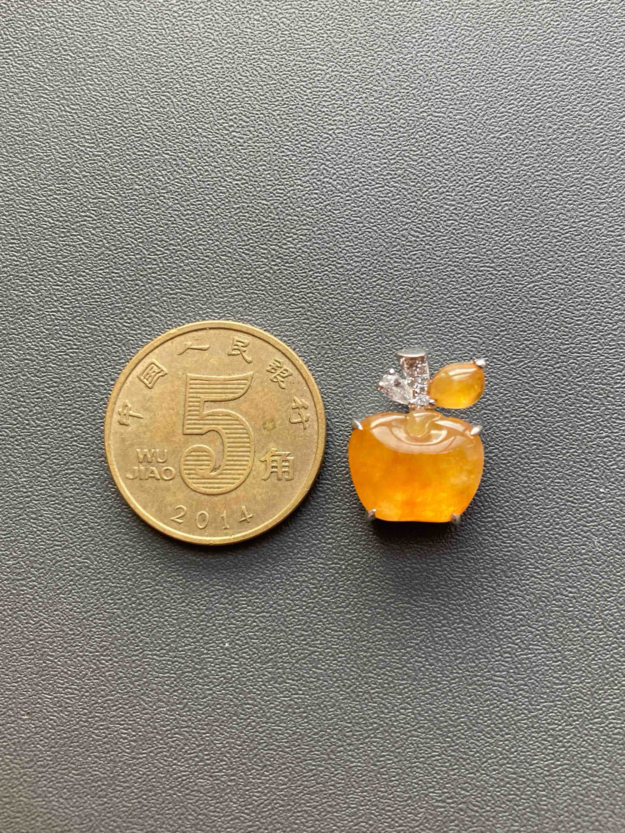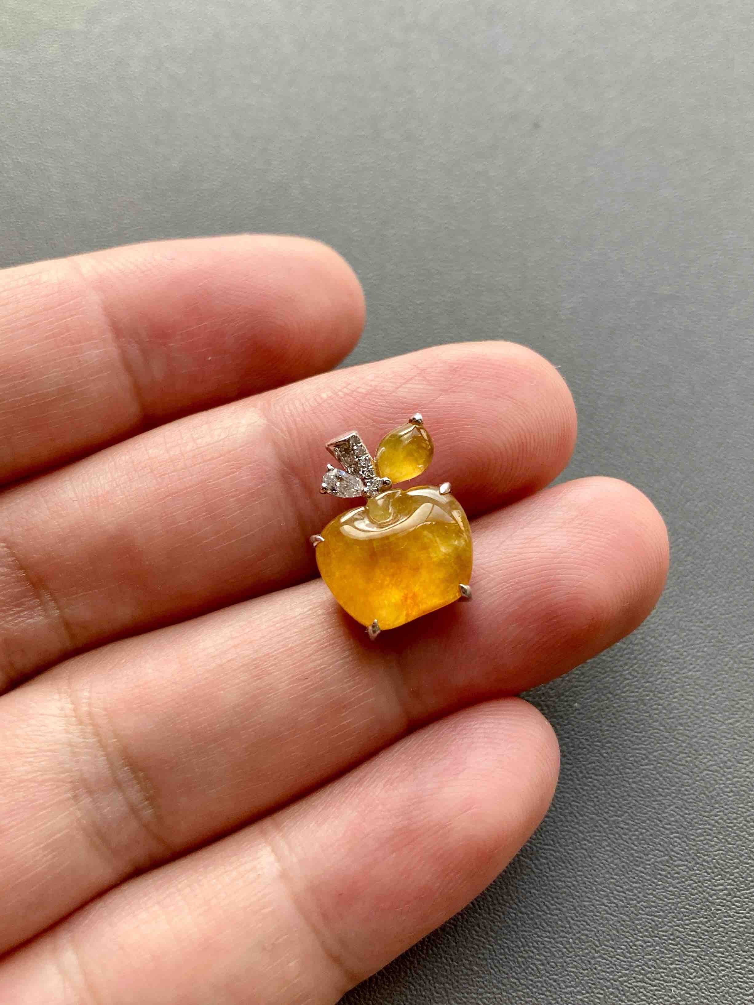 稀世金苹果,高冰种黄翡芬达色,平安果,缅甸料,种水晶莹剔透,荧光四射,无论是从颜色还是款式都是罕有的珍品,实在太特别了,连配石叶子也是同料黄翡,18k白金钻石镶嵌后开盖,推荐收藏,苹果11.7×9.6×2mm,镶嵌后15.5×11.7×6.5mm