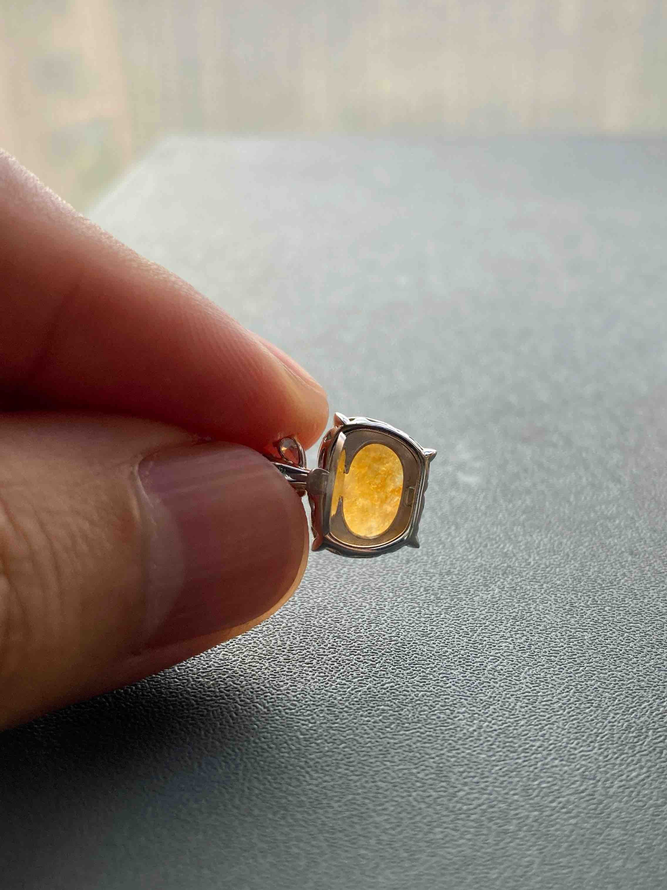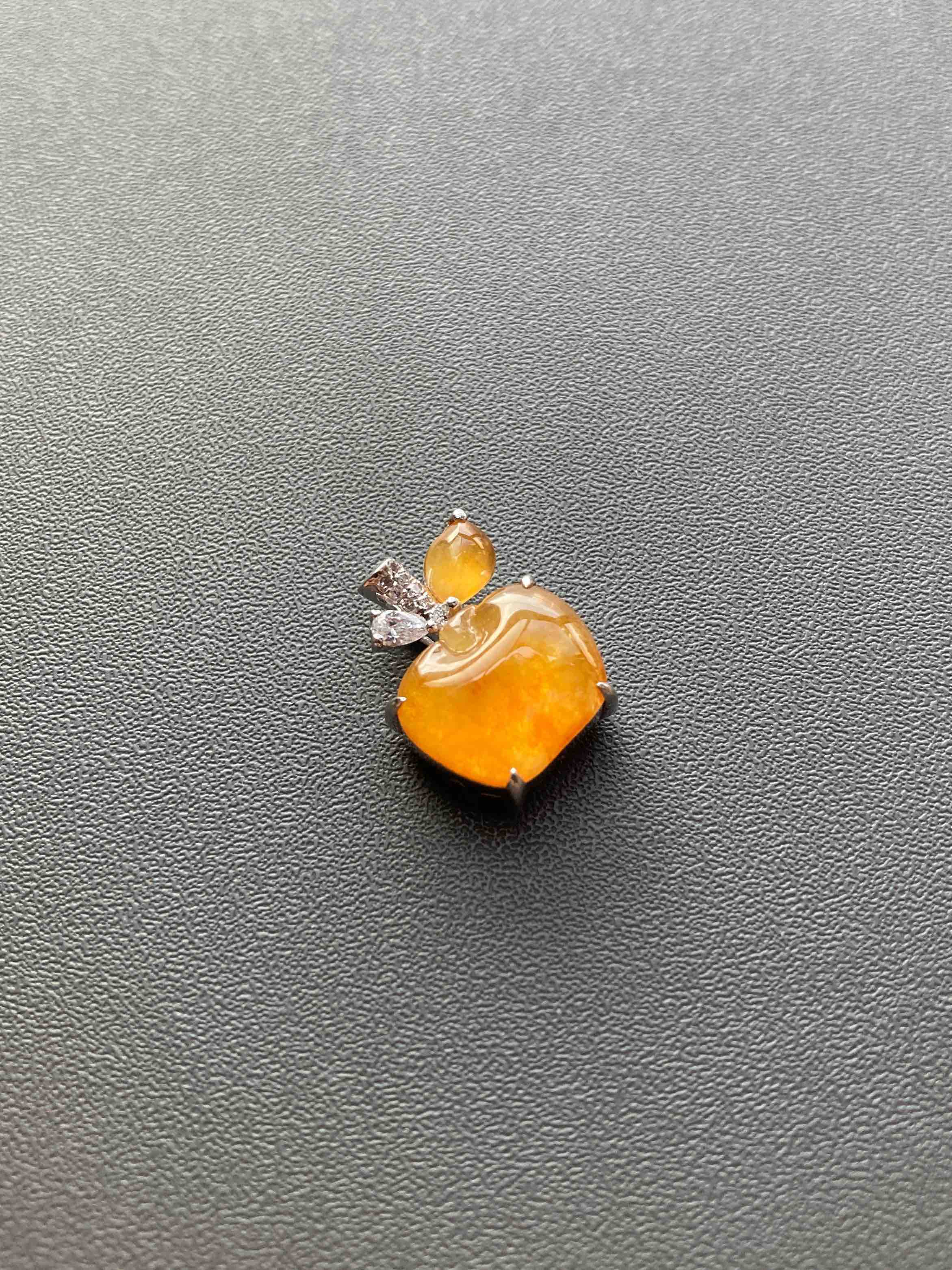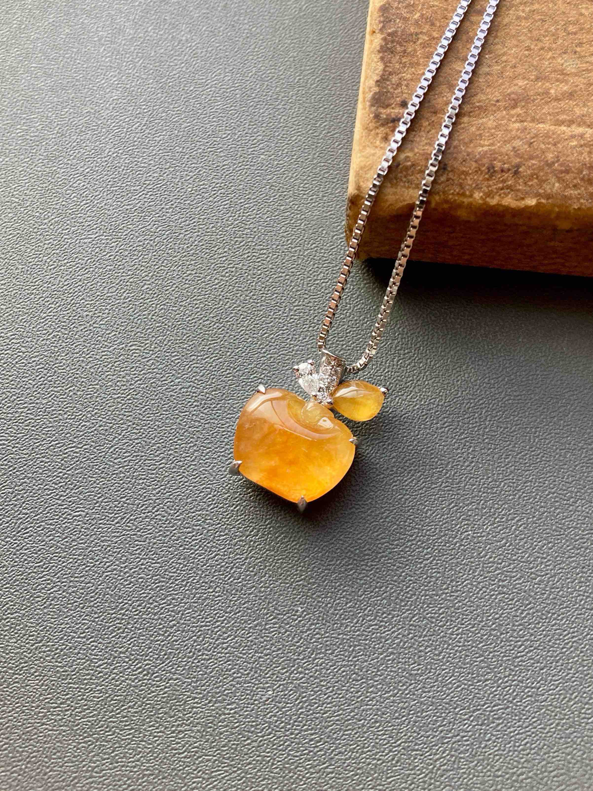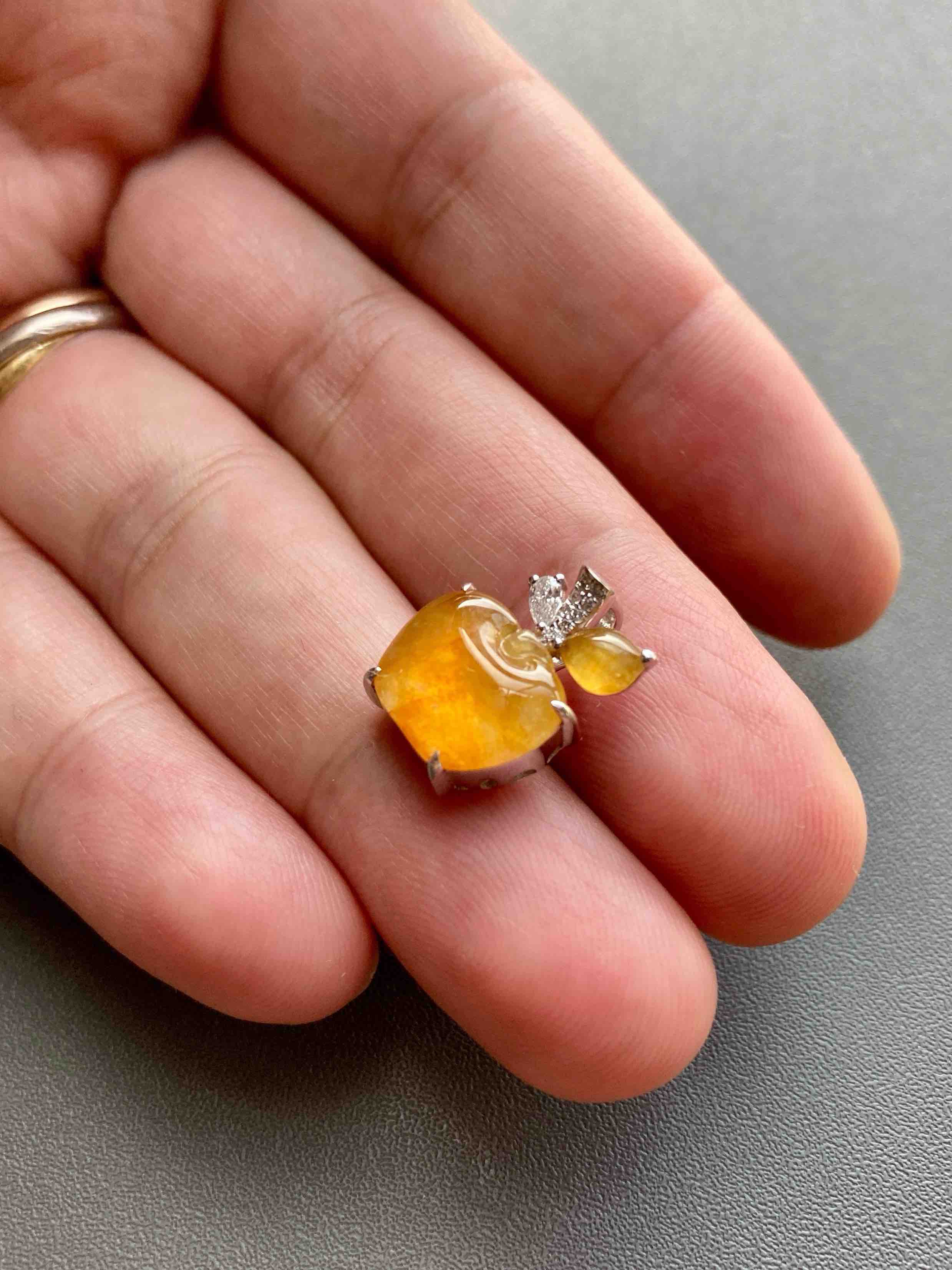 稀世金苹果,高冰种黄翡芬达色,平安果,缅甸料,种水晶莹剔透,荧光四射,无论是从颜色还是款式都是罕有的珍品,实在太特别了,连配石叶子也是同料黄翡,18k白金钻石镶嵌后开盖,推荐收藏,苹果11.7×9.6×2mm,镶嵌后15.5×11.7×6.5mm