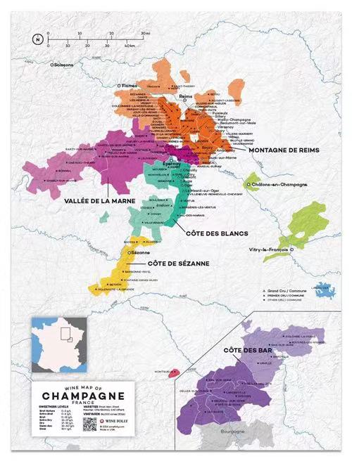 香槟地区(Champagne)在法国巴黎以东,兰斯市(Reims)周围,包括马恩省(Marne)、埃纳省(Aisne)和奥布省(Aube)的一部分区域。香地区是香槟酒的产地,根据法国法律只有香槟地区出产的香槟酒才能称为香槟酒。是法国最北的一个葡萄酒产区,气候寒冷。但寒冷的天气却赋予了香槟酒别样的清新之感。典型的白平士壤也贡献良多,可以很好地保留水分,同时白色还会有反光的效果,能够提高葡萄的成熟度。寒冷的天气、白平土壤让霞多丽黑皮诺 (Pinot Noir) 和皮诺(Chardonnay) 、莫尼耶 (Pinot Meunier) 在这里大放异彩成为酿制香槟的葡萄品种