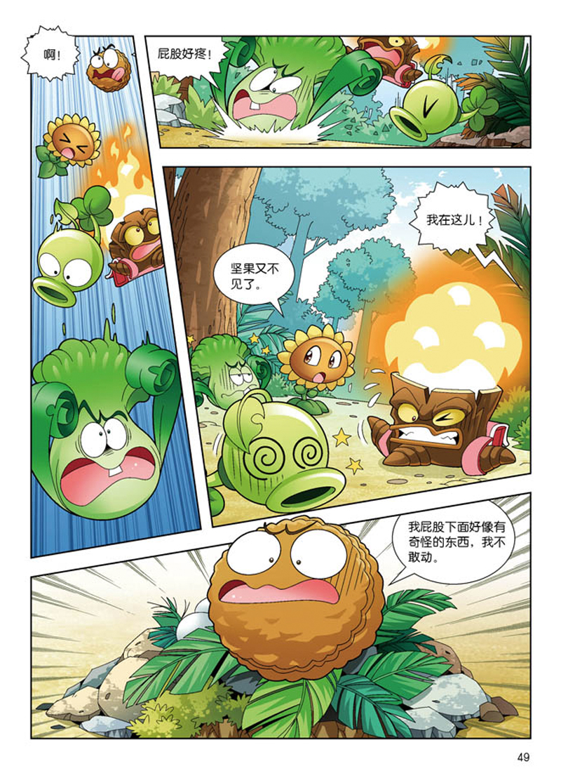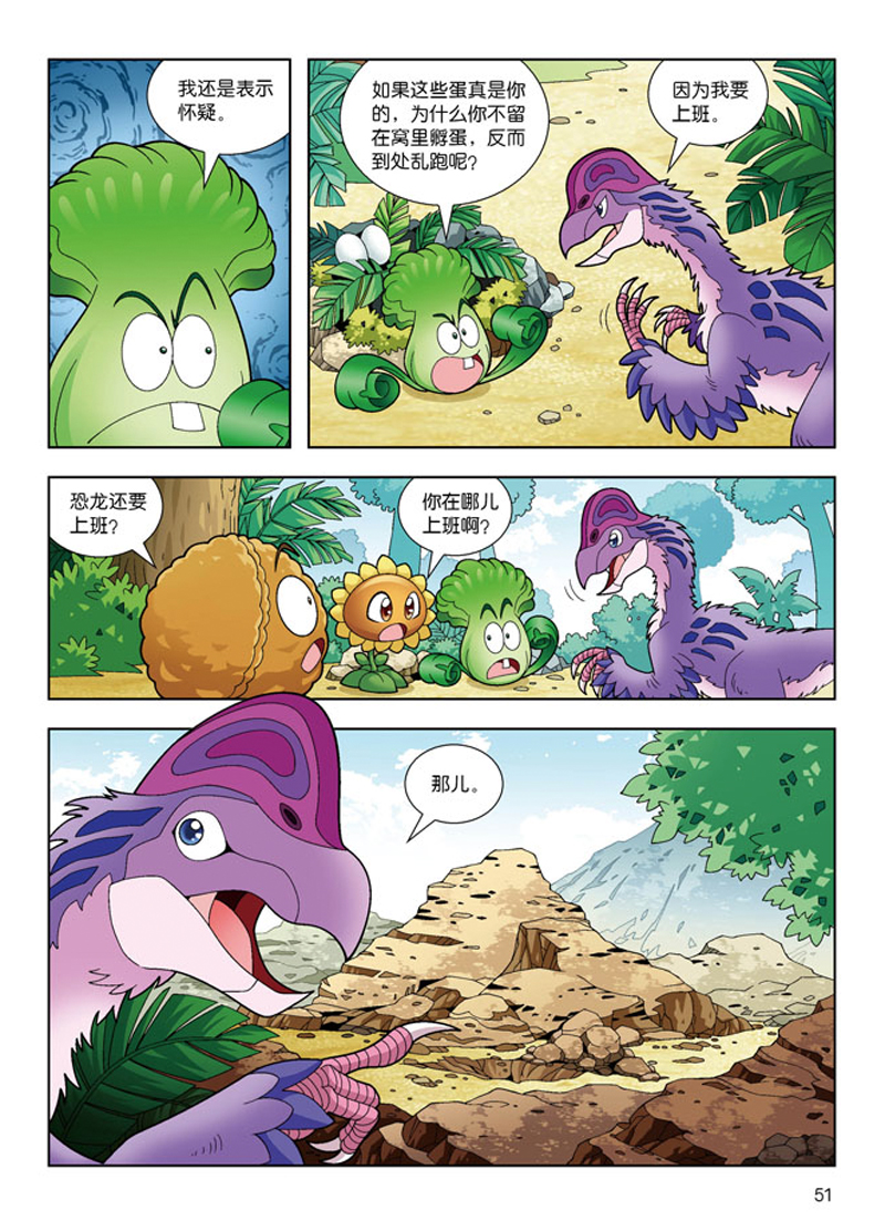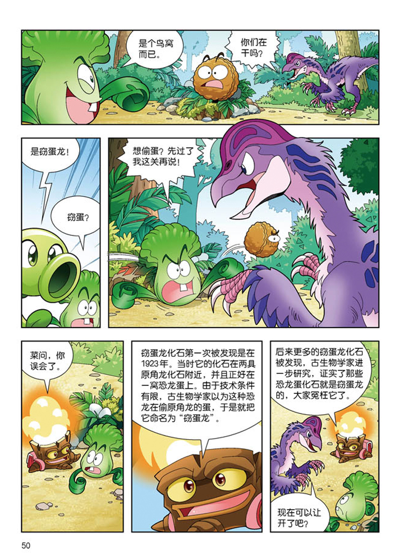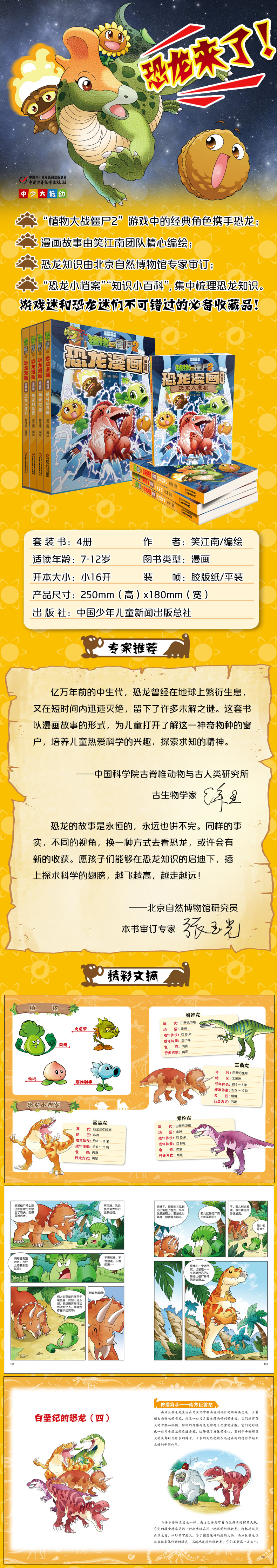“植物大战僵尸2恐龙漫画第四辑”包含“植物大战僵尸2恐龙漫画”系列图书中的13-16册,按照时间顺序创作,涵盖了侏罗纪晚期到白垩纪晚期的大部分恐龙,将植物大战僵尸2游戏中的经典角色豌豆射手、菜问、坚果、红针花等带到遥远的中生代,与恐龙这一神奇生物联手,在一个个充满冒险与欢乐的漫画故事中,为小读者打开了解恐龙的一扇窗。