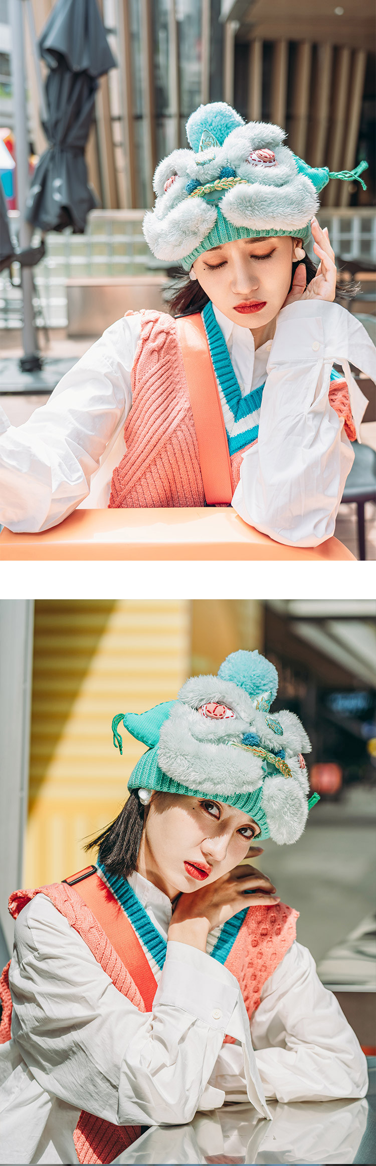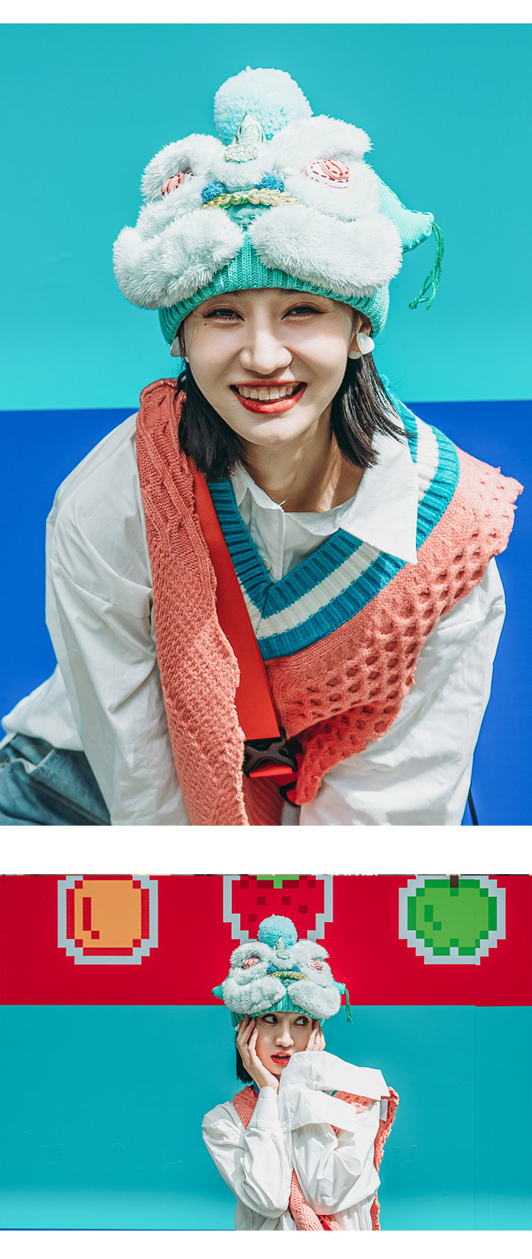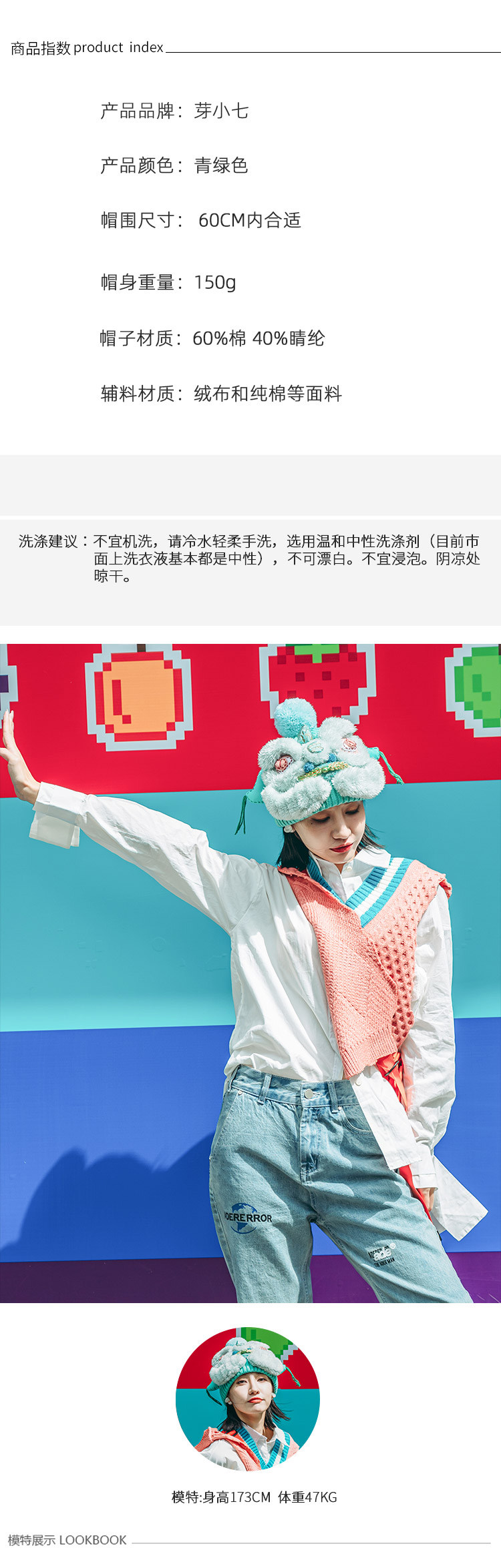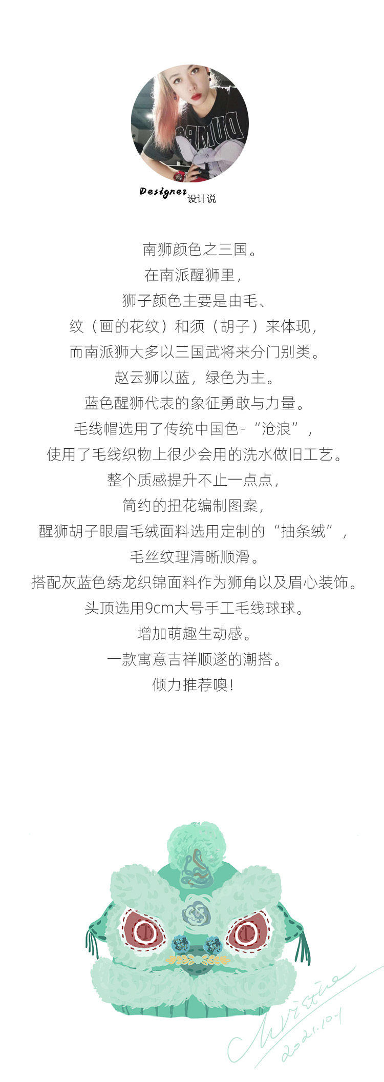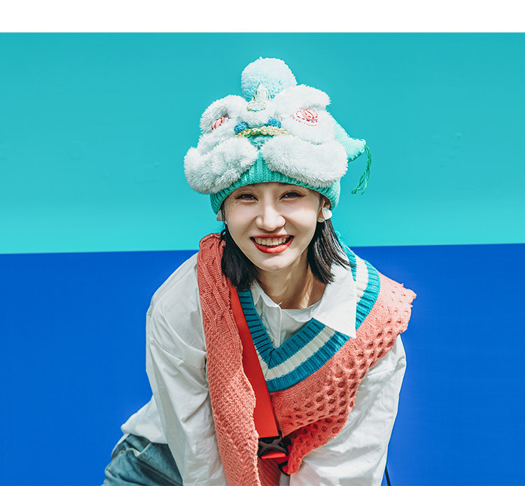 【2.10停发】芽小七原创手工国潮青色醒狮毛线帽子女秋冬百搭毛织保暖运动帽
