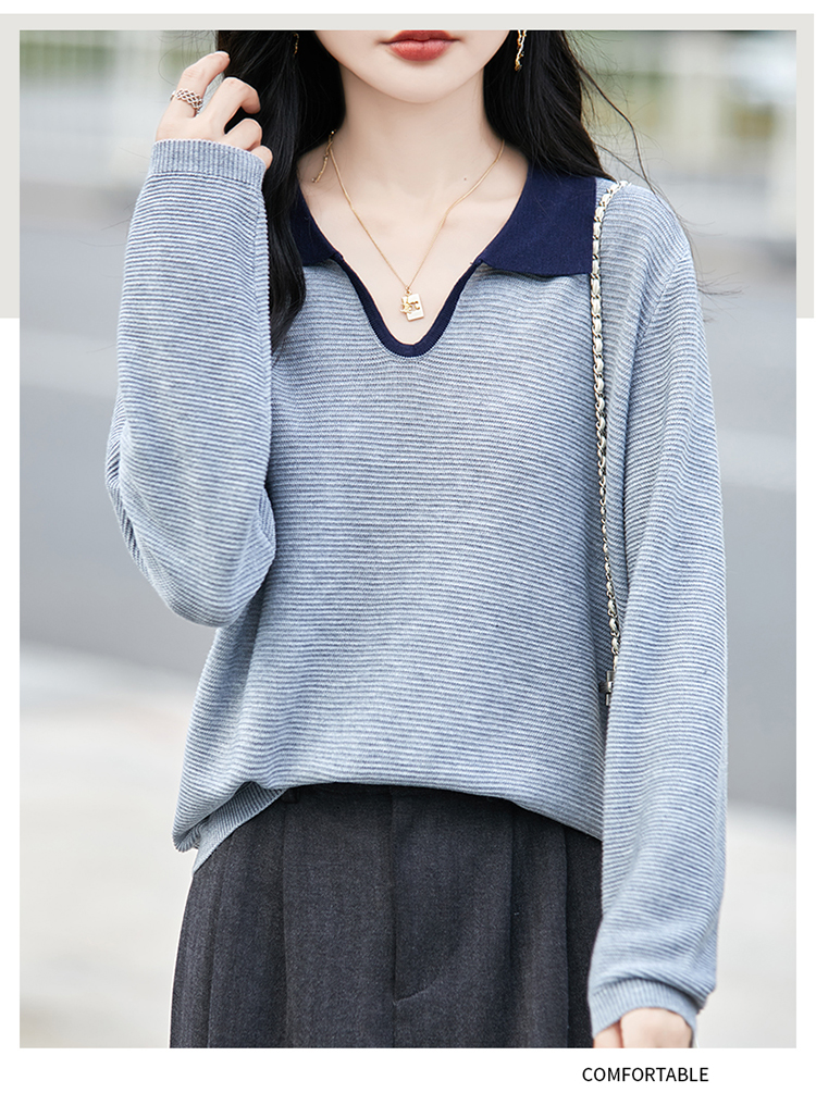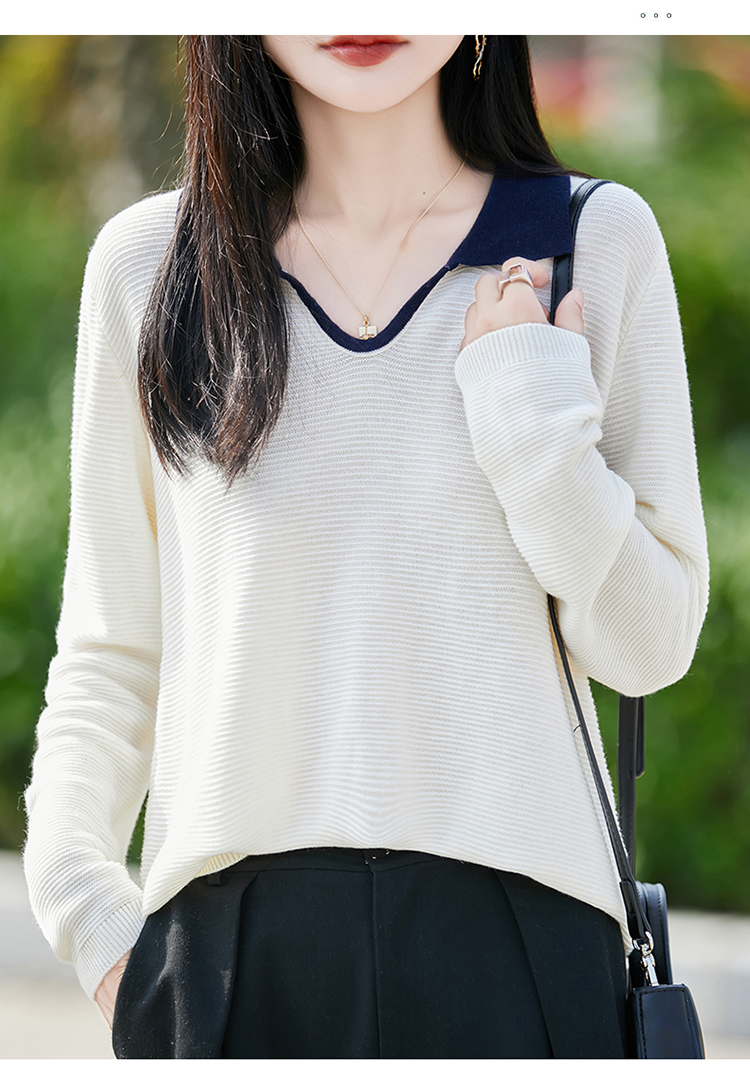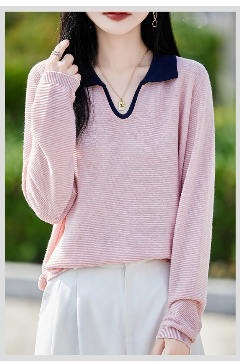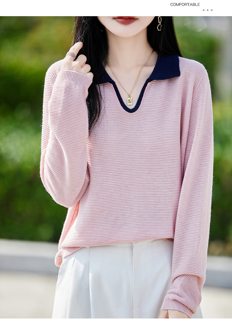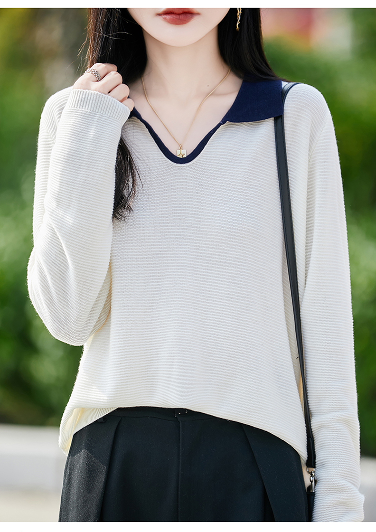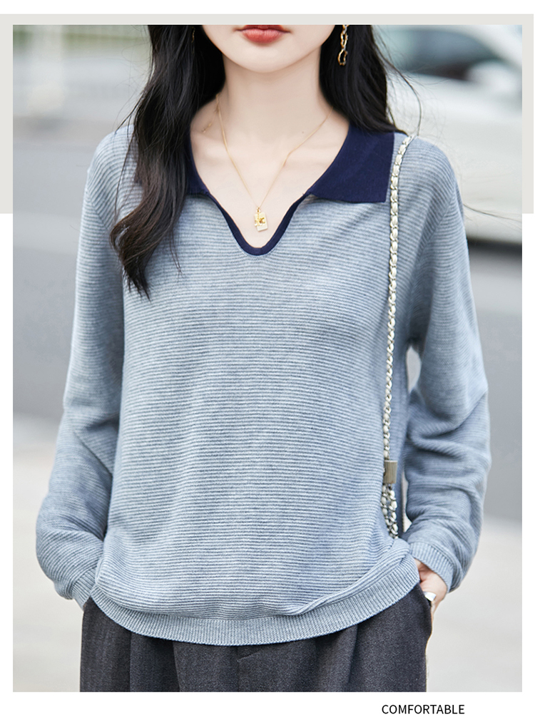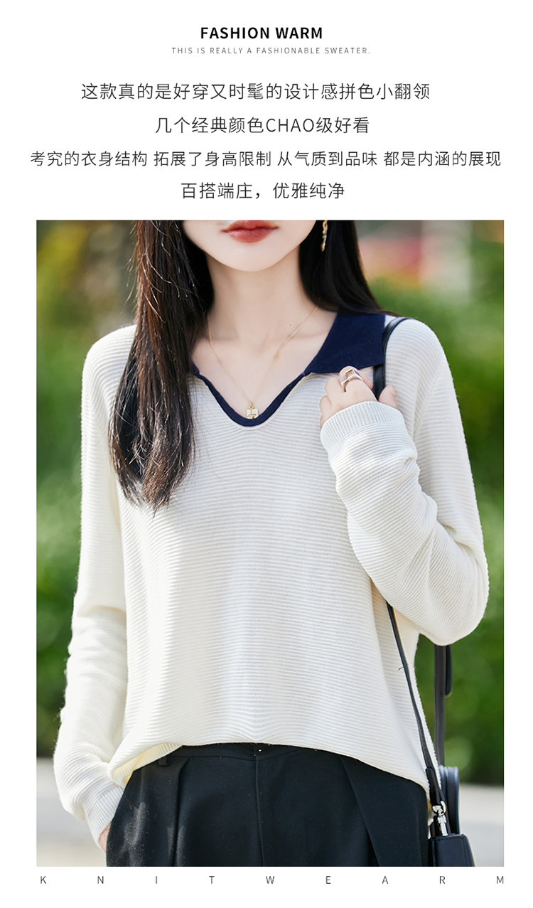 奥伊米初秋女撞色翻领羊毛薄款毛衣拼色长袖针织衫JR784 商品图0