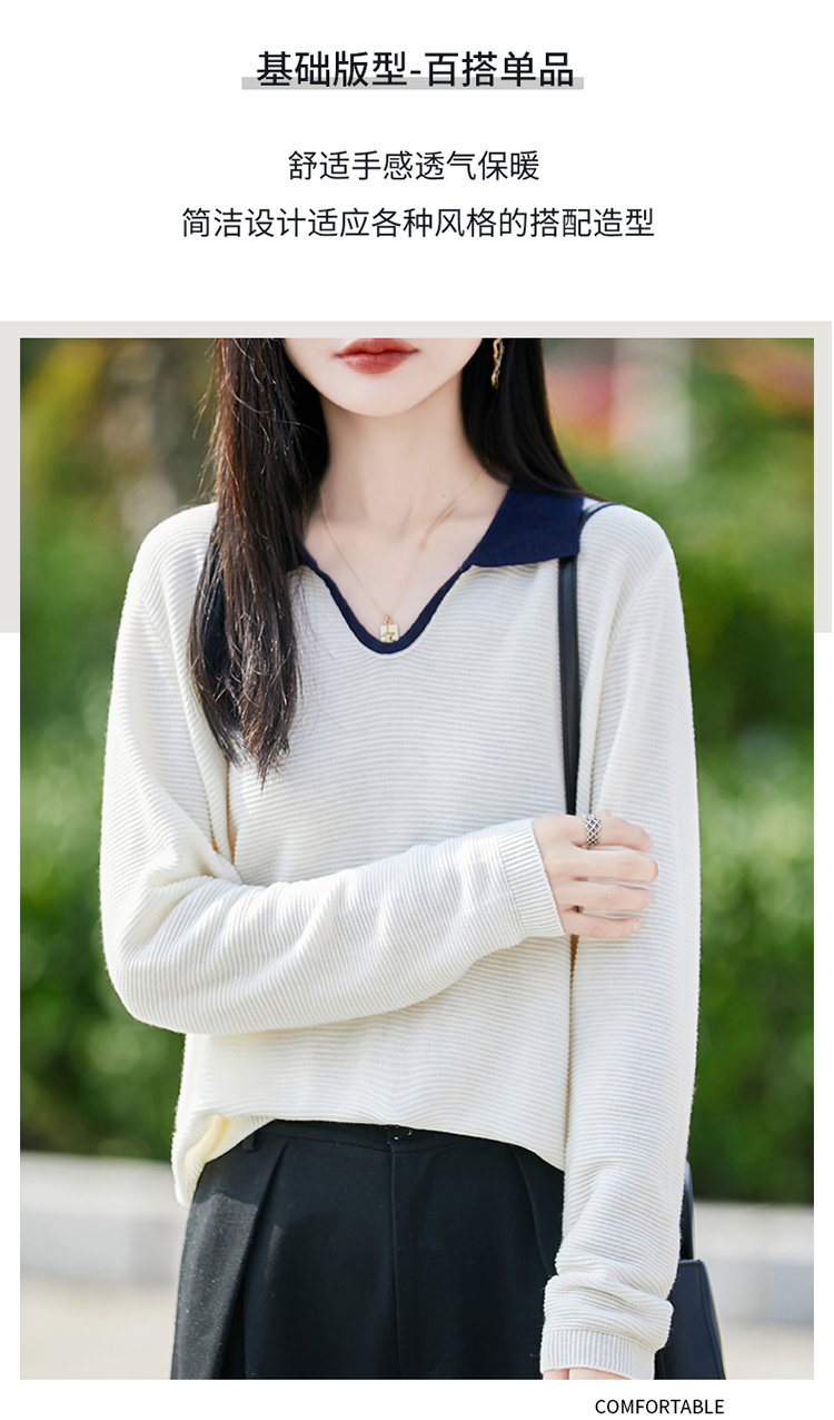 奥伊米初秋女撞色翻领羊毛薄款毛衣拼色长袖针织衫JR784 商品图3