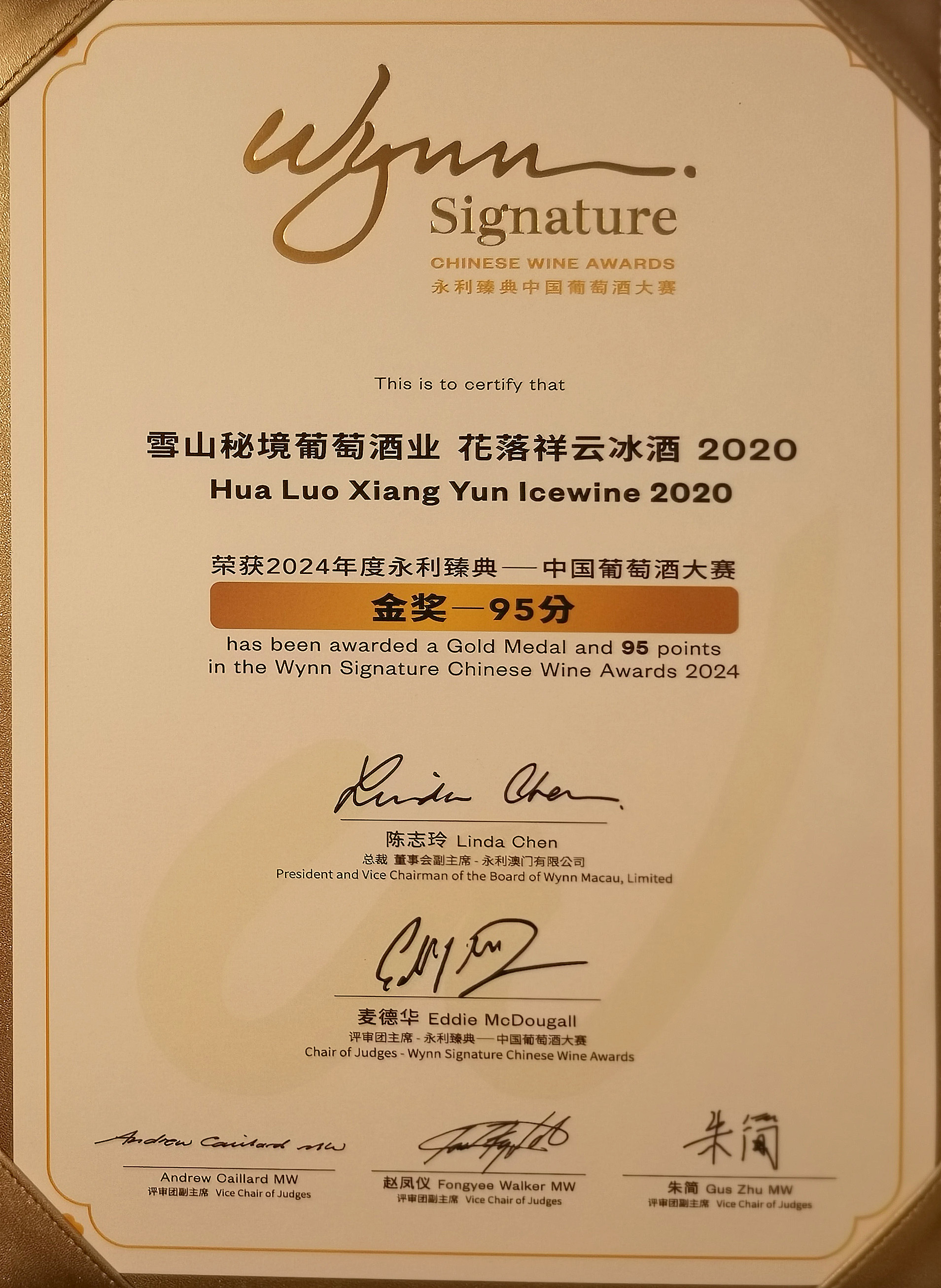 永利臻典中国葡萄酒大赛金奖((冰酒)等奖项。