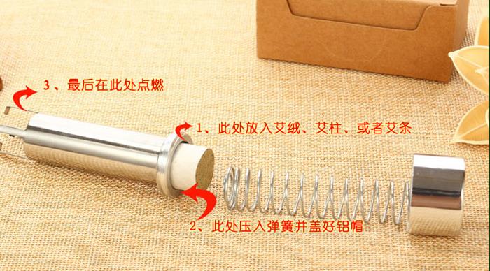 一:将艾绒或长度不超过7厘米的艾条放入不锈钢管内,把弹簧压在艾条上用铝盖拧上盖好,再从底部点燃。(使用艾绒时,需用手握住钢管开口处挡住艾绒漏出)