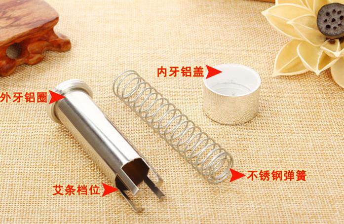三:使用完后,拧开铝盖,取出弹簧,如需清洗时,建议将送艾器放入高温水中煮3分钟,趁热取出用擦布擦拭,擦拭干净后光亮如新,不生锈。