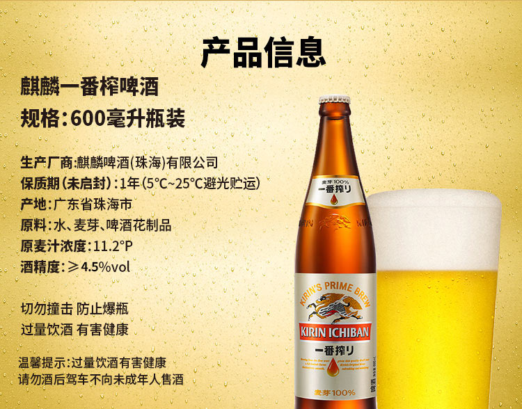 KIRIN/麒麟啤酒一番榨日式啤酒 4.5%VOL 600ml*12瓶