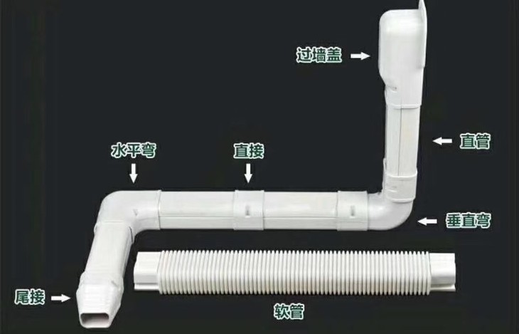 整套:内含1M直管2根、2个直接、1只过墙盖、1只水平弯、一根软管、1只尾接、1个垂直弯、1只墙洞盖)1.5-3匹通用性