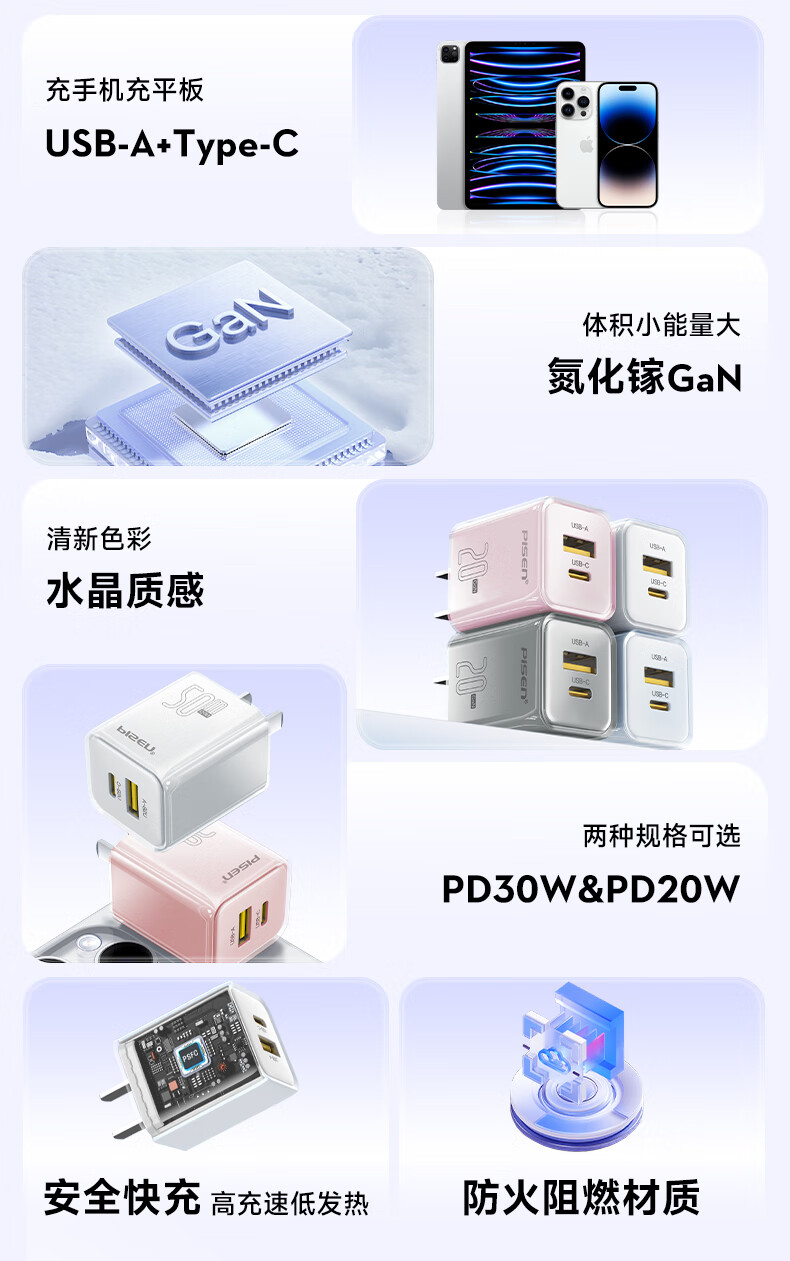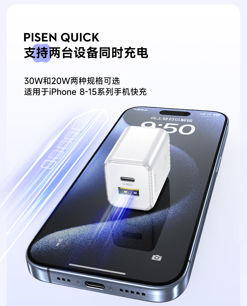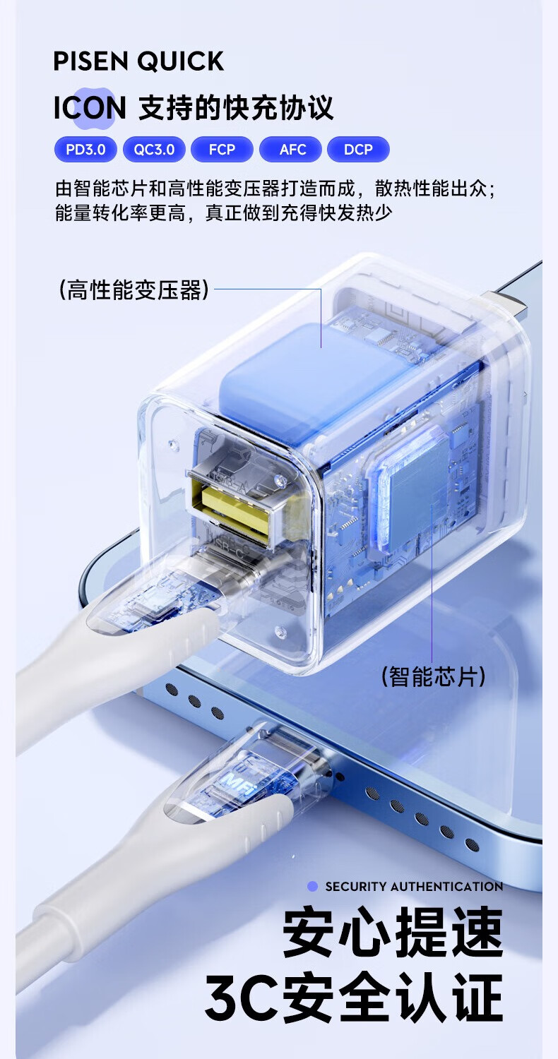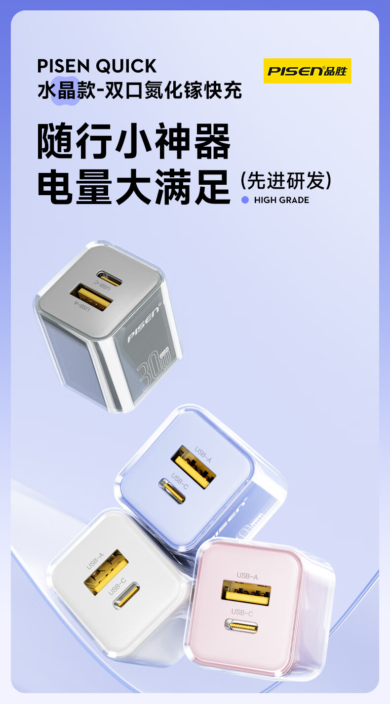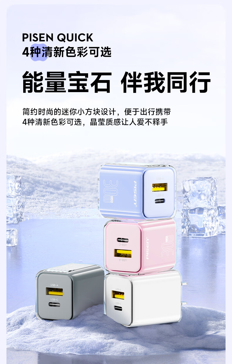 品胜 30W氮化镓水晶款苹果15充电器兼容PD20W/30W适用ipad平板Type-C数据线手机快充头iPhone15/16快充套装