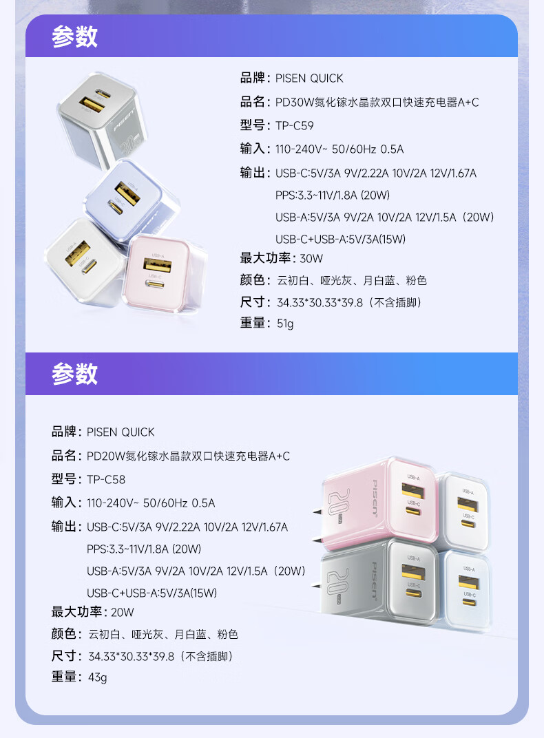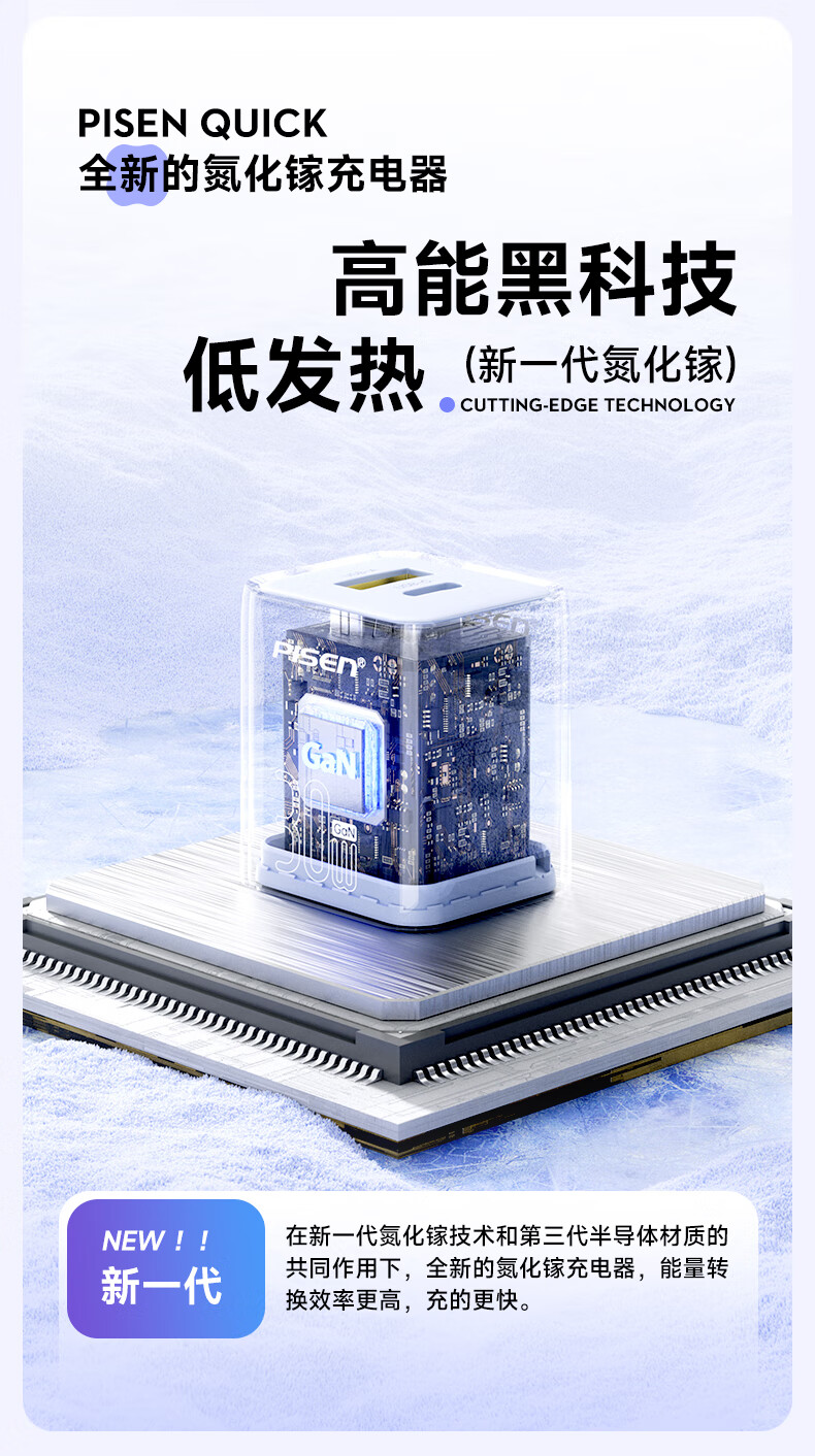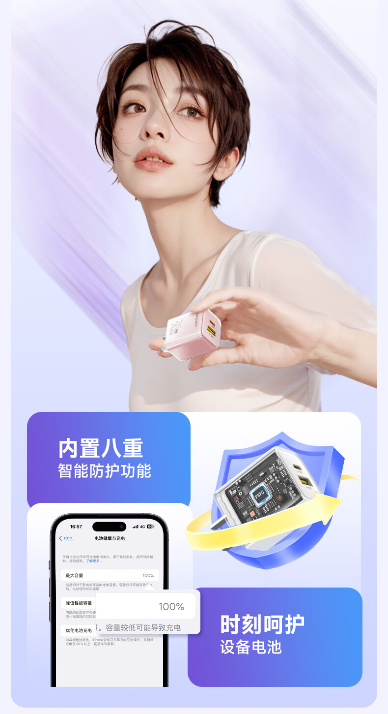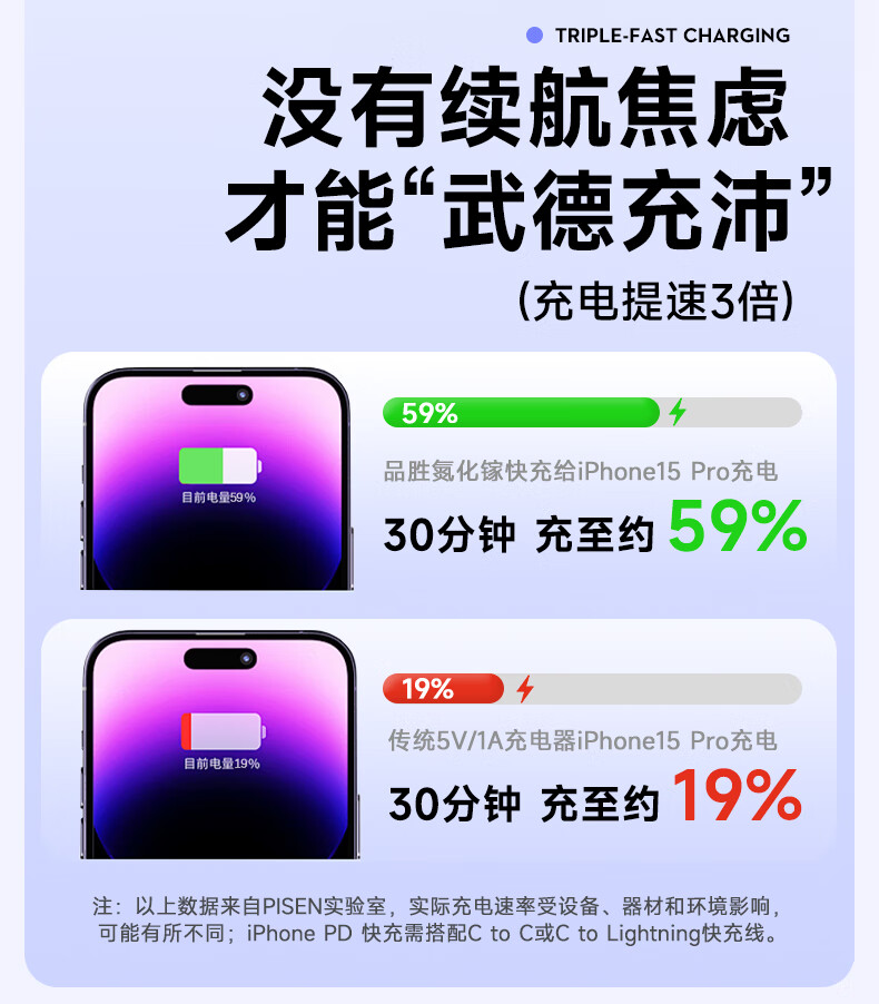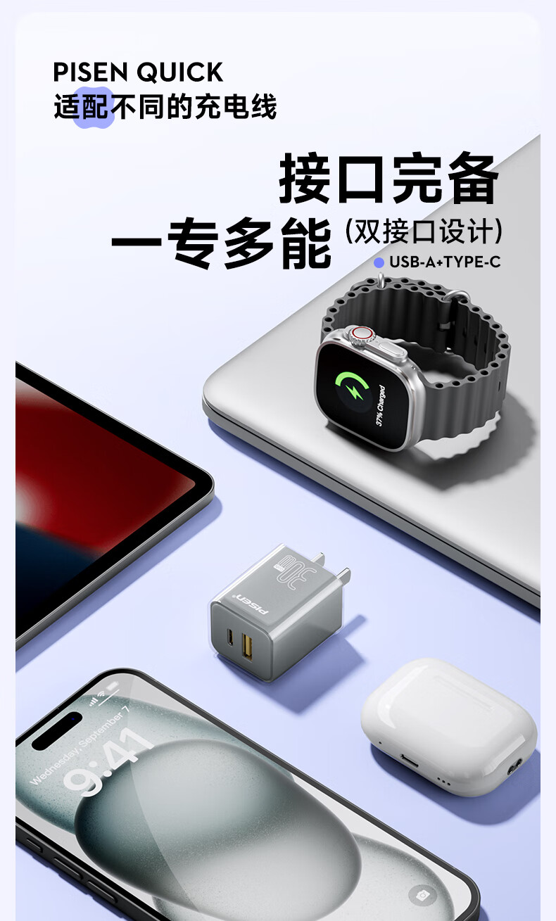 品胜 30W氮化镓水晶款苹果15充电器兼容PD20W/30W适用ipad平板Type-C数据线手机快充头iPhone15/16快充套装