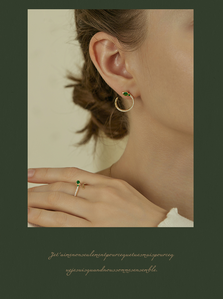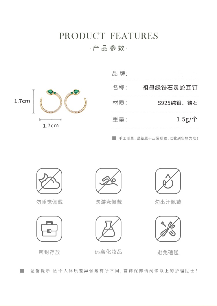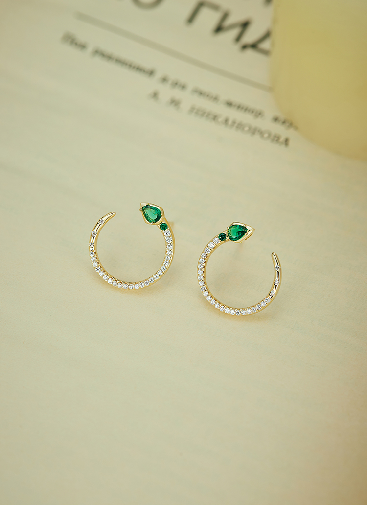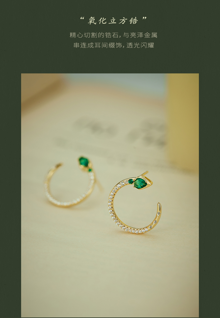 Oflye潮流饰品 祖母绿灵蛇S925纯银耳钉女新款高级感轻奢微镶钻蛇形设计气质耳环