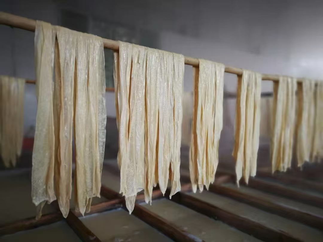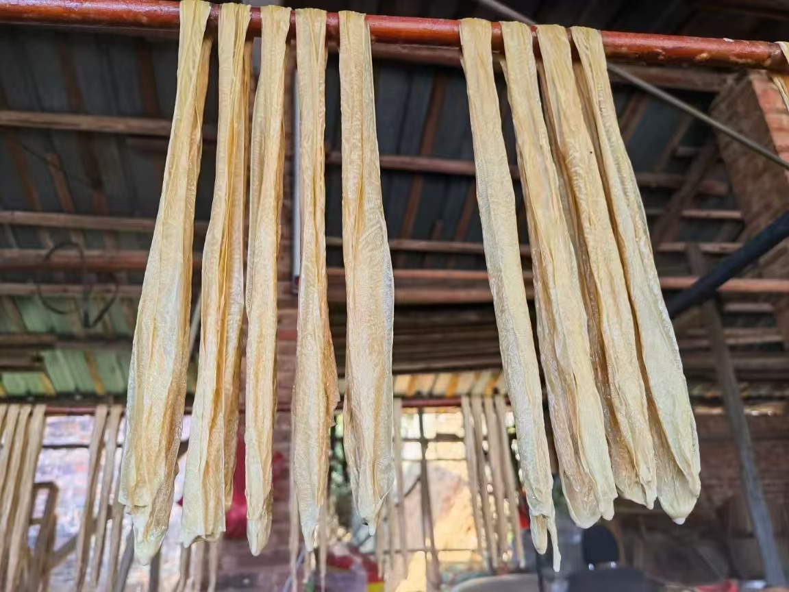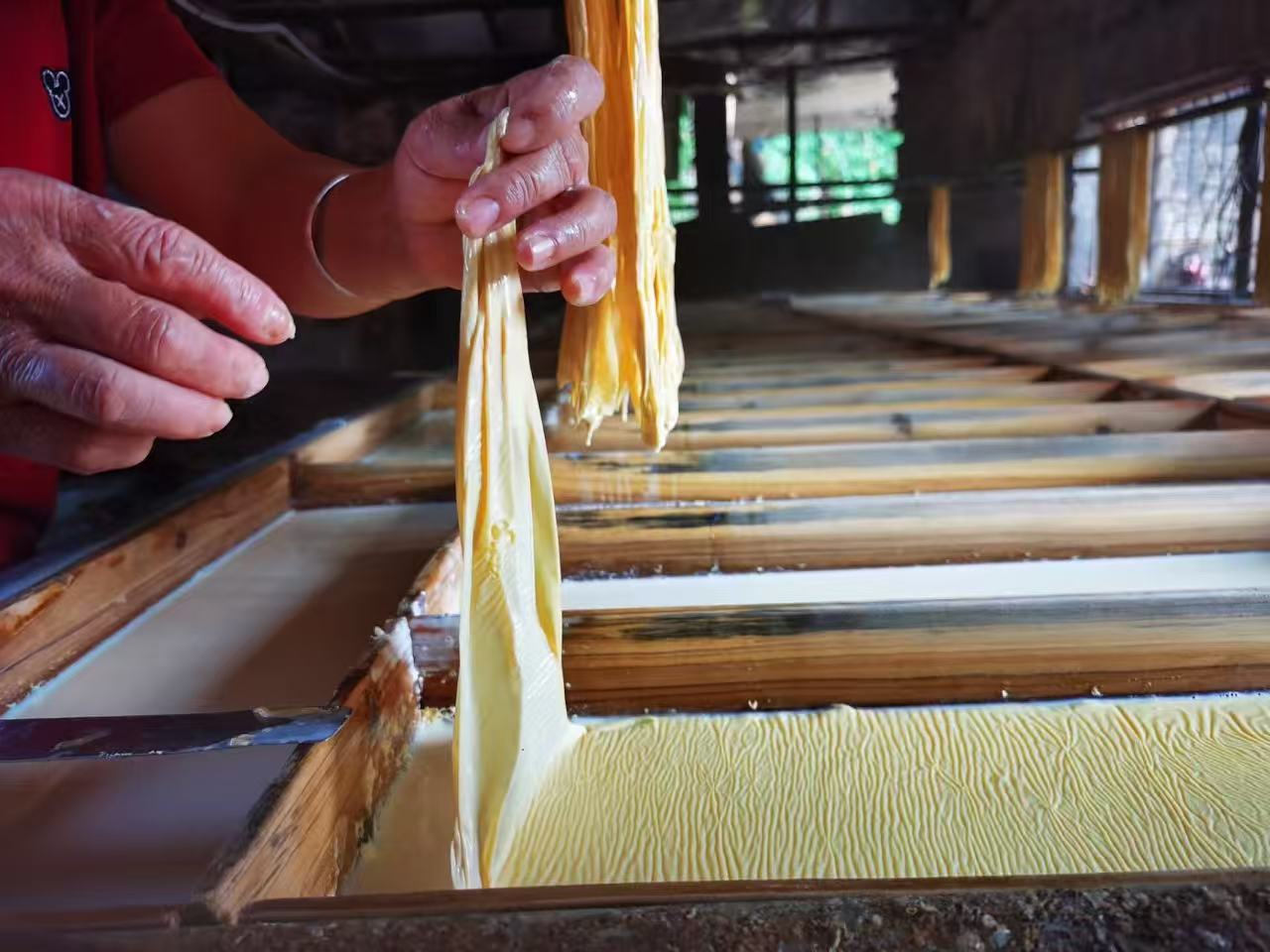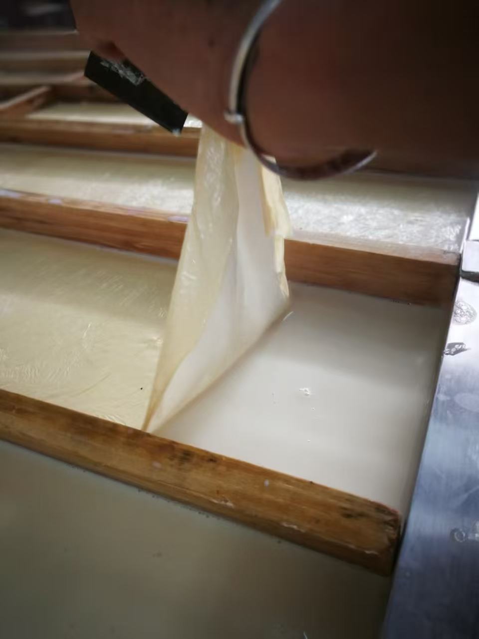 秉承优良的传统手工制作工艺,传统手工精制流程为:黄豆去皮、浸泡、磨浆、过滤、煮浆、成膜、揭皮、晾干、熬浆、上浆、摊凉晒等多道复杂工序。