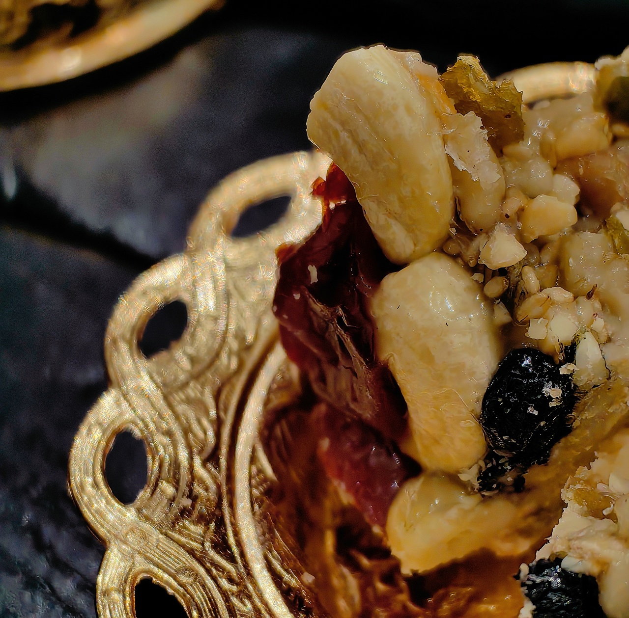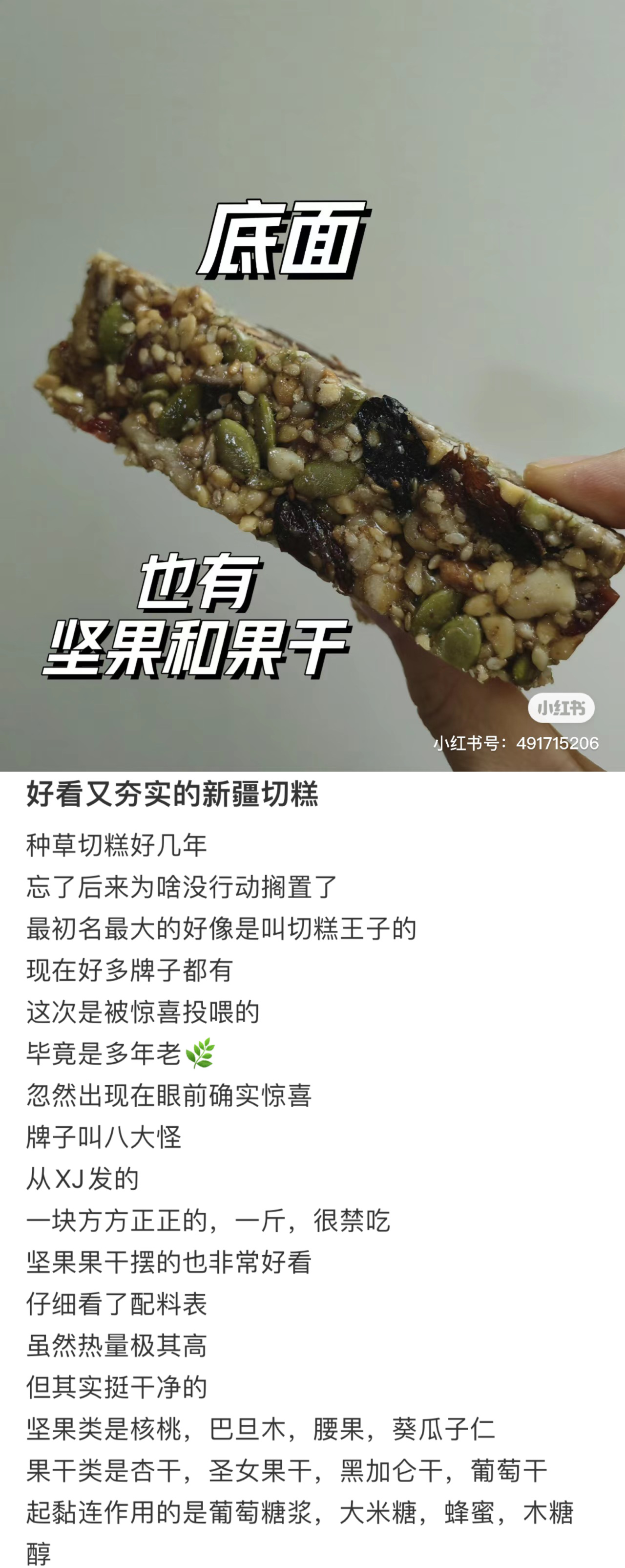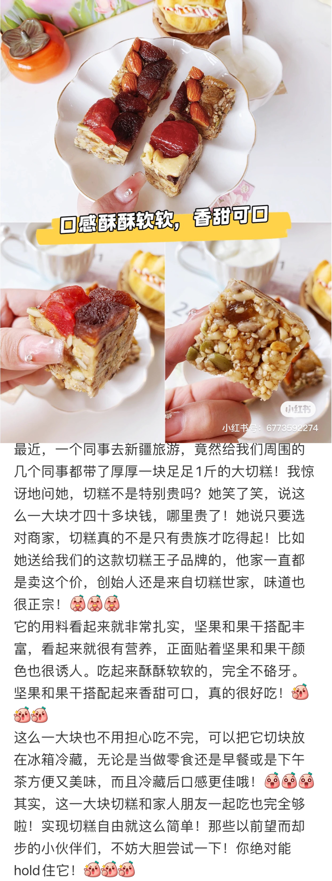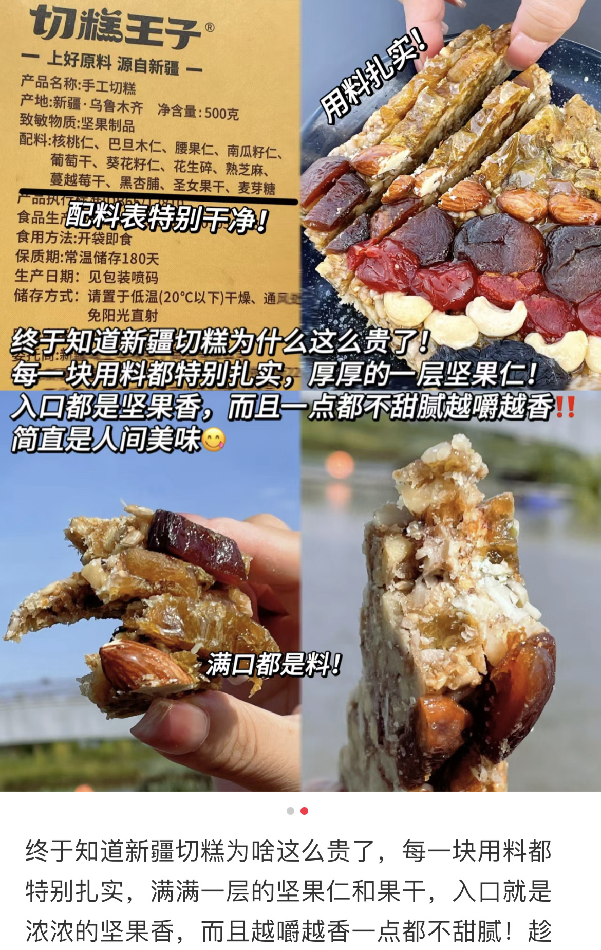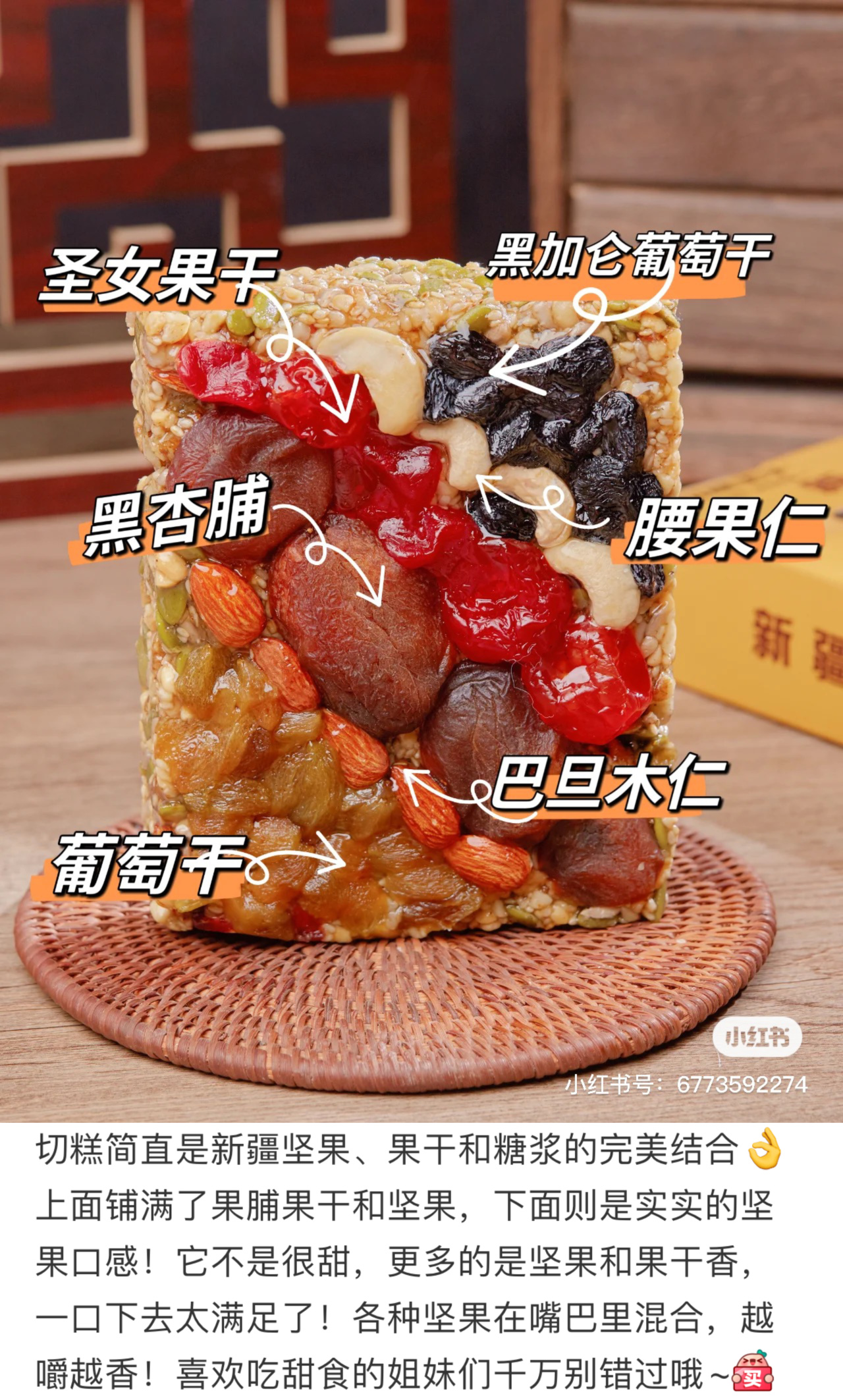 来上一下曾经的街头小吃刺客--切糕,本名叫玛仁糖,是新疆维吾尔族的一种传统小吃,最早诞生时,是在丝绸之路时可以长期保存的干粮,不仅能填饱肚子,还含有丰富的营养物质,主打就是把各种坚果果脯塞一嘴,古早版的代餐棒!我个人觉得还不错,喜欢坚果的可以一试,比贵贵的土耳其糖可是要好吃一百倍!
