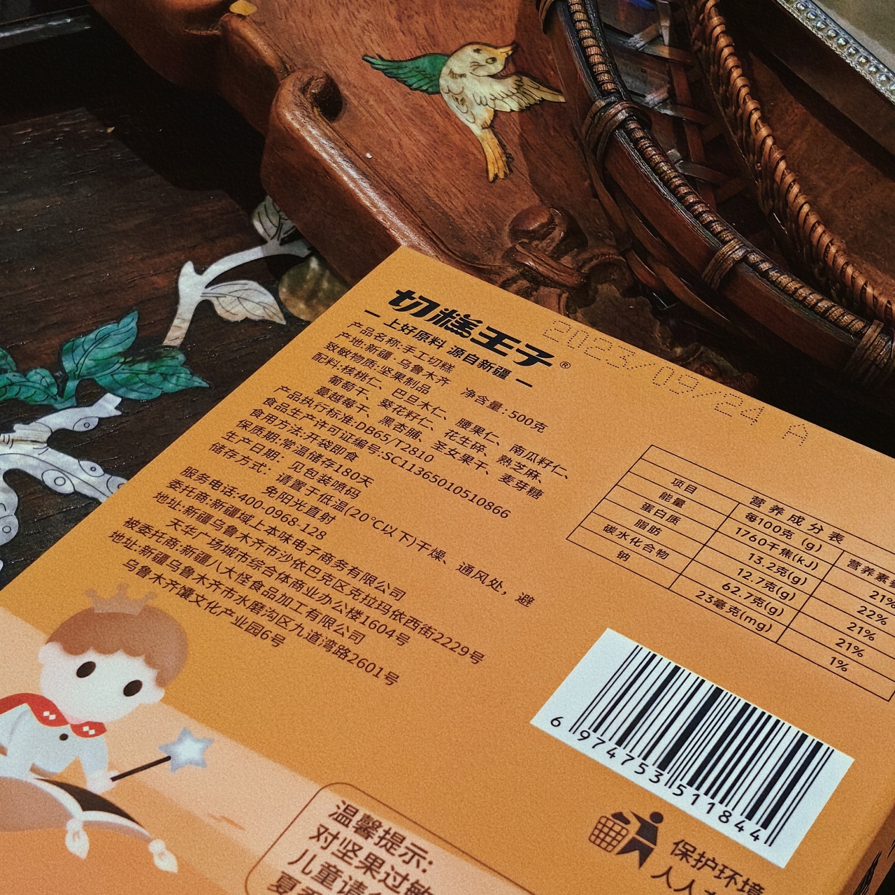 小小一盒但很沉,里面是真空包装的切糕,灰常扎实,一层铺满一层的坚果仁和果干。大家可以根据食量切下小小一块,送入口后甜中带酸,夹杂着浓浓的坚果味,越嚼越香,还超饱,一盒一斤才49.9,再也不怕被刺客啦!收到货后建议要放20度以下保存哦,也可以自己切好放保鲜袋分装,更方便!