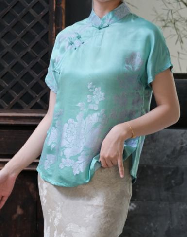 盛唐牡丹| 民国真丝老面料偏襟上衣-蓝色